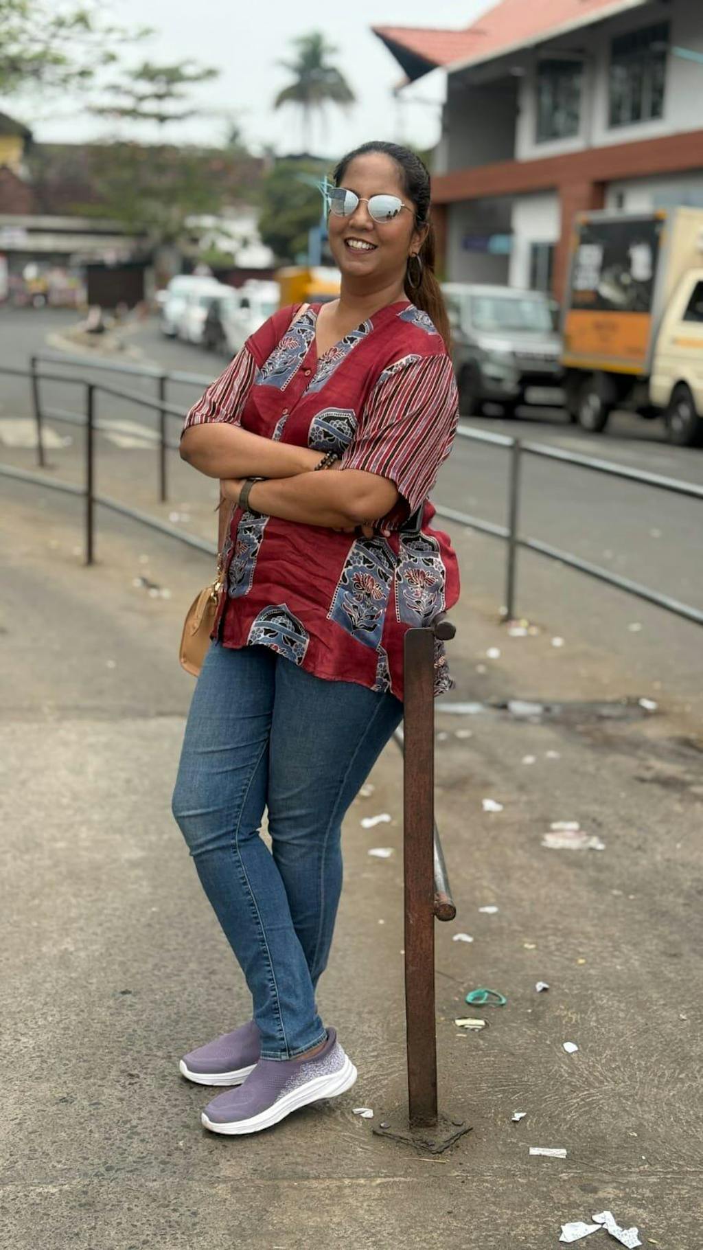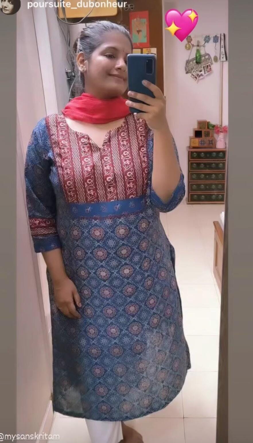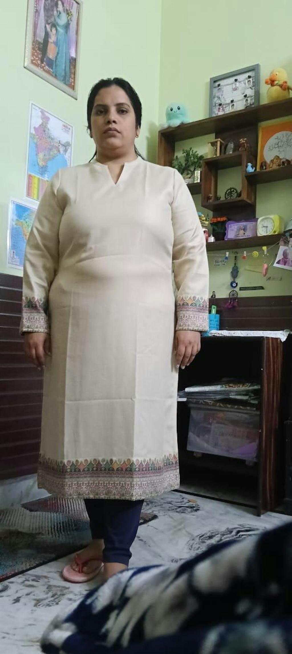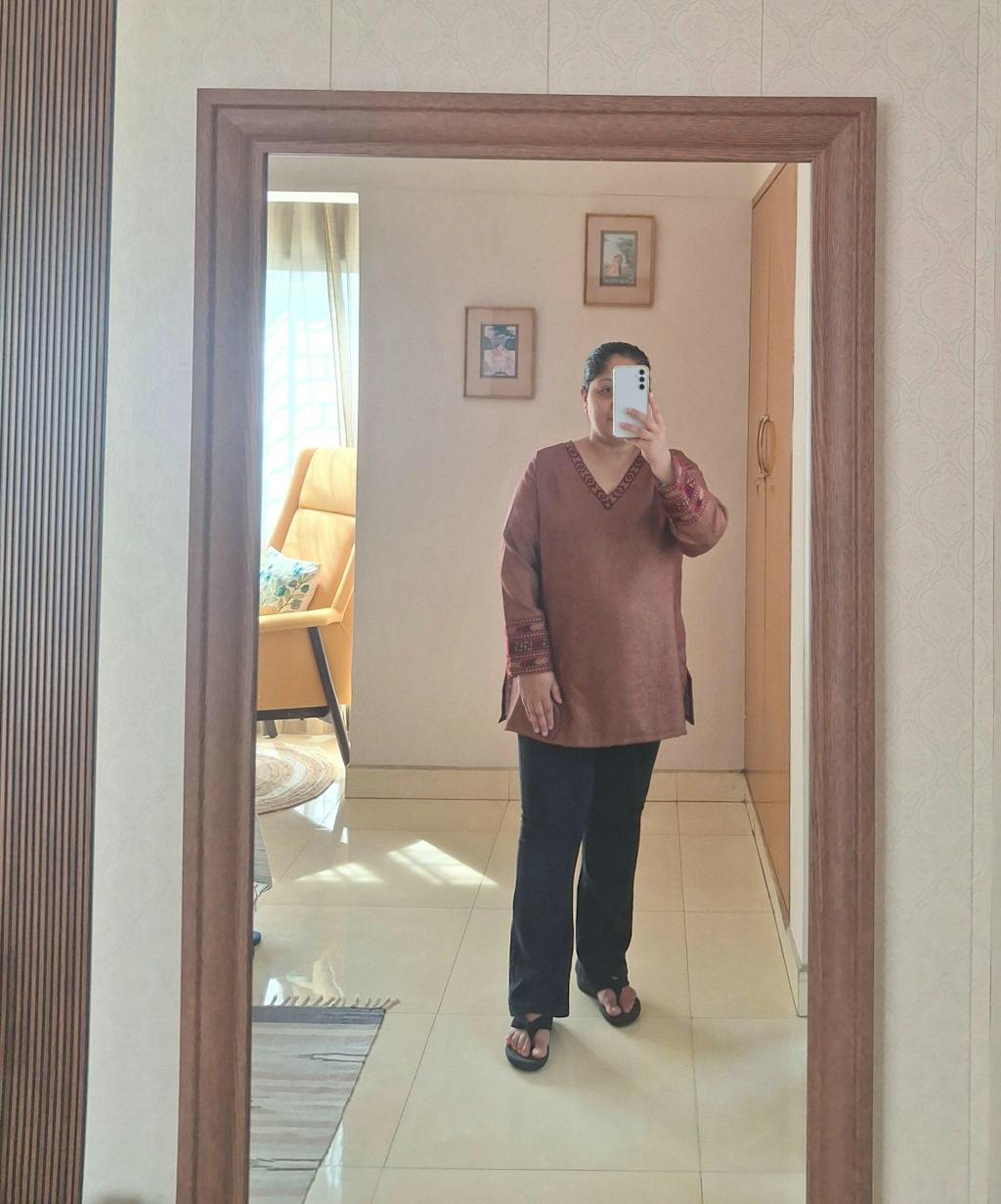 Light fabric that falls easily on the body and looks flattering. I loved the Kullu borders on the neckline and sleeves. Only suggestion I have for the team is not to call the colour 'rust'. Compared to the image shown, the colour is not bright and definitely not rust. Its more like a mustard and brown mix. Goes very well with the borders so no complaints :)