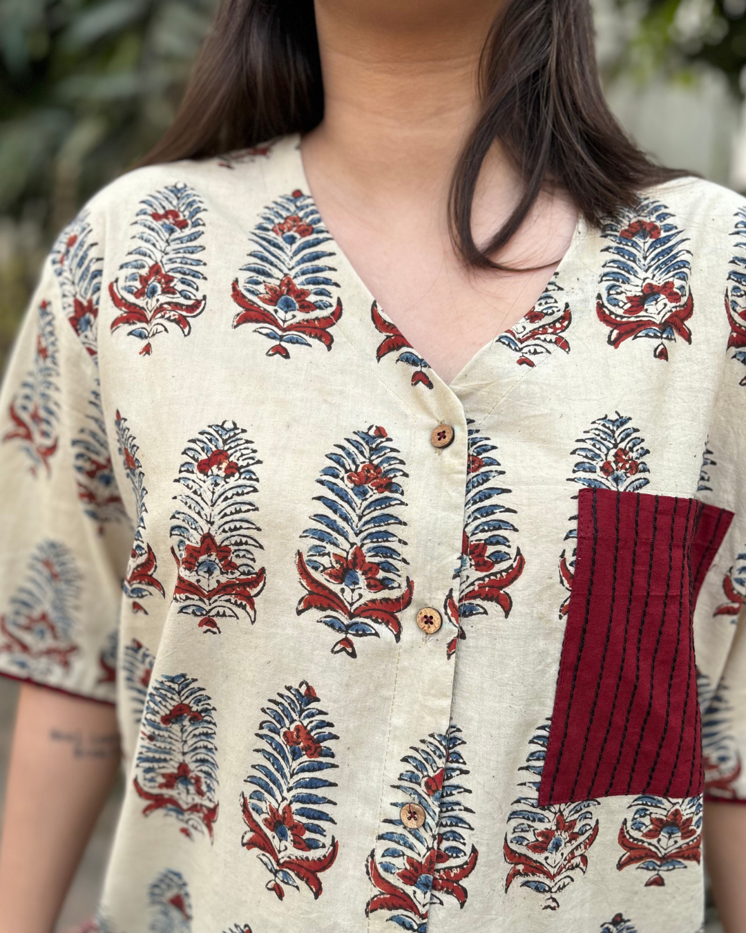 Beige handblock shirt with kantha pocket