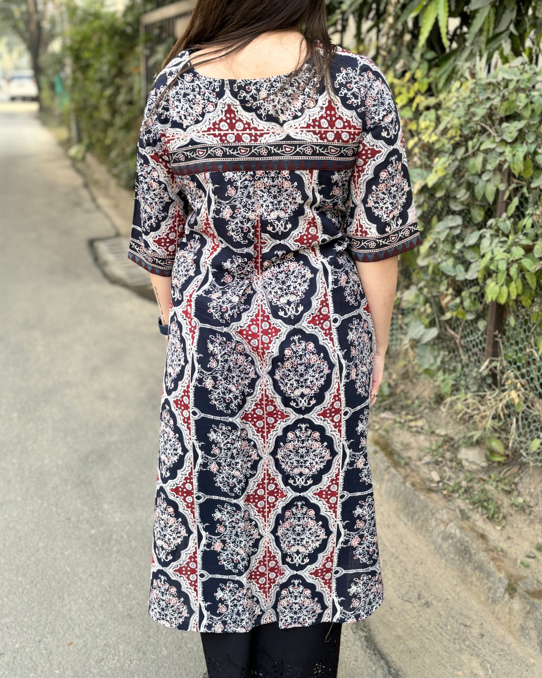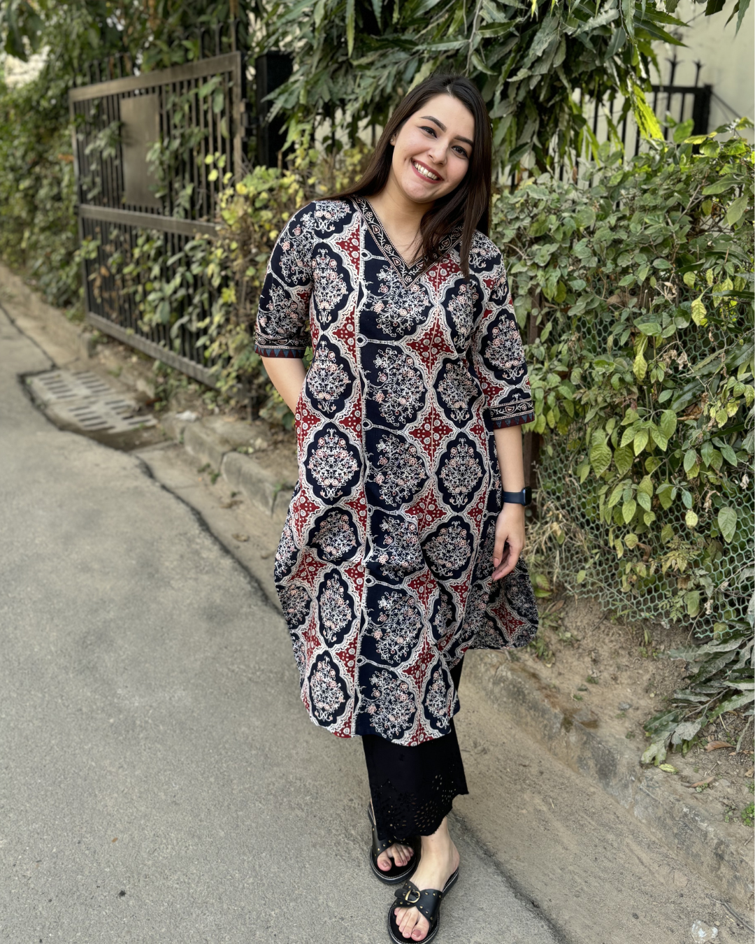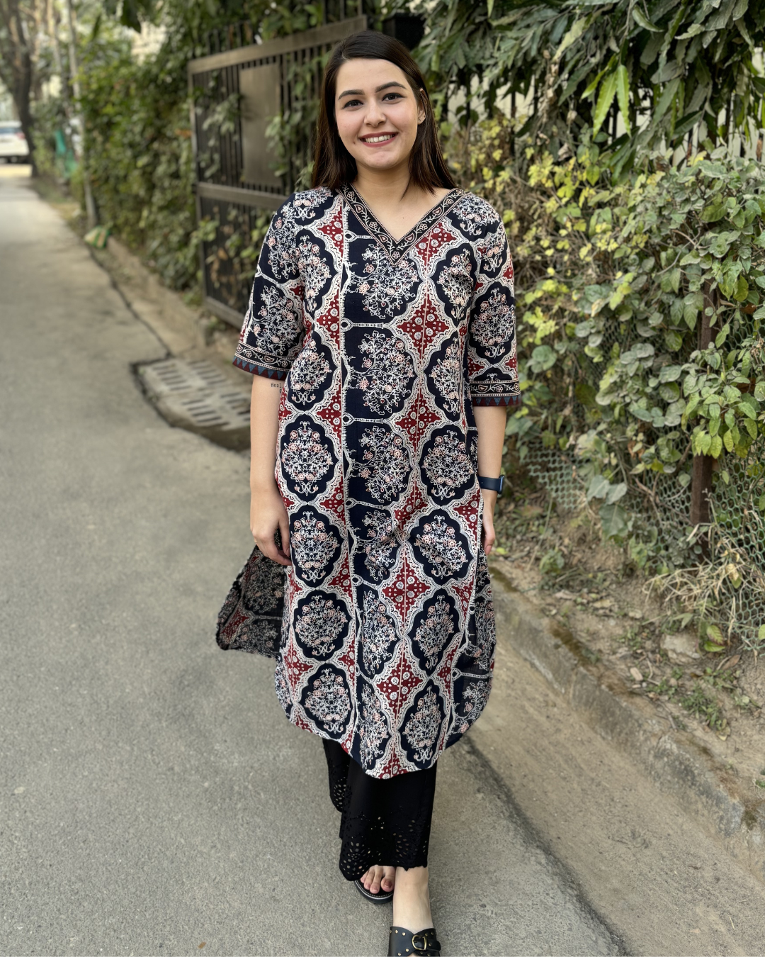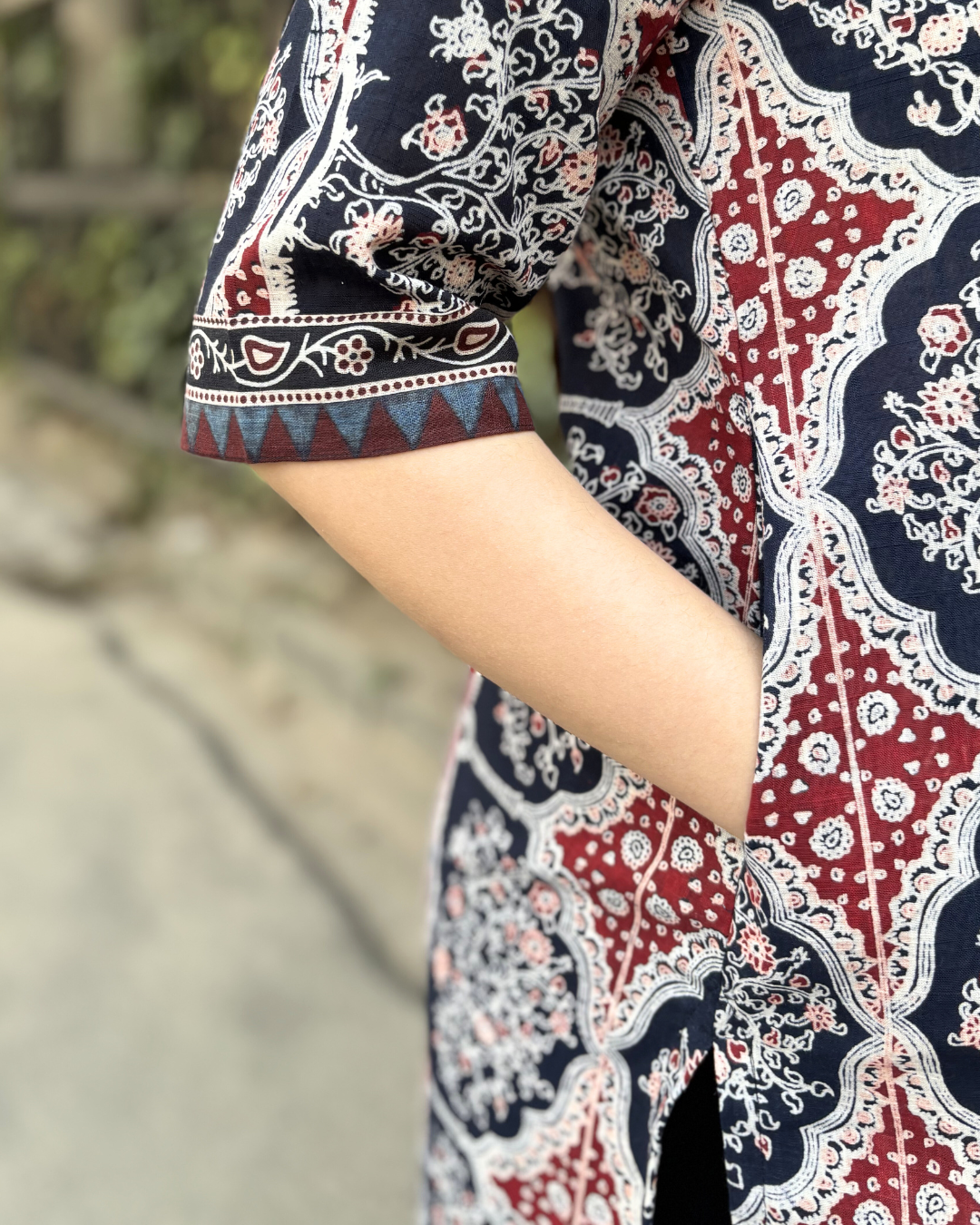Ajrakh printed kurta with a side slit , side pocket and a back pleat for maximum comfort.