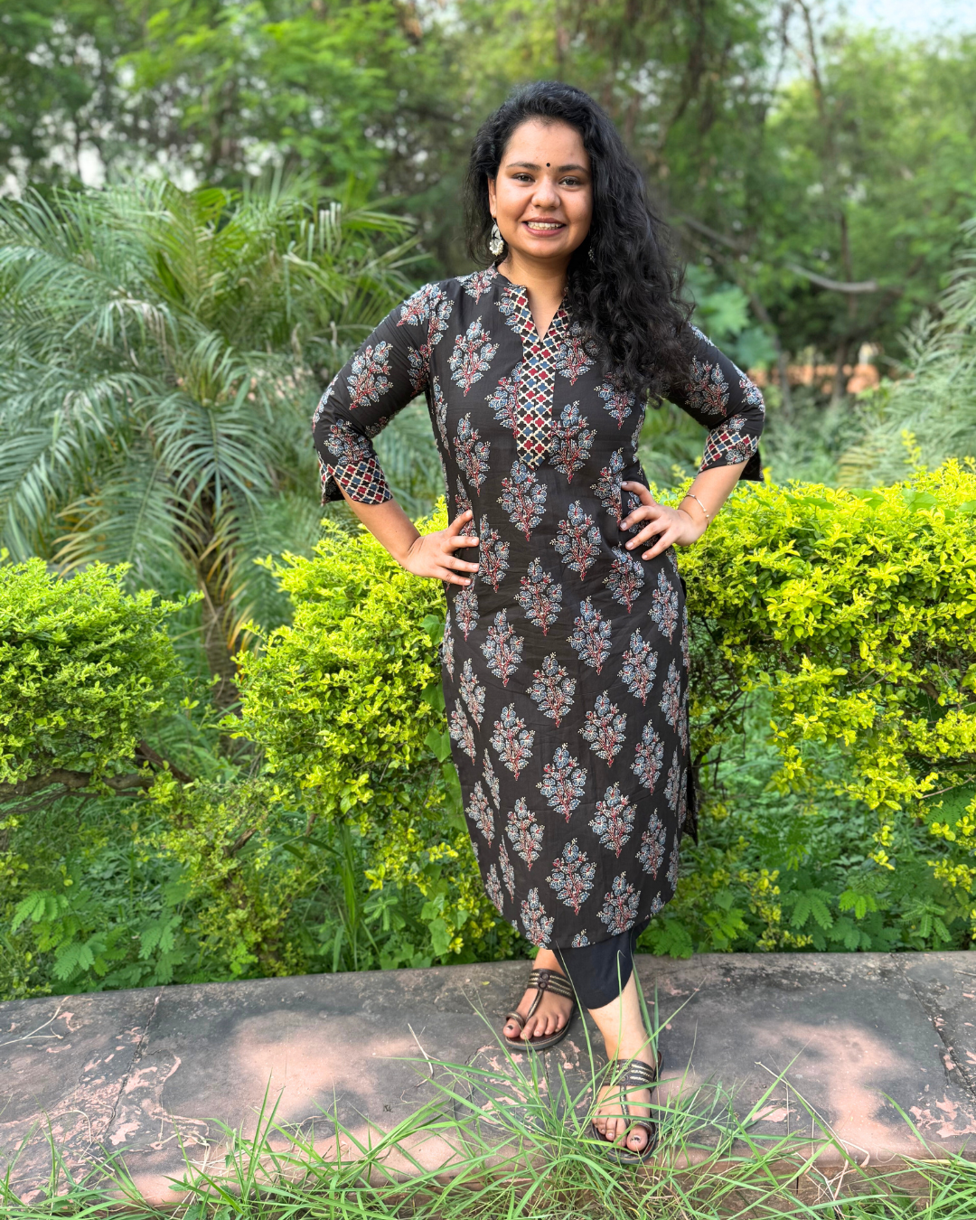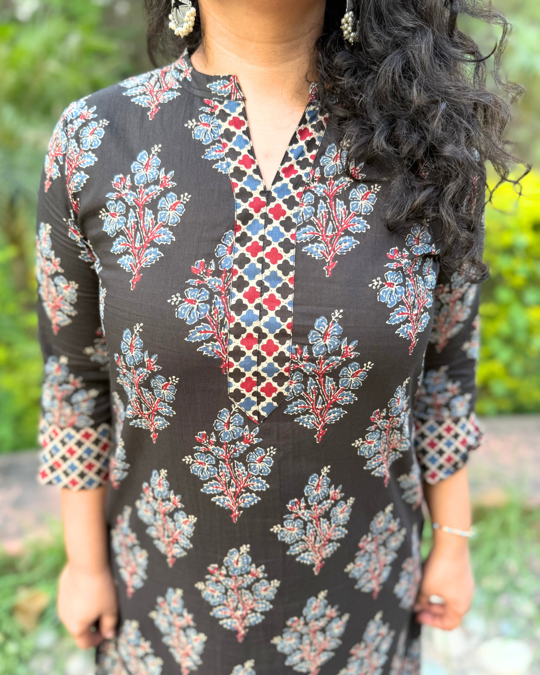 Sanganeri printed kurta with border detailing on sleeve and neck.