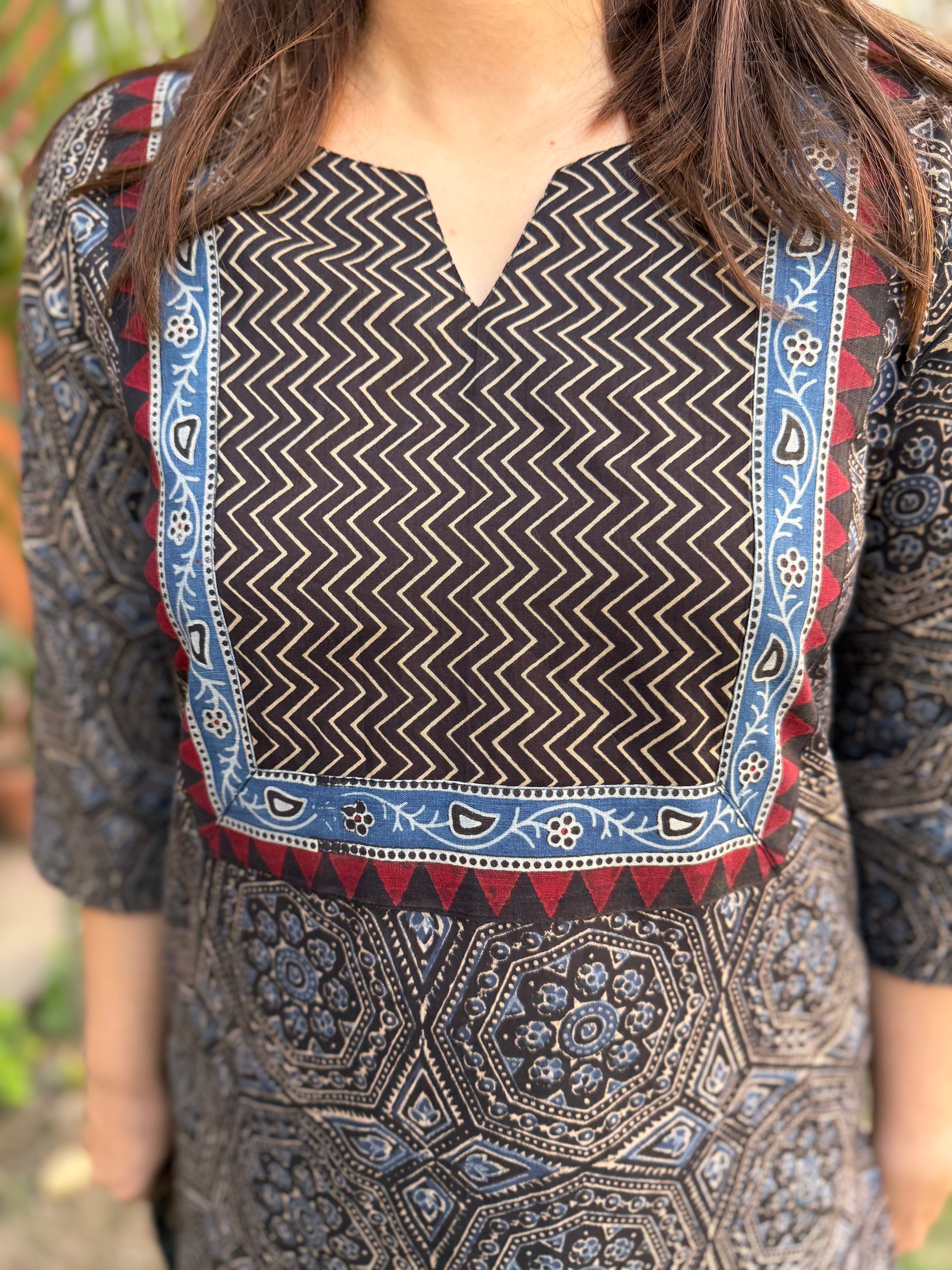 Light fabric that falls easily on the body and looks flattering. I loved the Kullu borders on the neckline and sleeves. Only suggestion I have for the team is not to call the colour 'rust'. Compared to the image shown, the colour is not bright and definitely not rust. Its more like a mustard and brown mix. Goes very well with the borders so no complaints :)