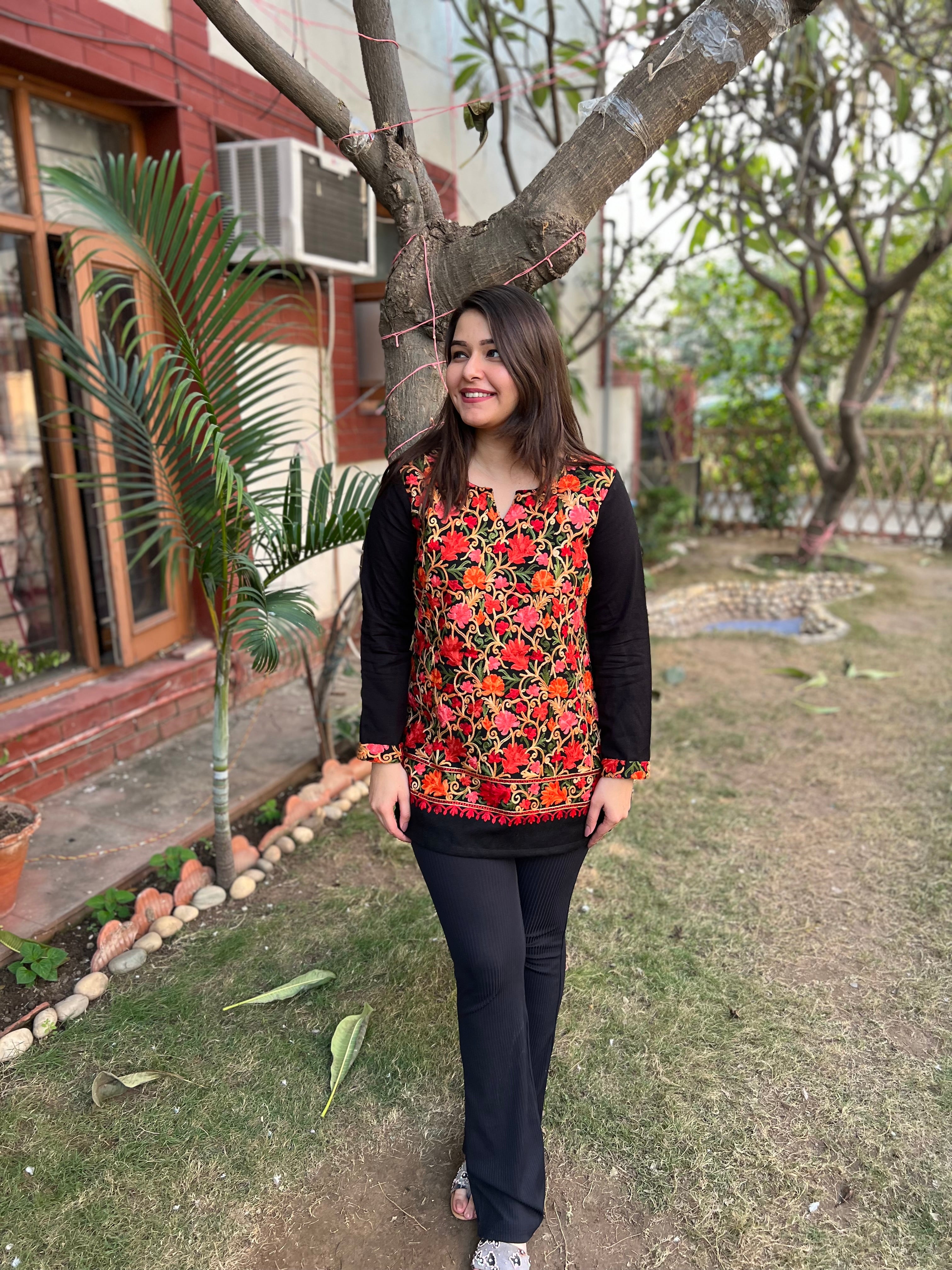 Black Woollen short kurti with Kanni embroidery.Made in woollen spun fabric.