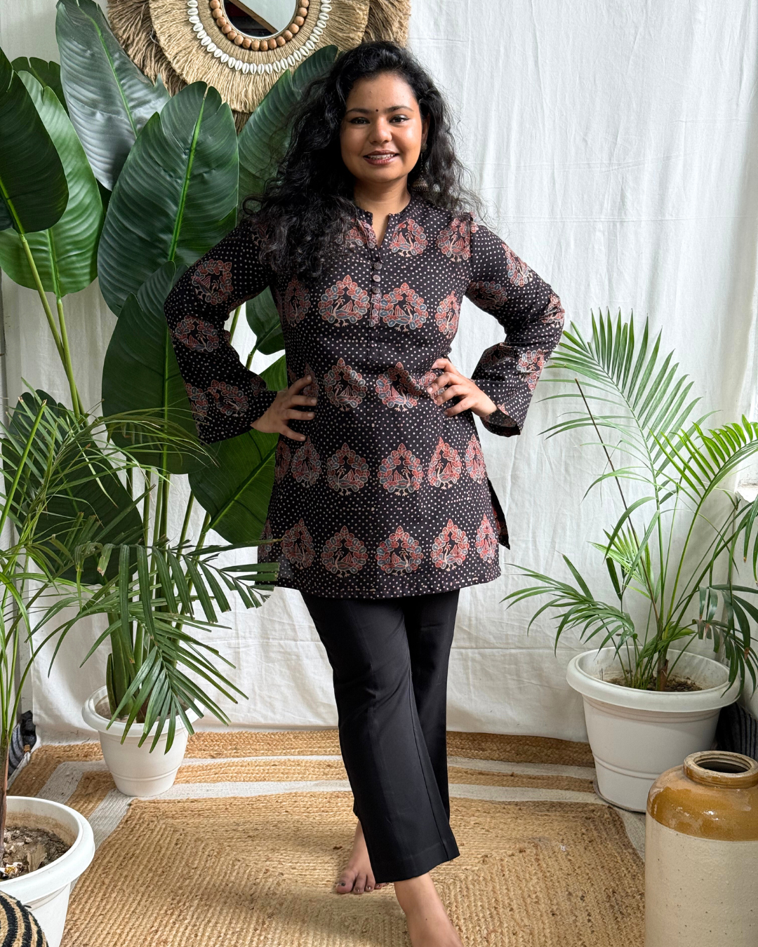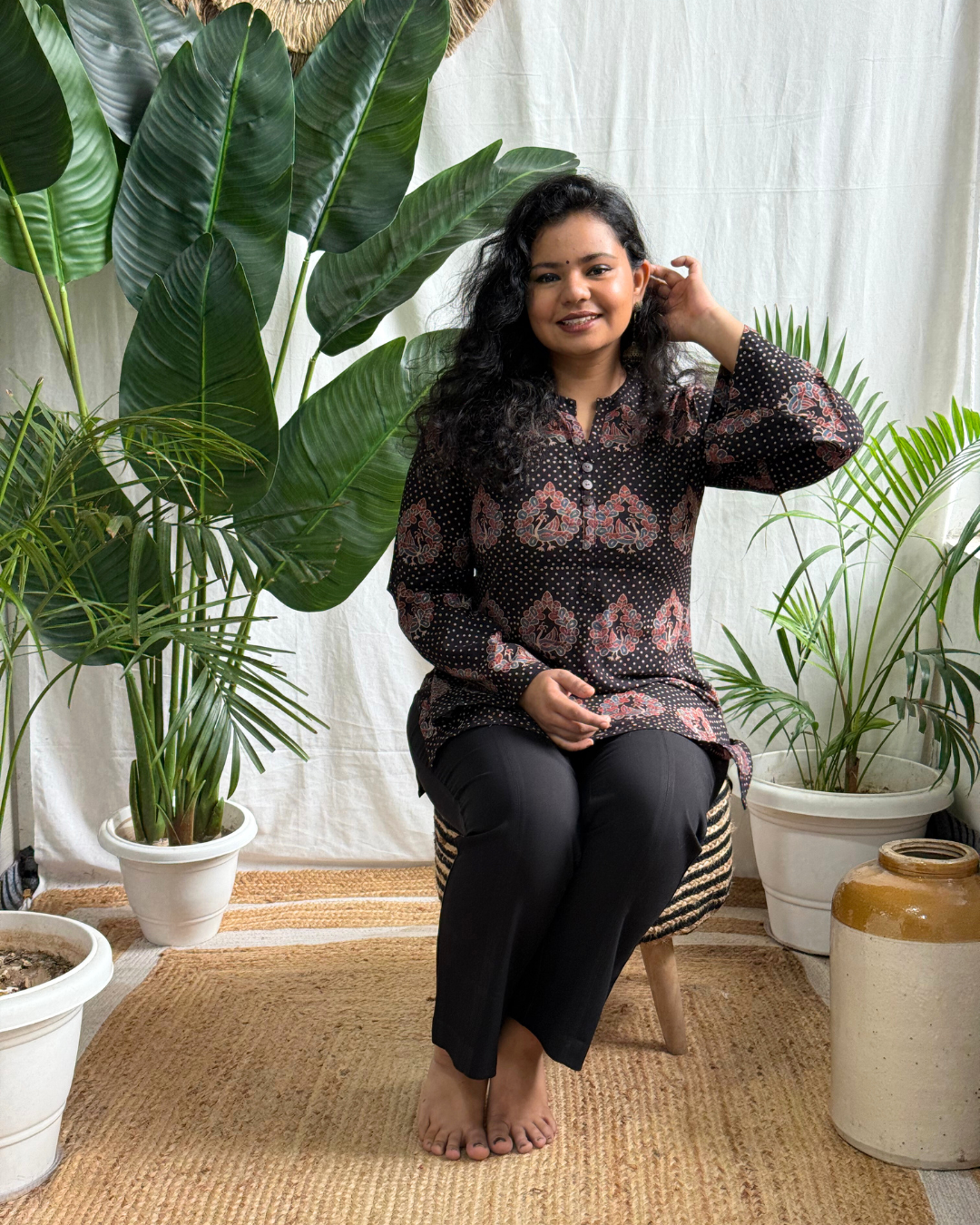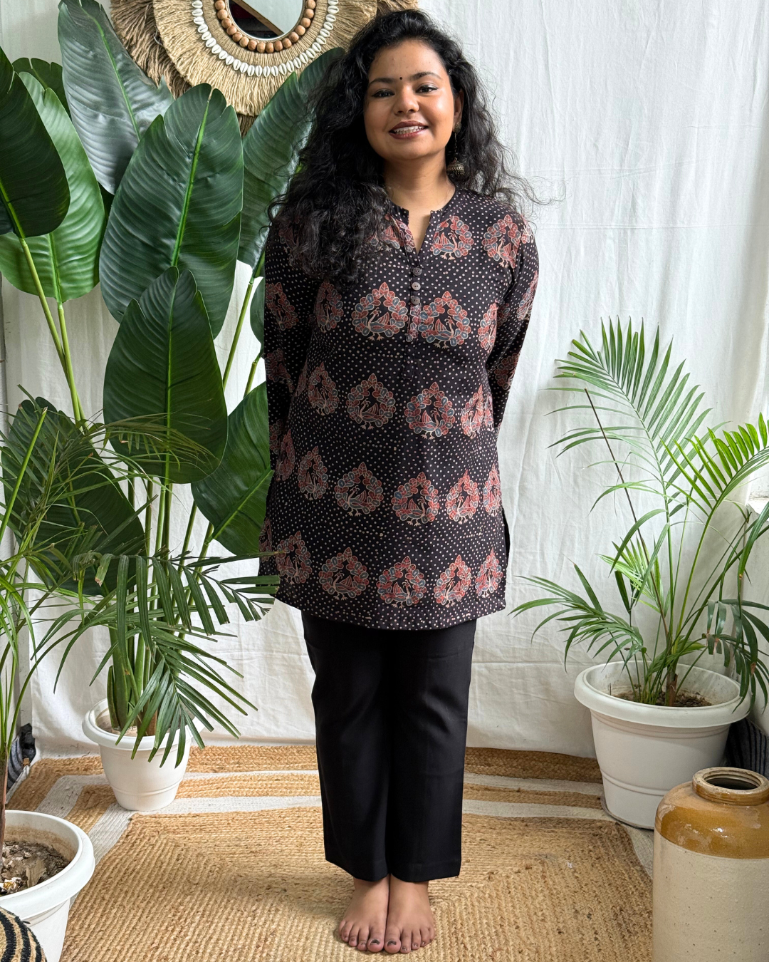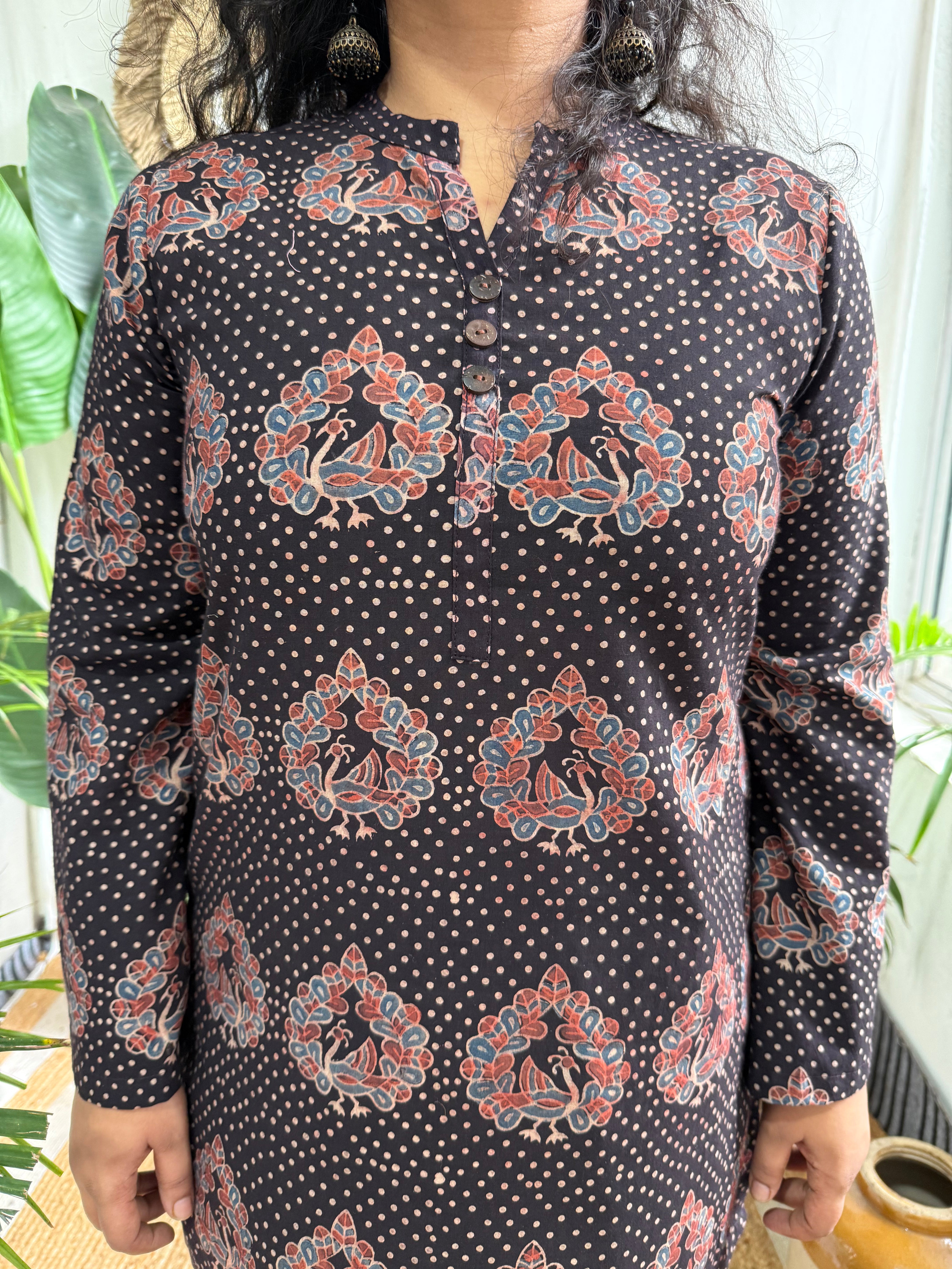 Traditional charm meets comfort in this black kurti adorned with dotted and peacock block prints.