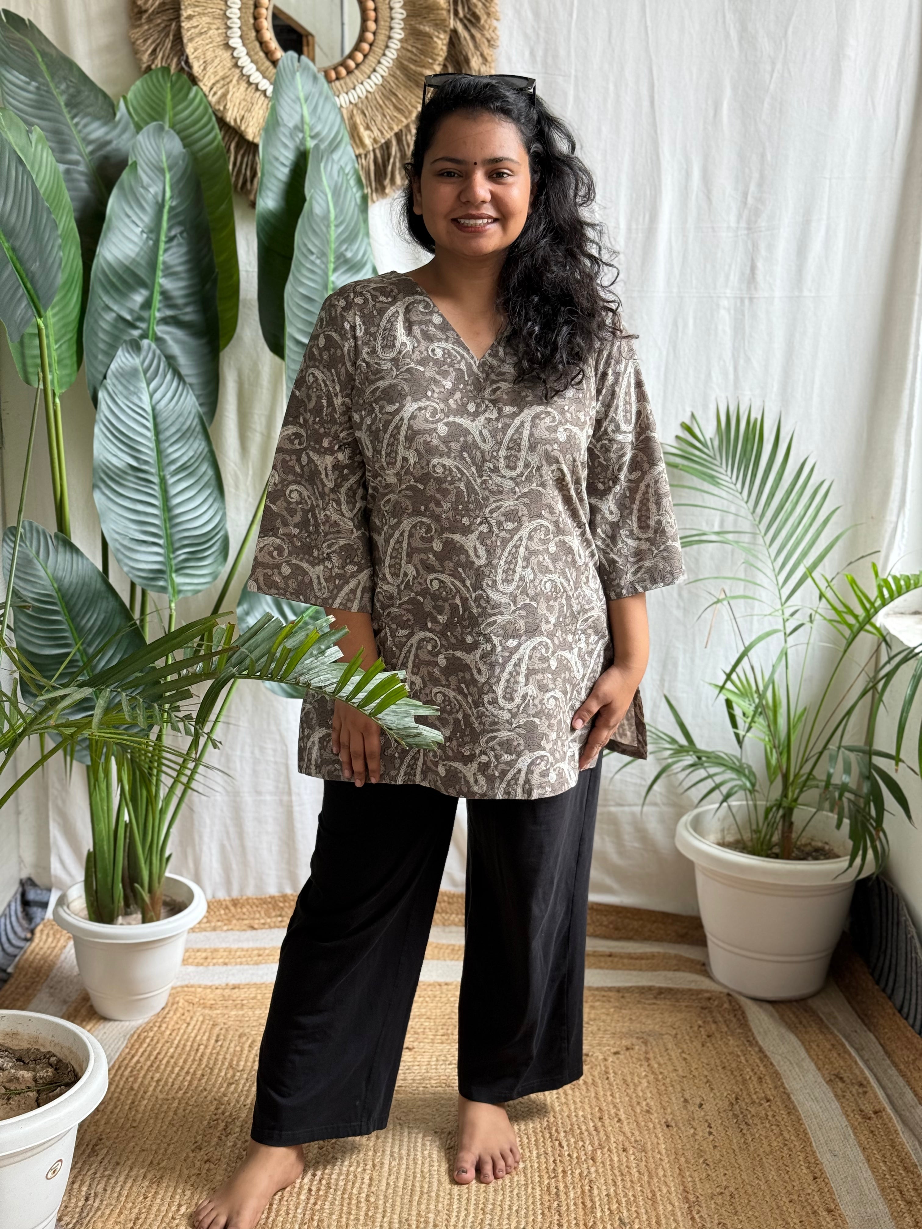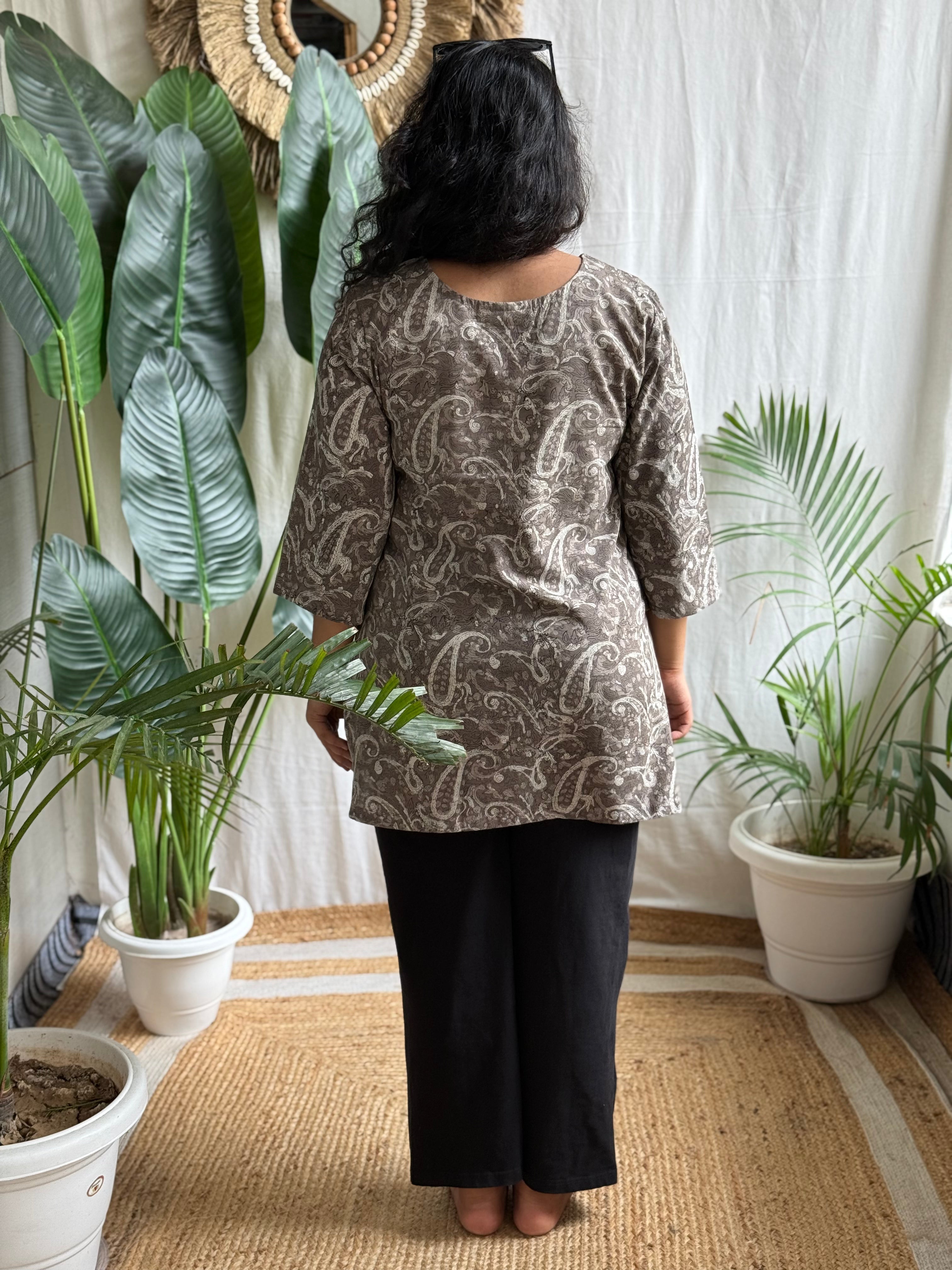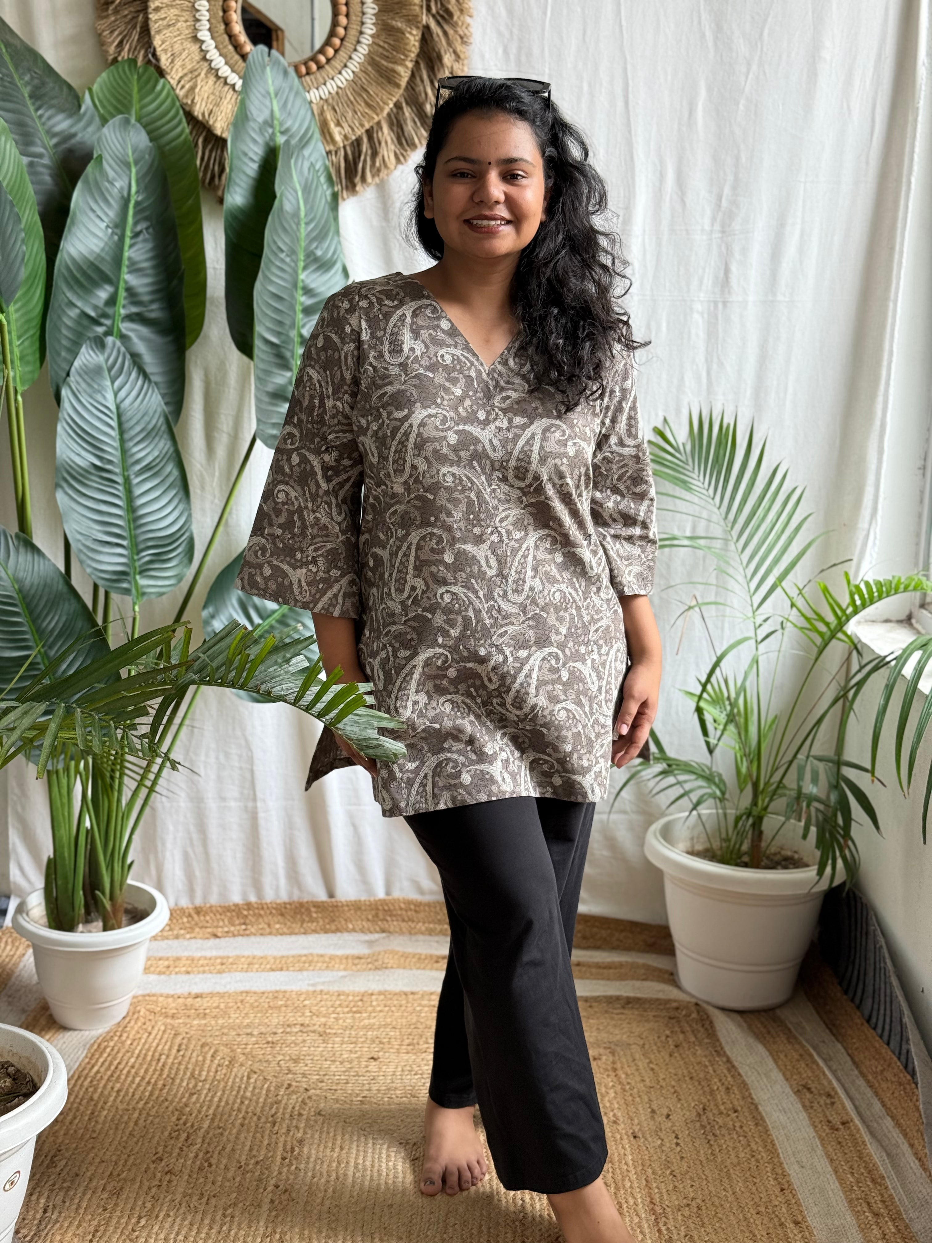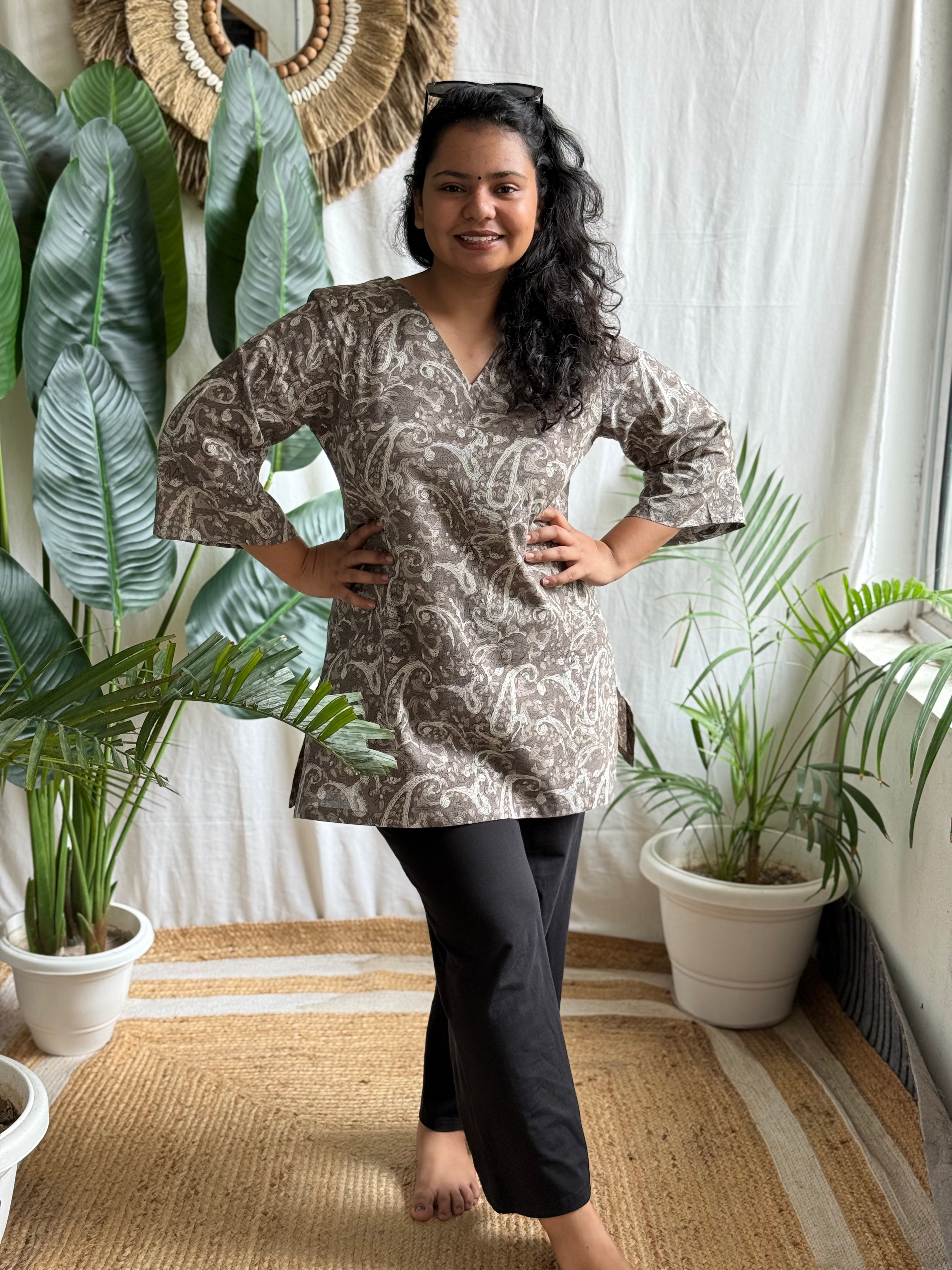 A cotton short kurti featuring Ambi design. Comfortable, breezy, and perfect for everyday wear
