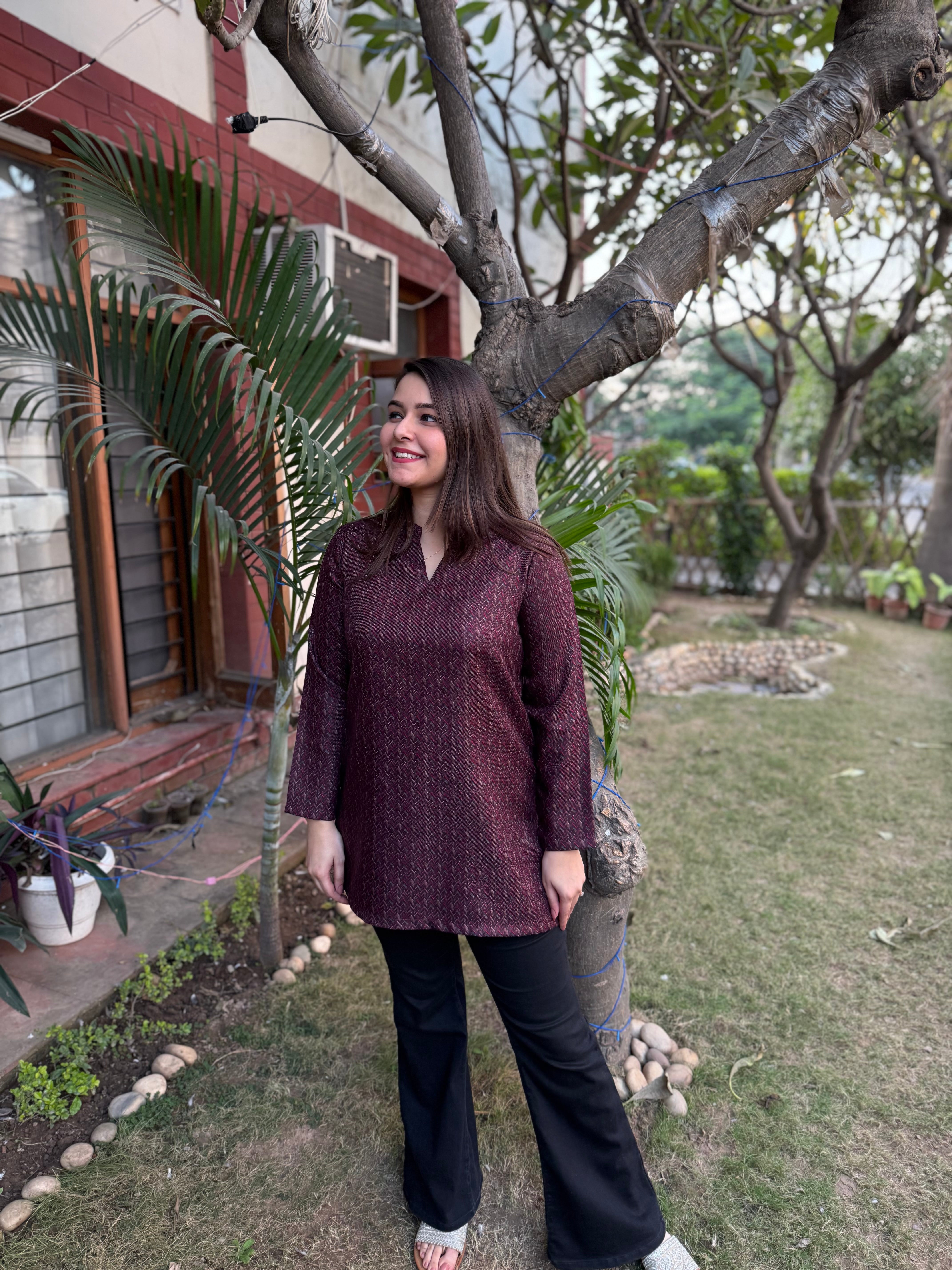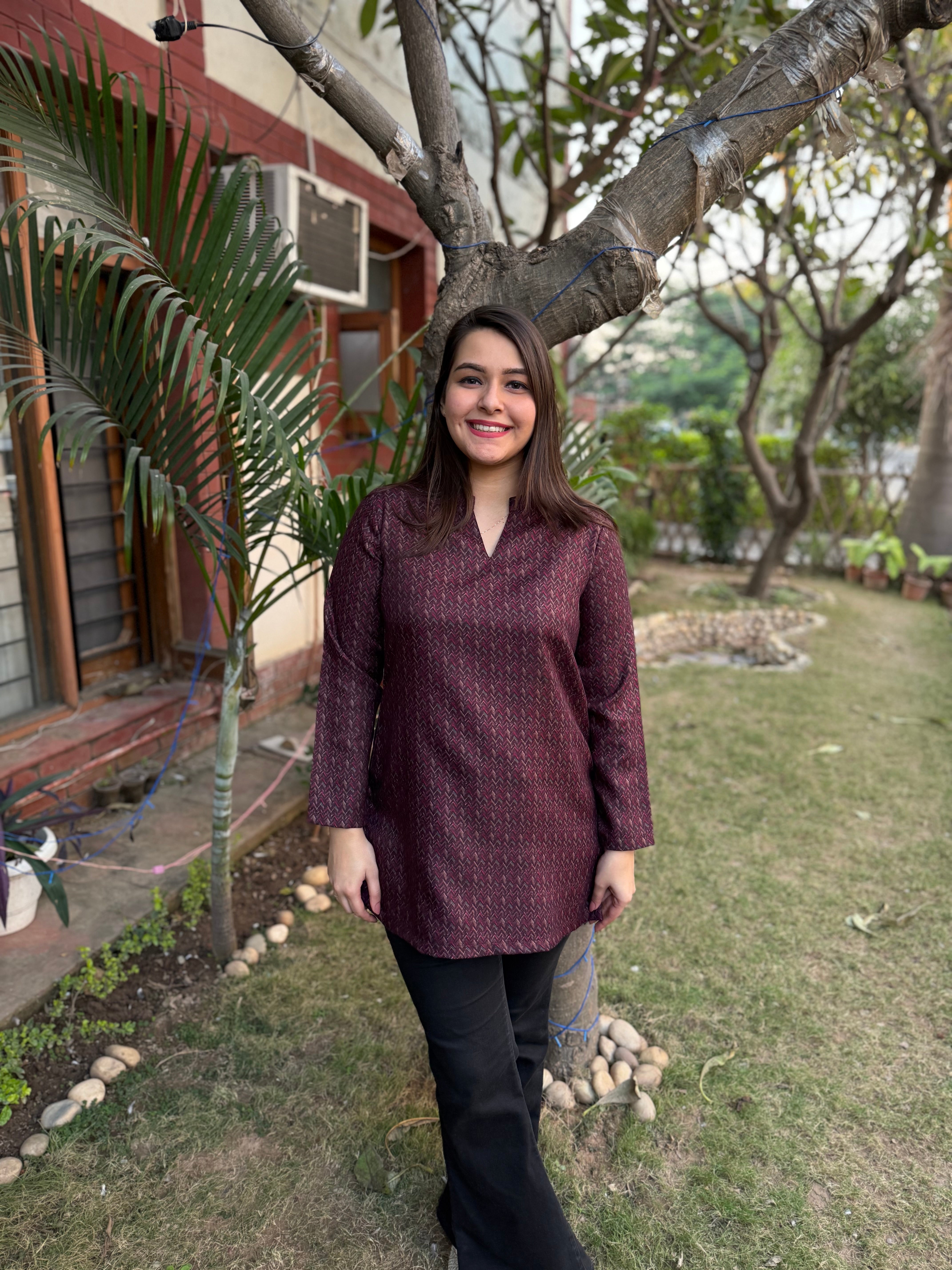 Multi zig zag woollen short kurti made in soft spun fabric.