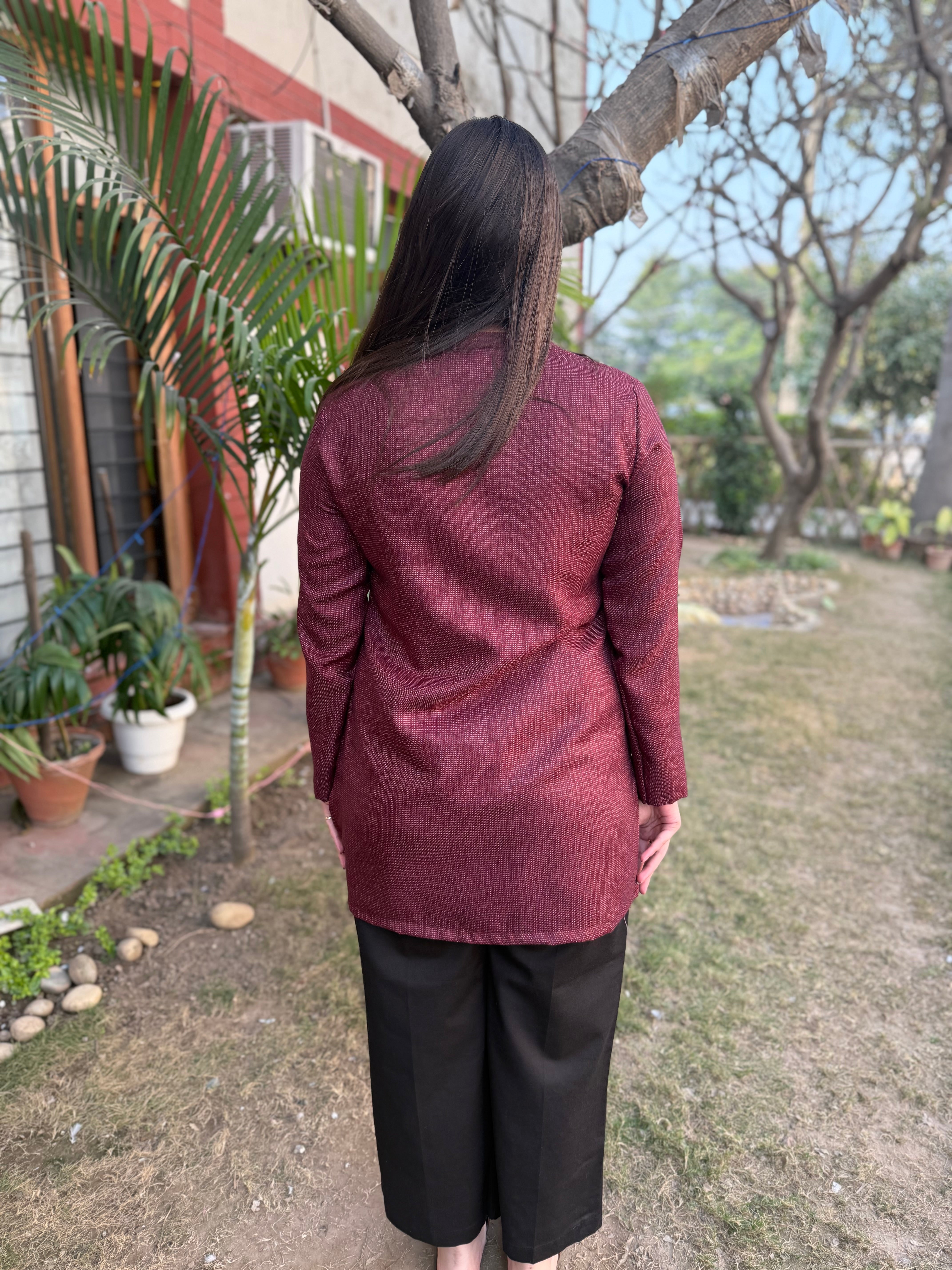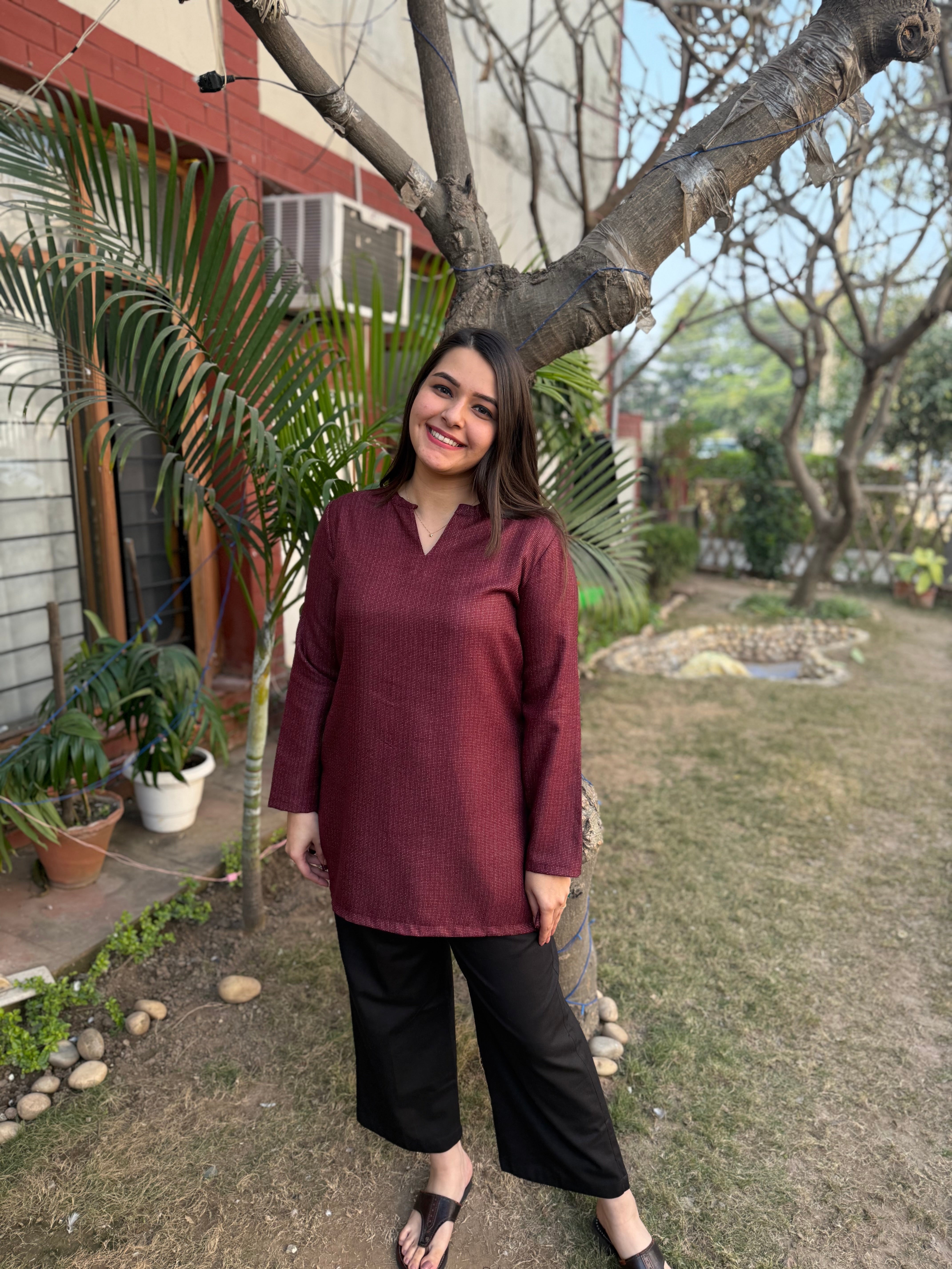 Burgundy self design print woollen short kurti made in soft spun fabric.