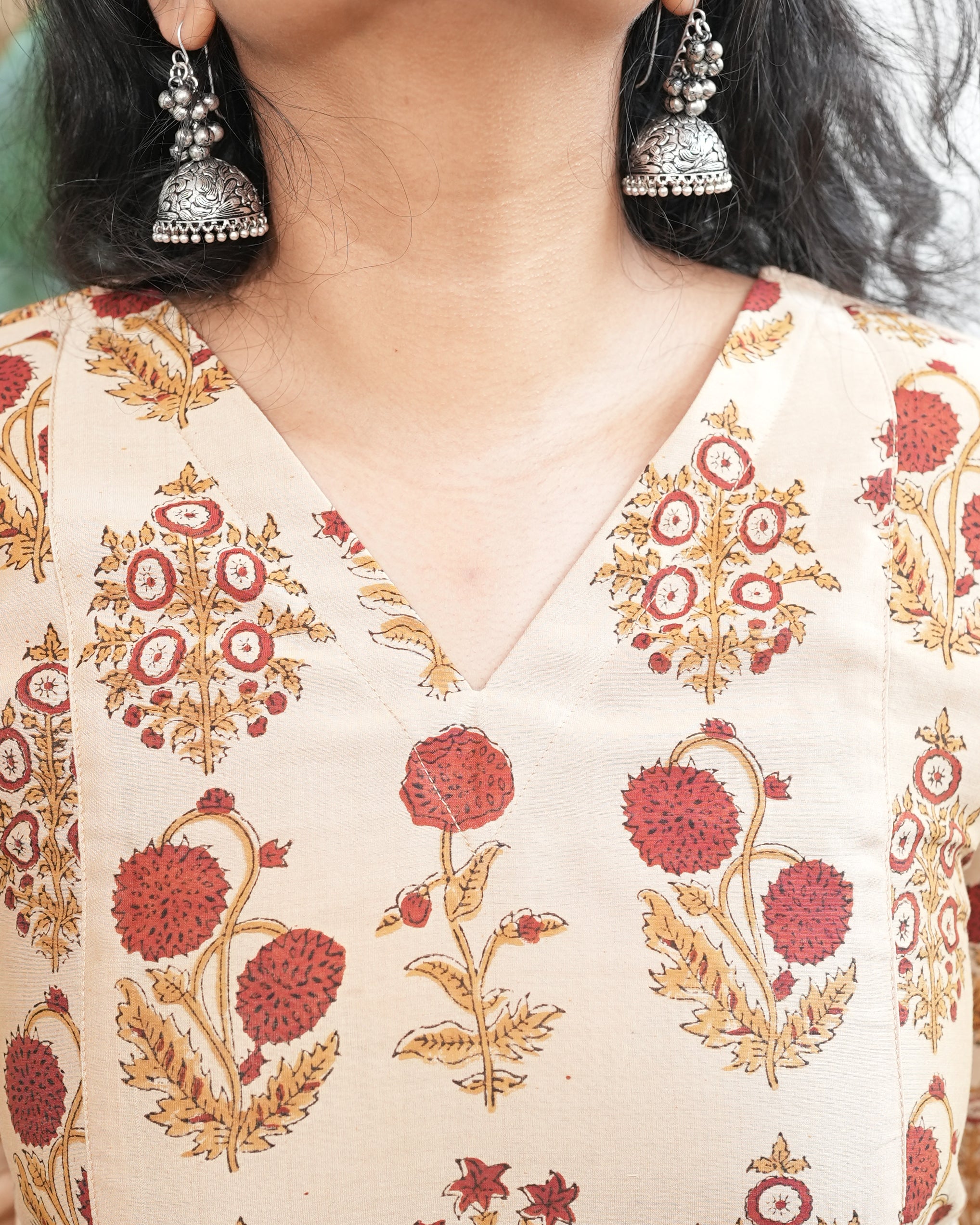 Chanderi A-line kurta with side pocket, offering a blend of comfort and everyday charm. Stitched with 100% cotton lining inside.