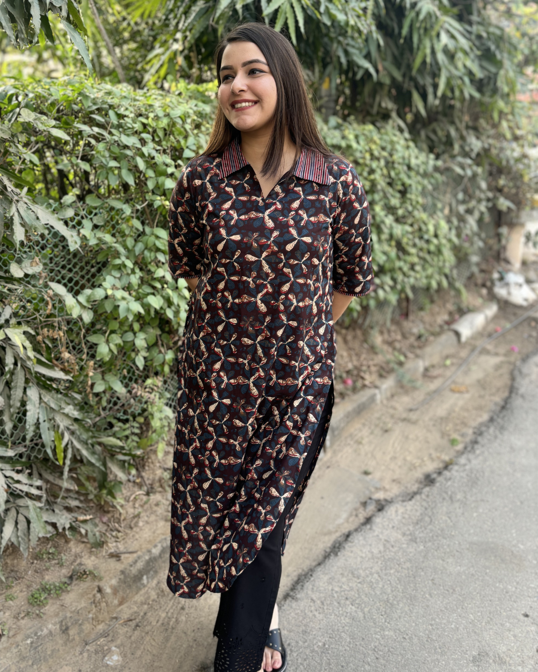 Sanganeri printed kurta with a side slit ,side pocket and a back pleat for maximum comfort.