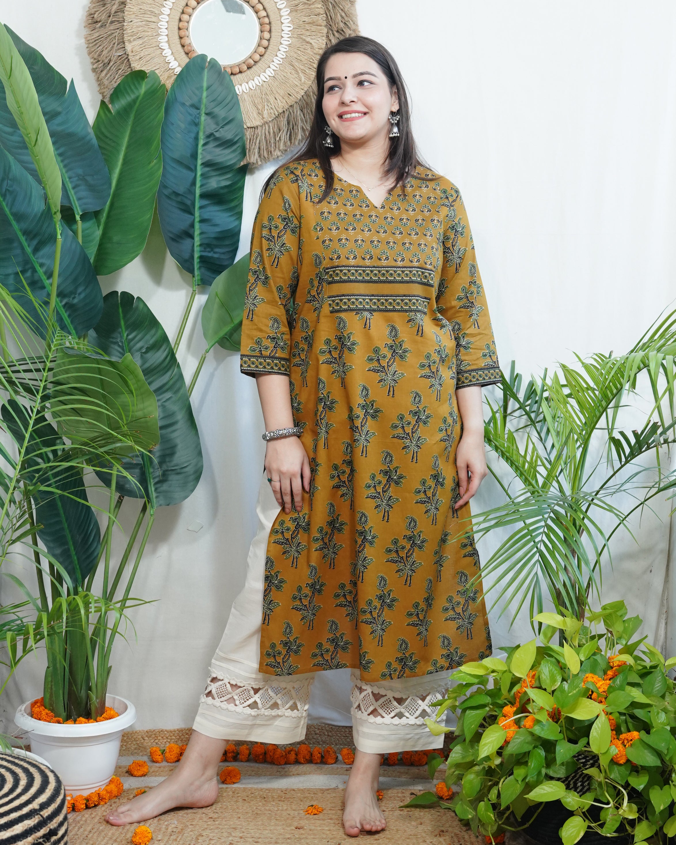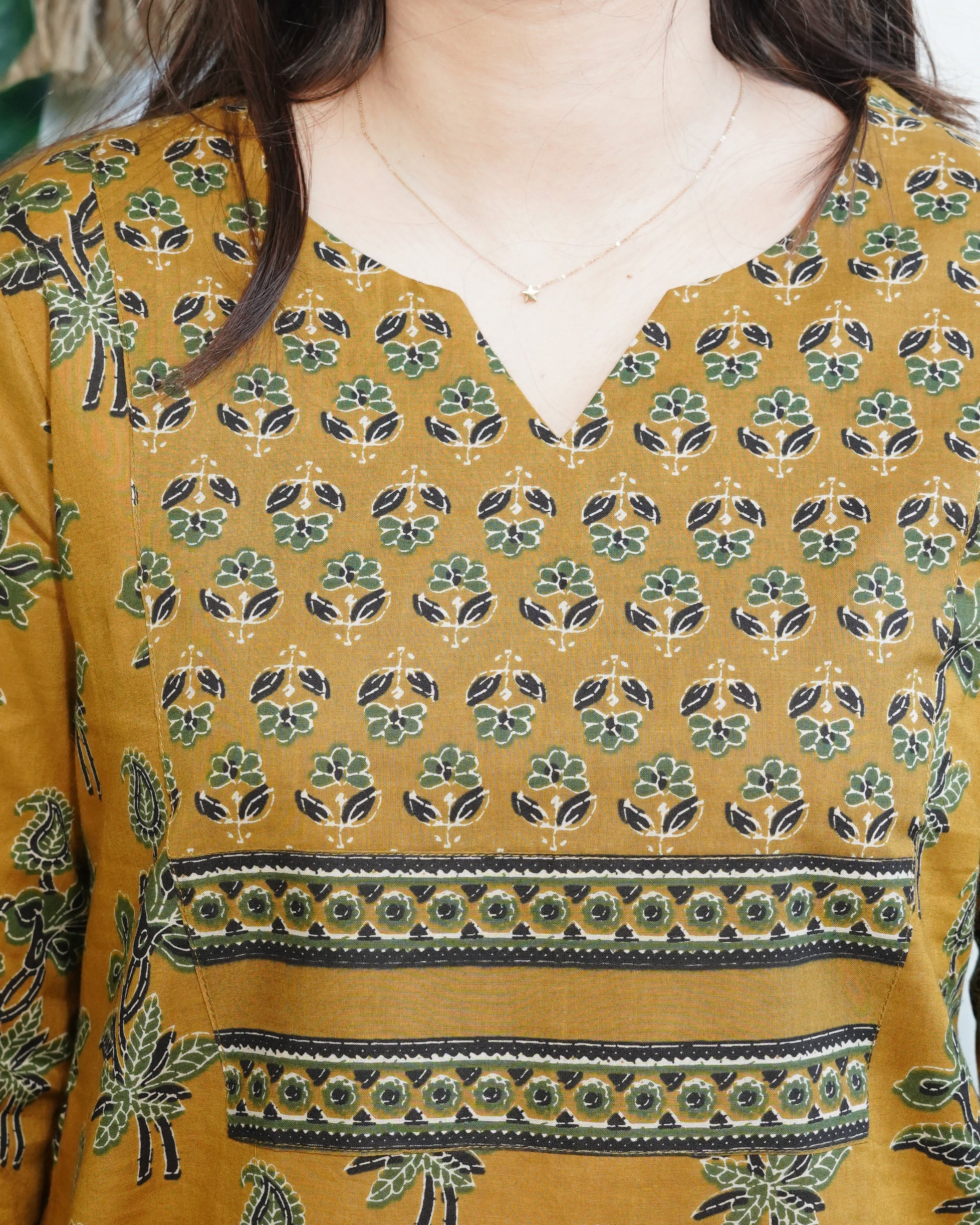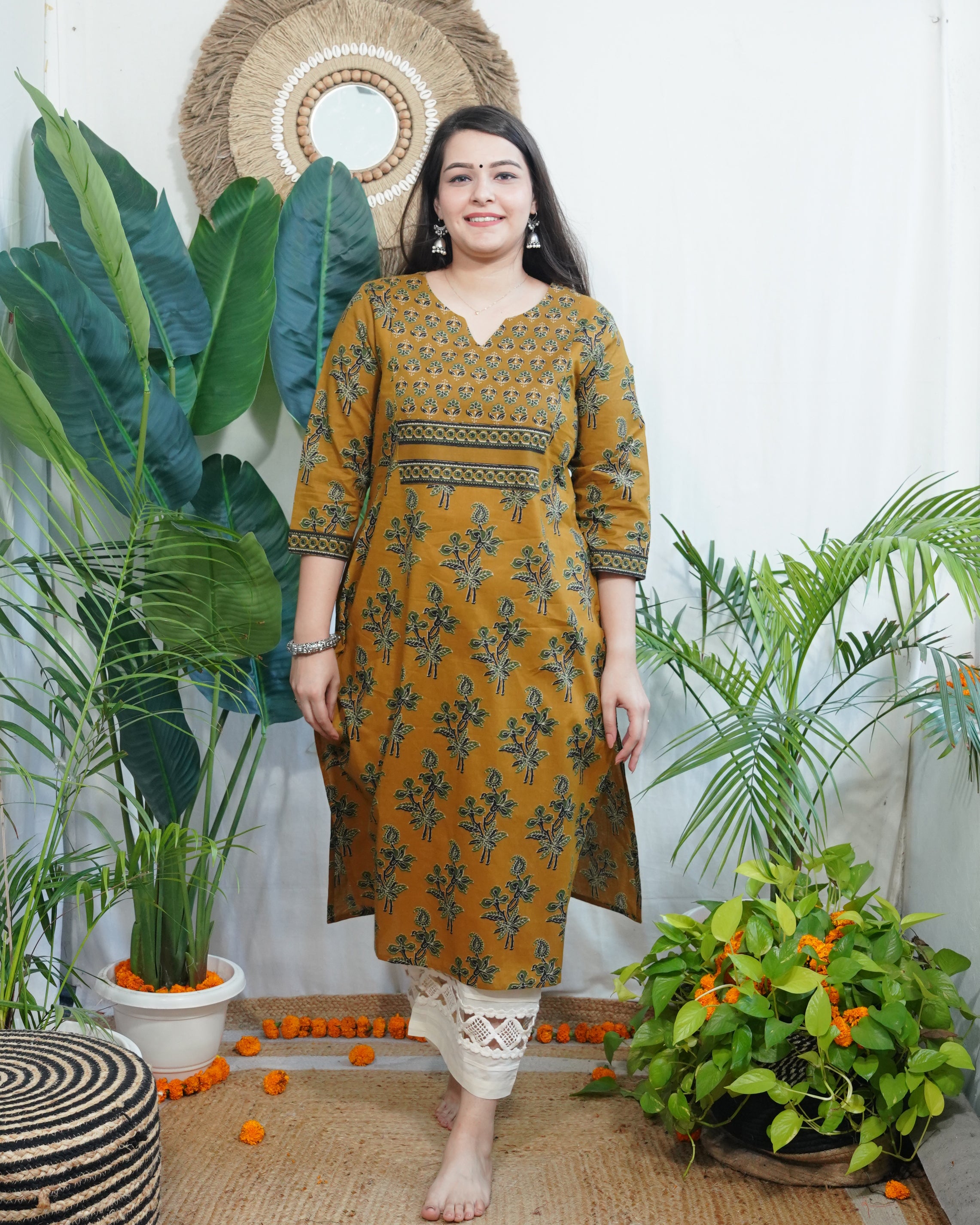 Dark mustard yellow straight fit kurta featuring floral print with yoke on neck.