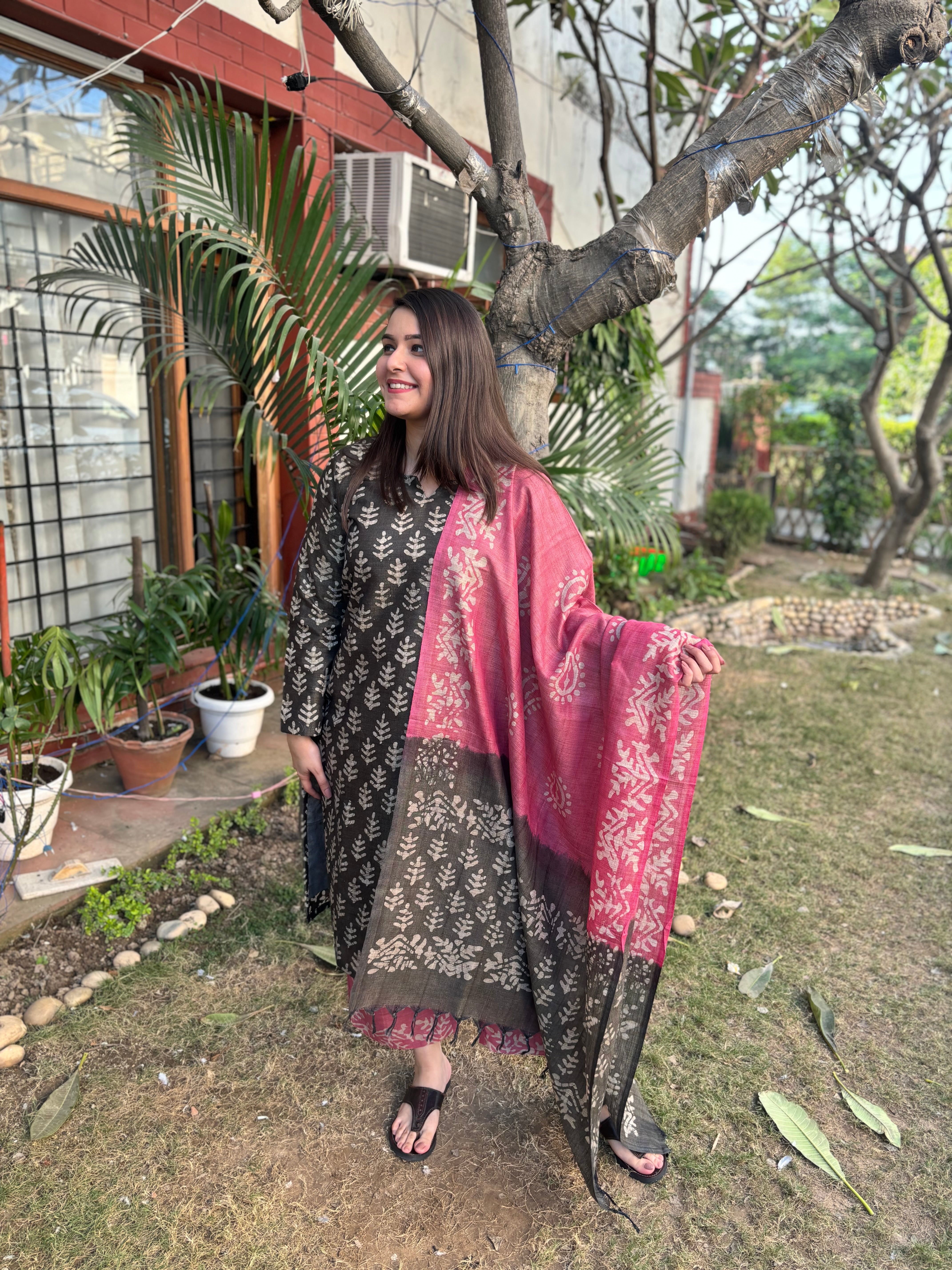 Tussar Silk handblock printed suit set stitched with cotton lining inside kurta and palazzo both.
