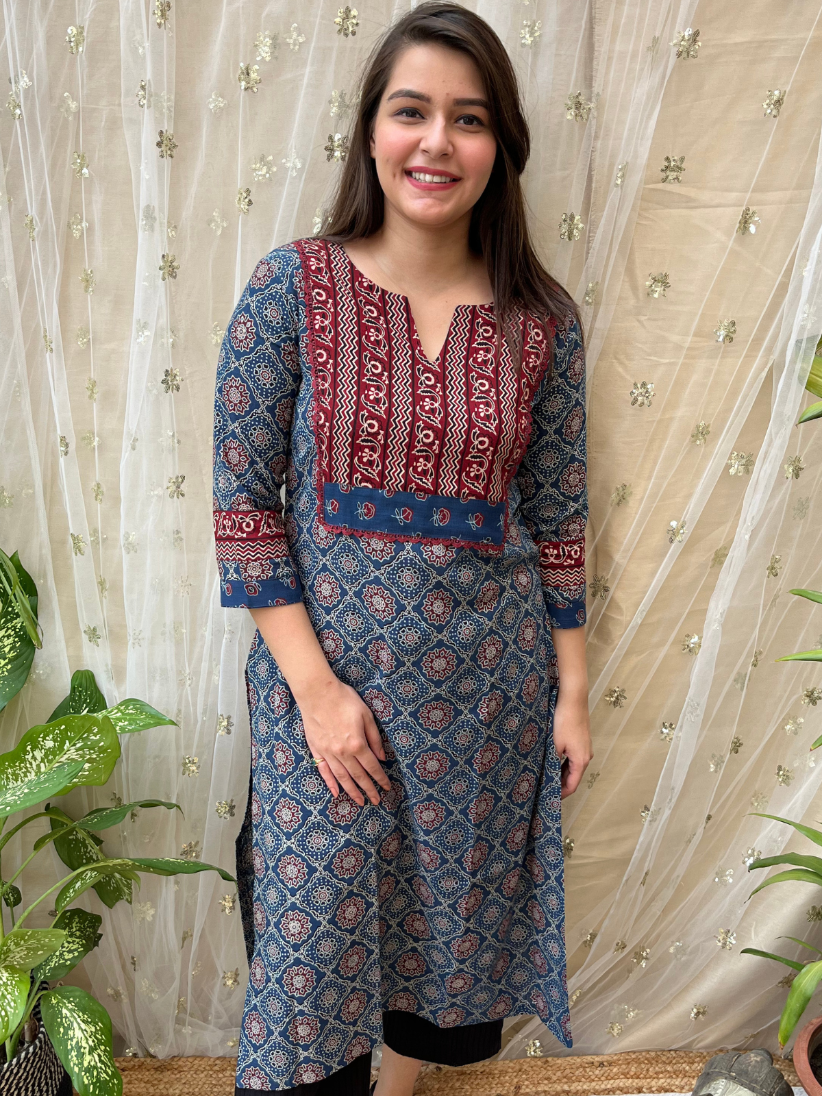 Elevate your everyday style with our handcrafted Ajrakh Yoke Kurti, featuring intricate block prints.