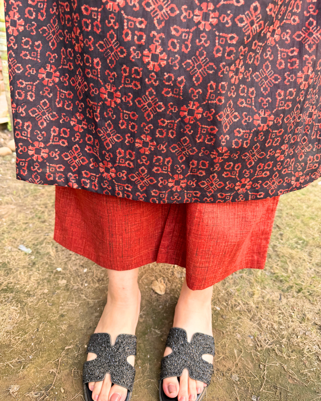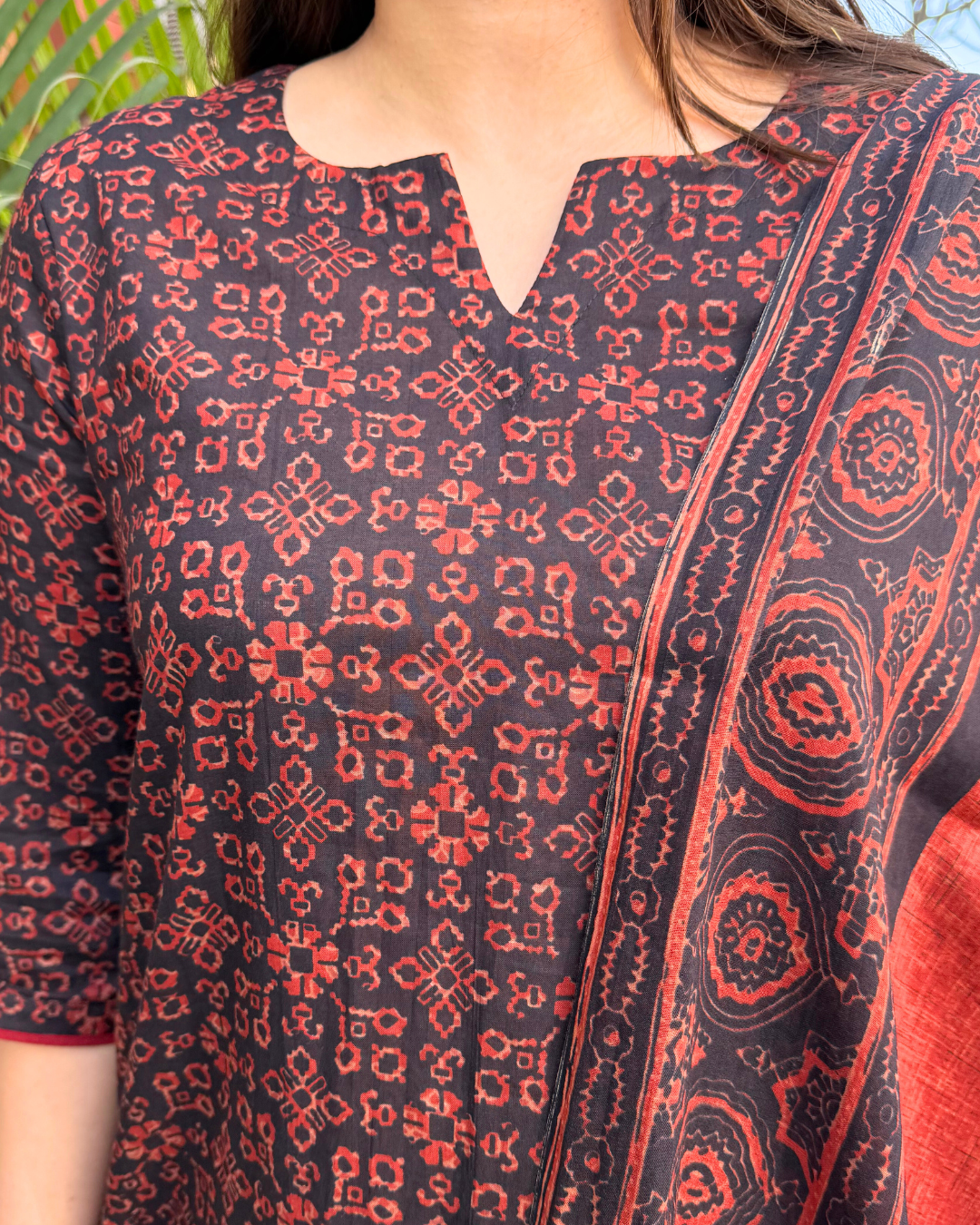 Maroon black geometric full suit set with matching duppata and palazzo.