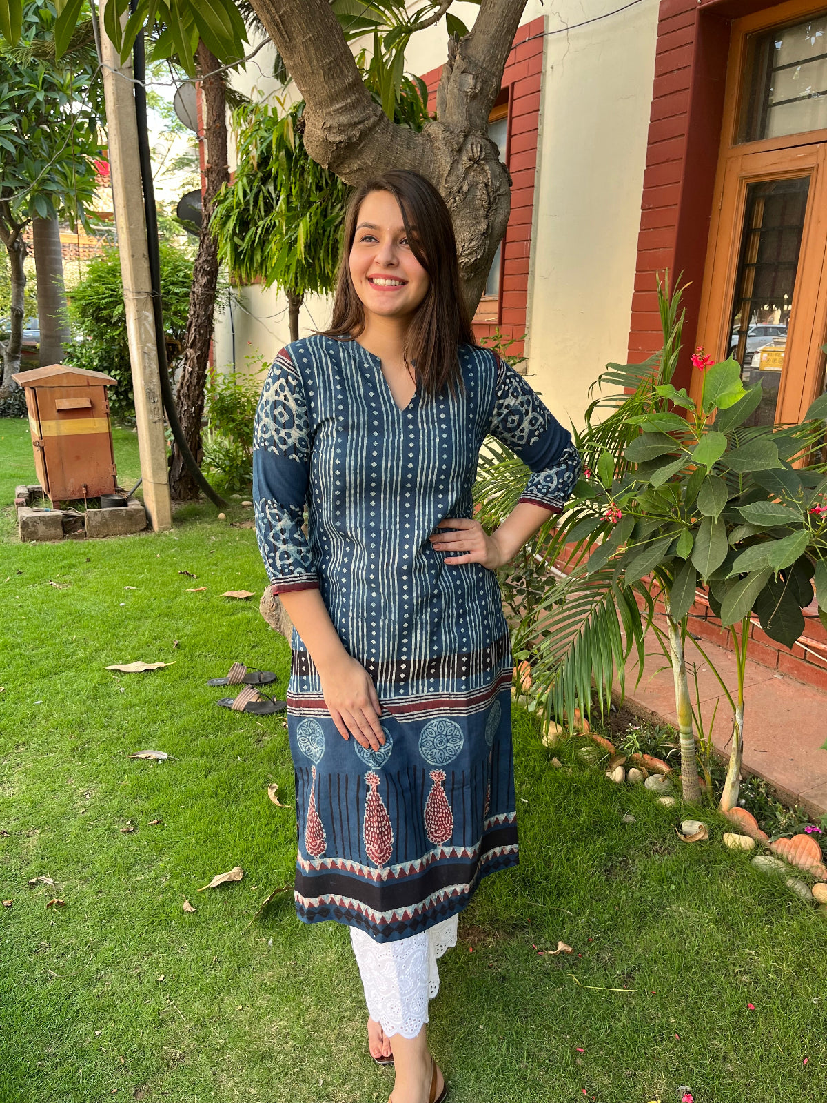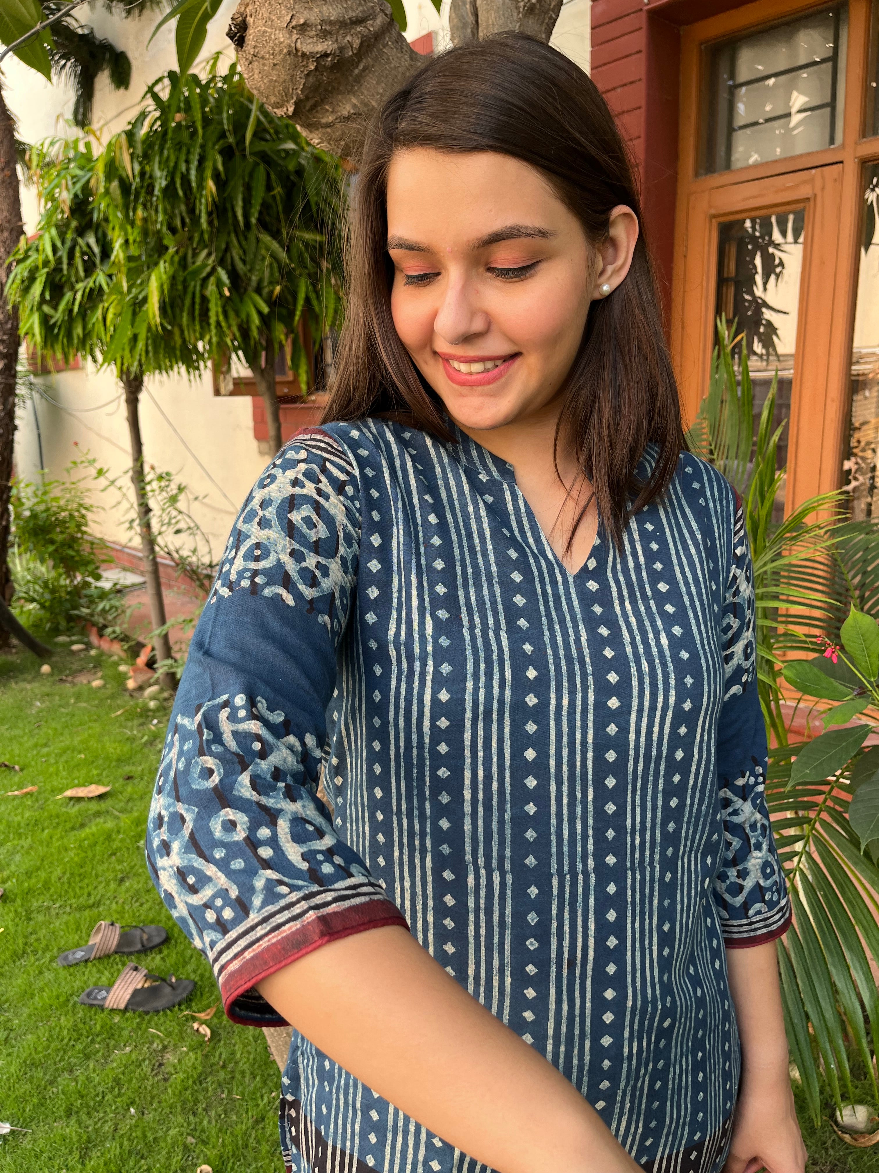 Elevate your everyday style with our handcrafted Ajrakh designer Kurti, featuring intricate block prints.