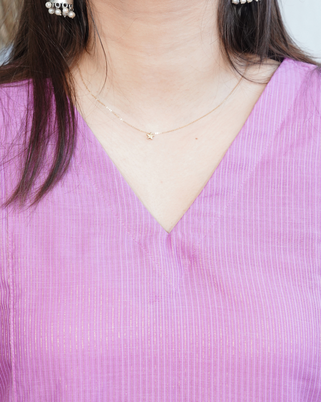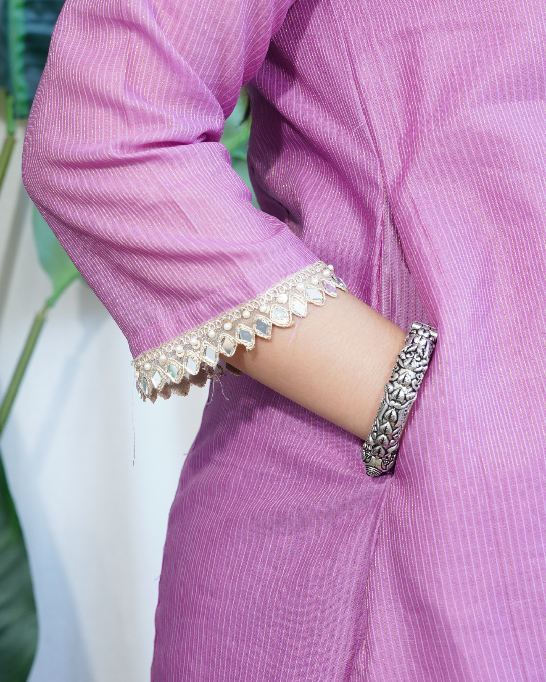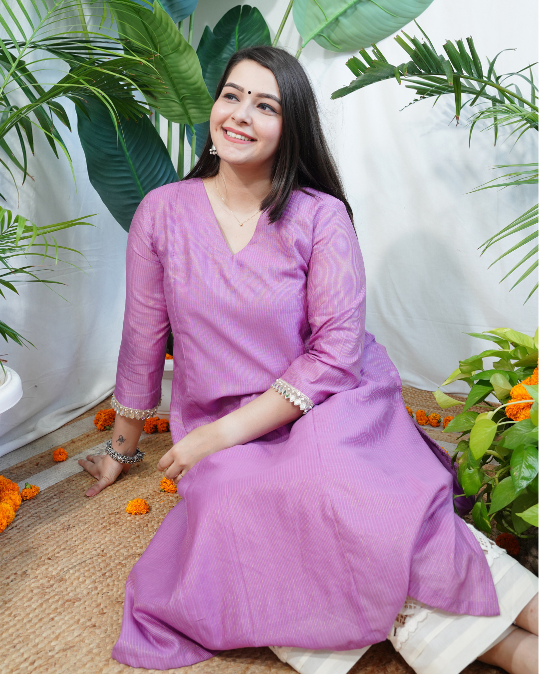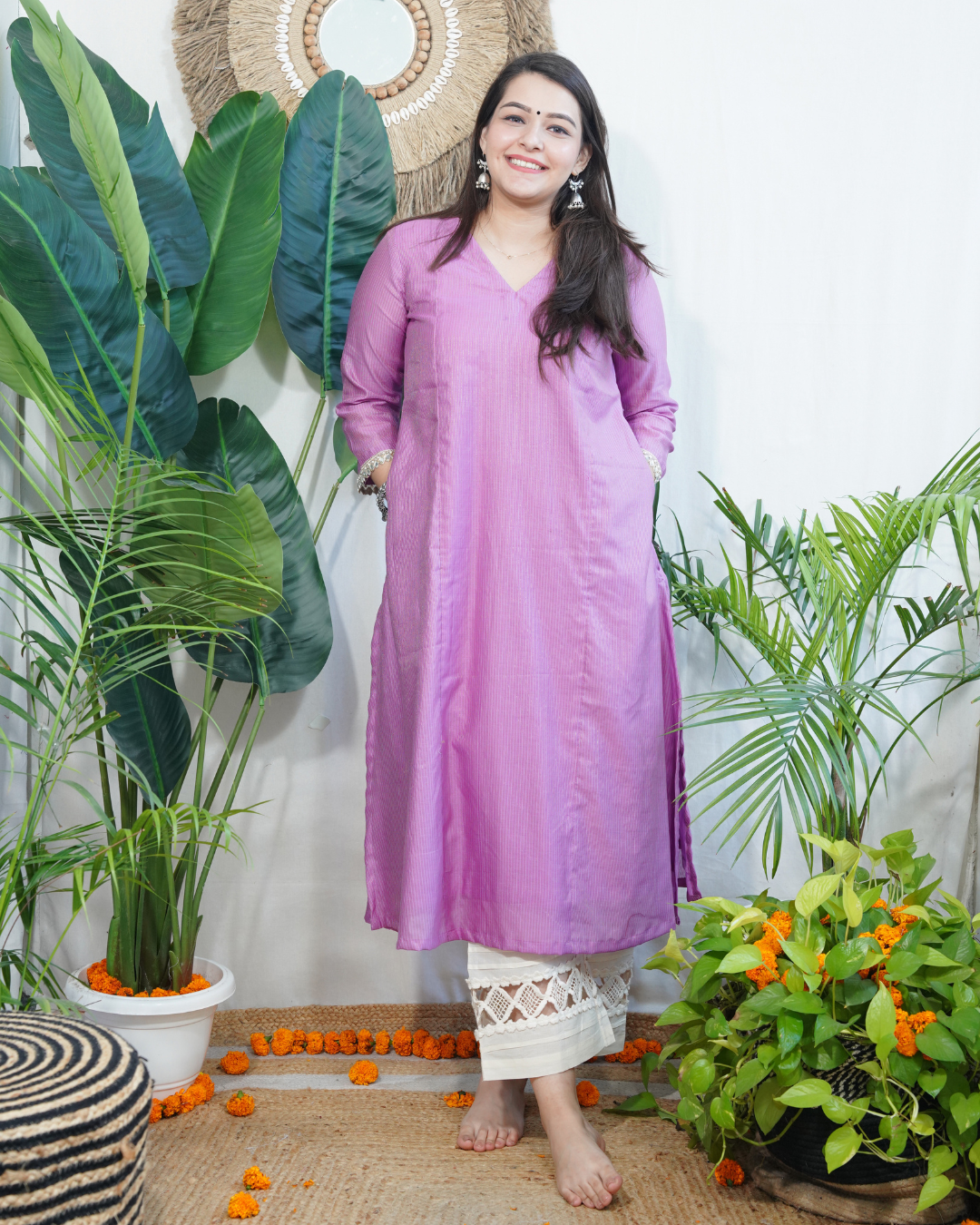 Chanderi A-line kurta with side pocket and side slits, offering a blend of comfort and everyday charm. Stitched with 100% cotton lining inside.