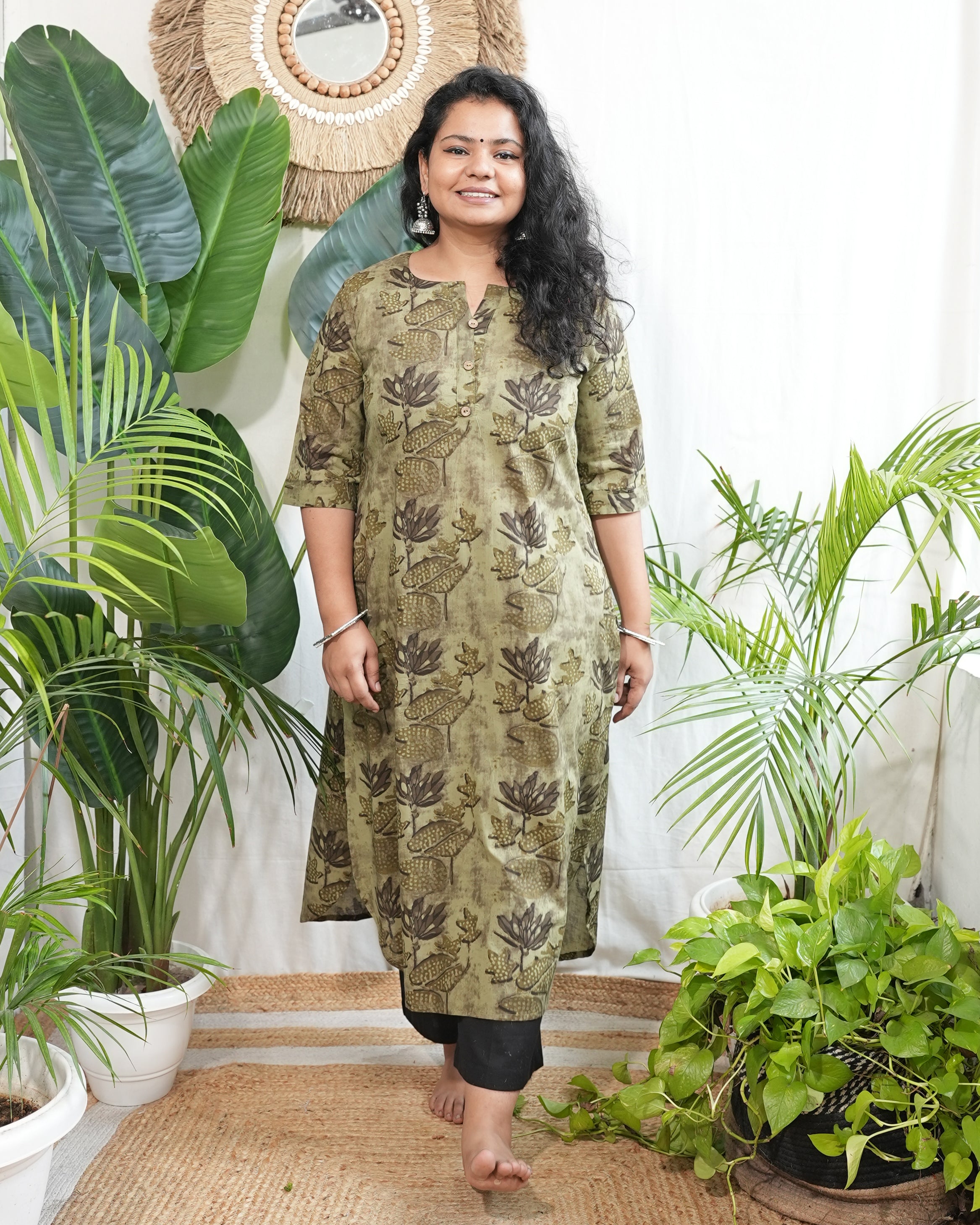 Leaf green floral kurta with pocket