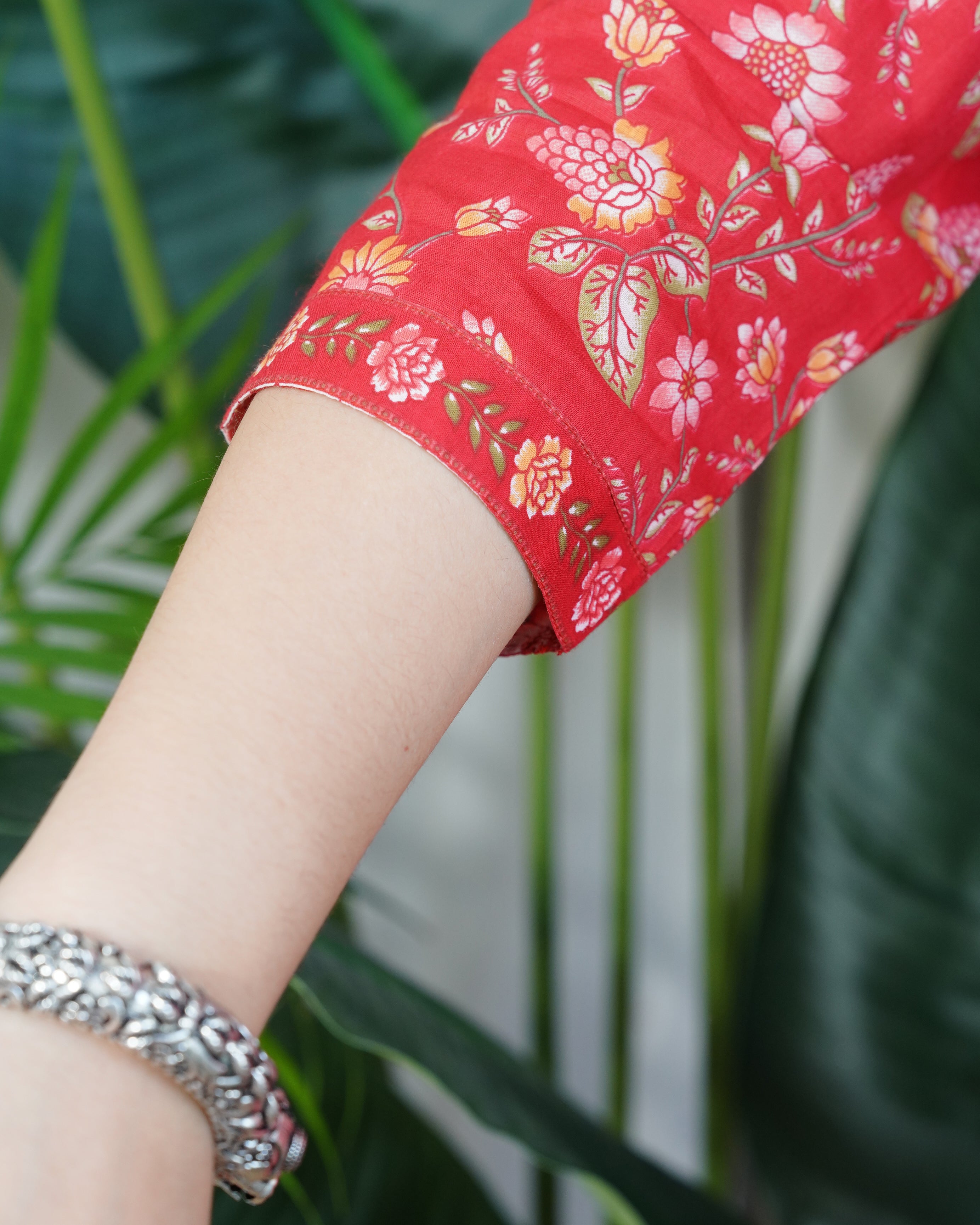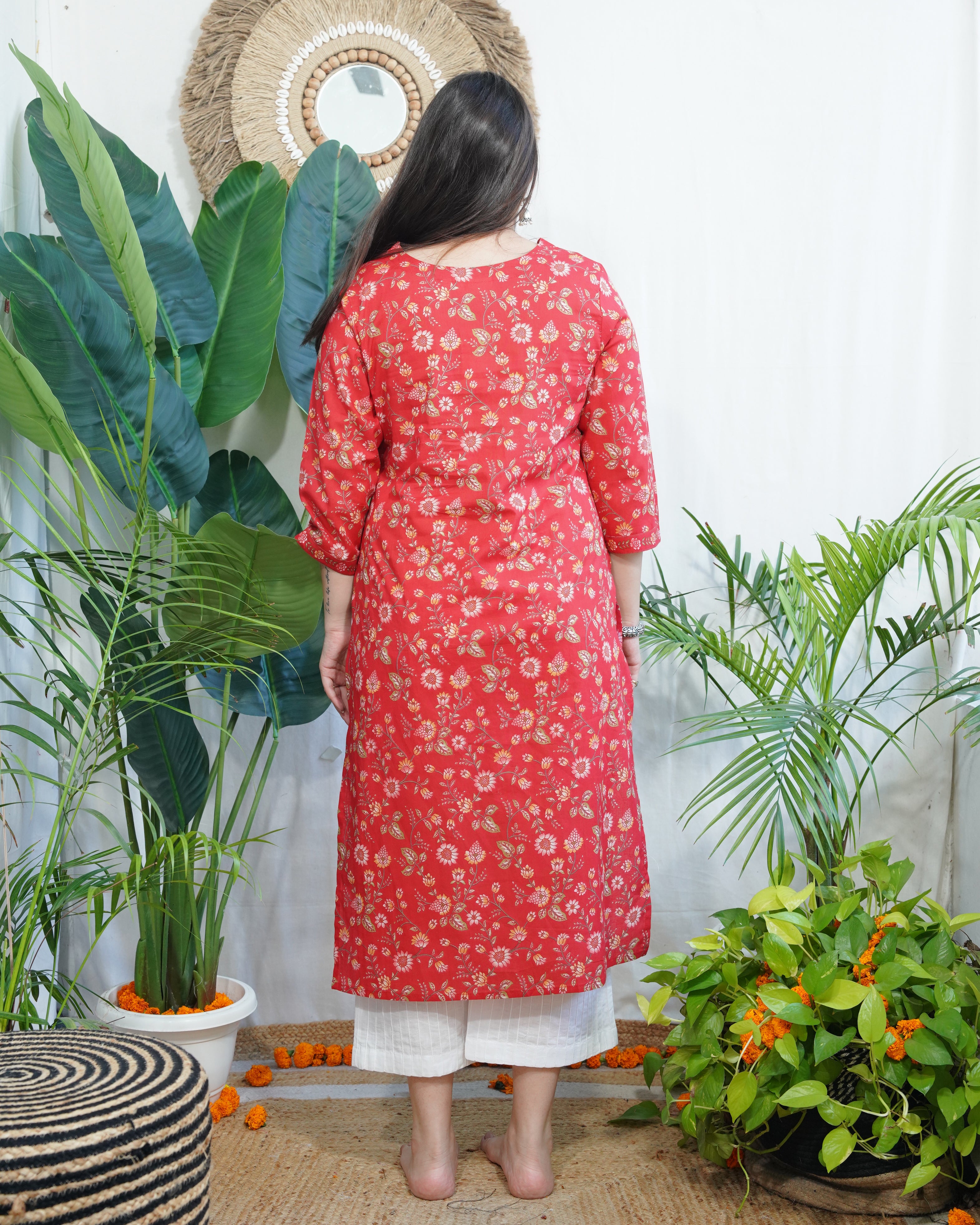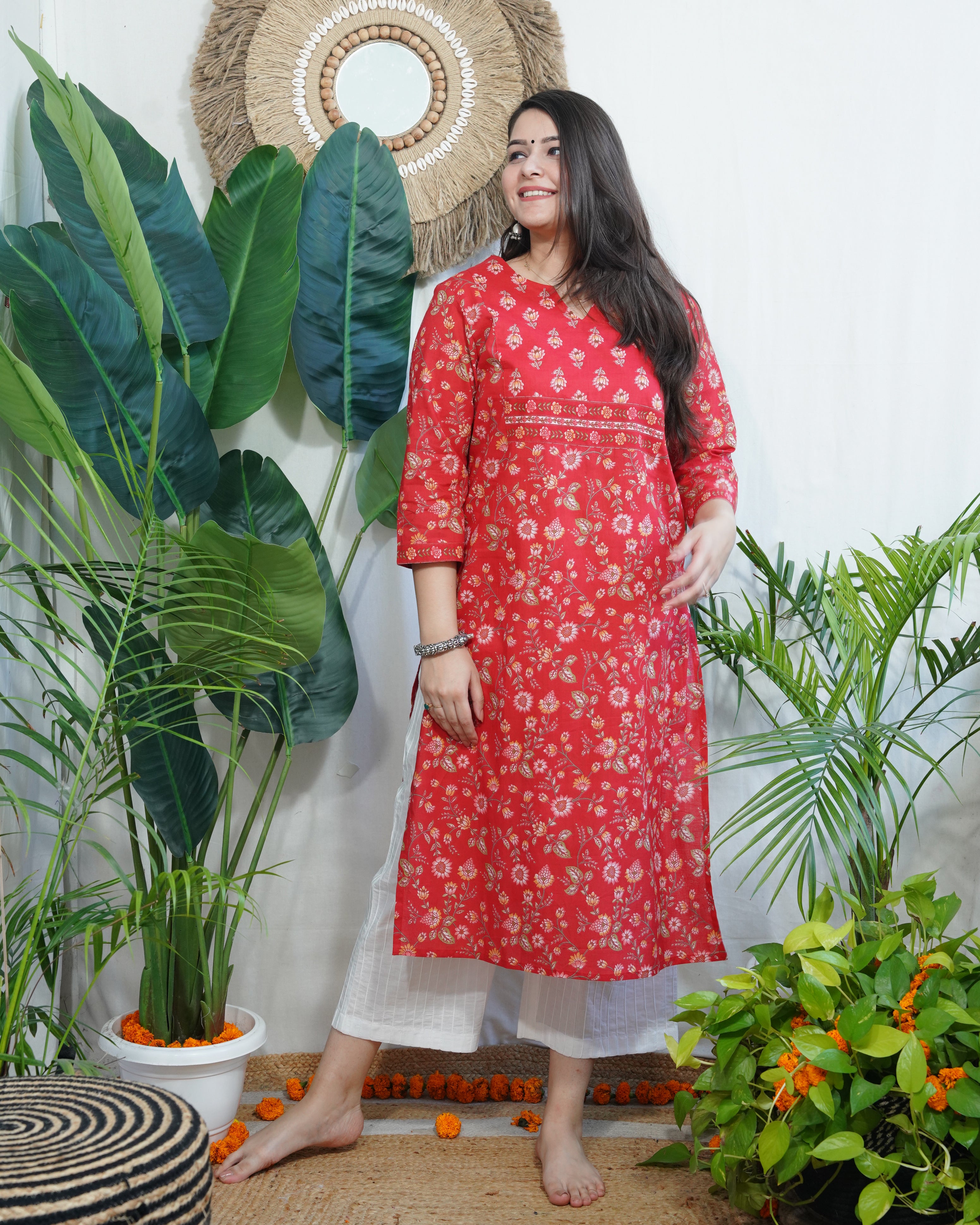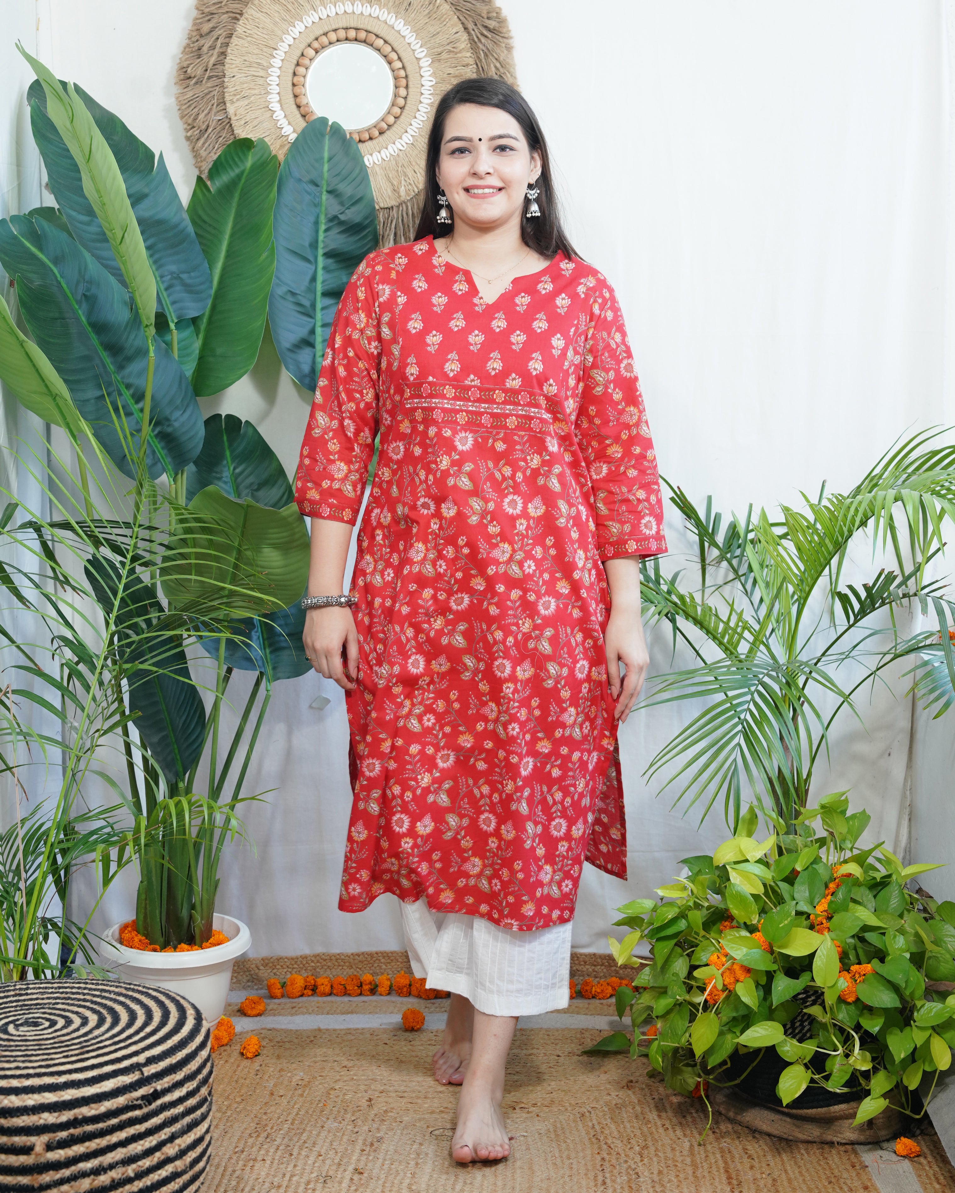Magenta straight fit kurta featuring floral print with a yoke on neck.