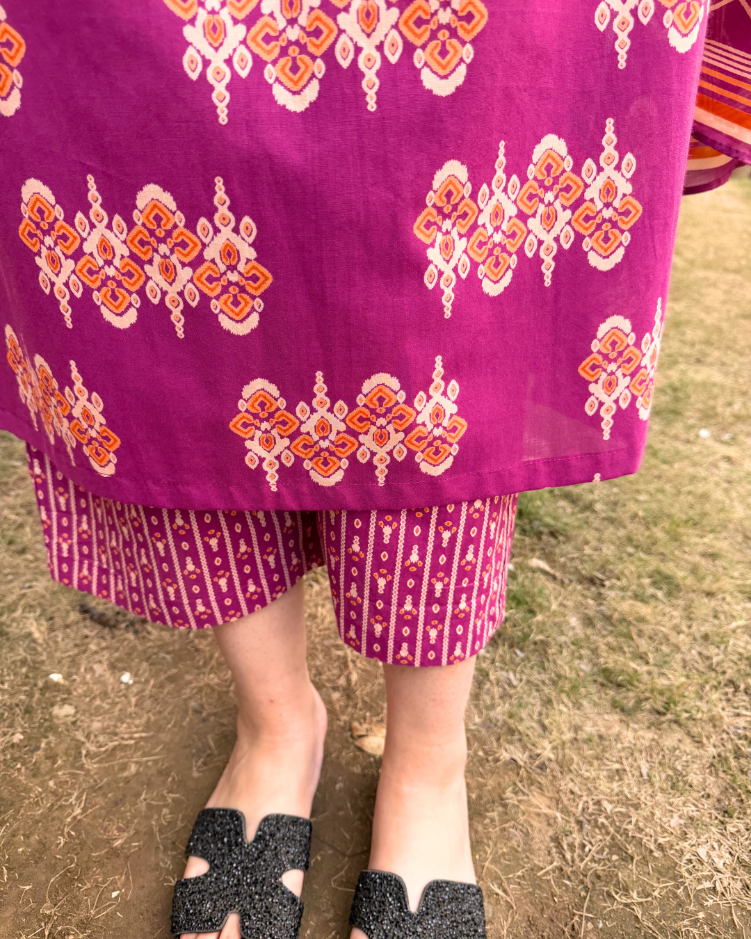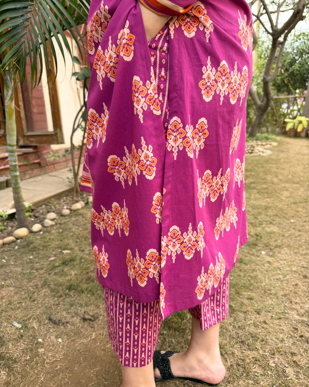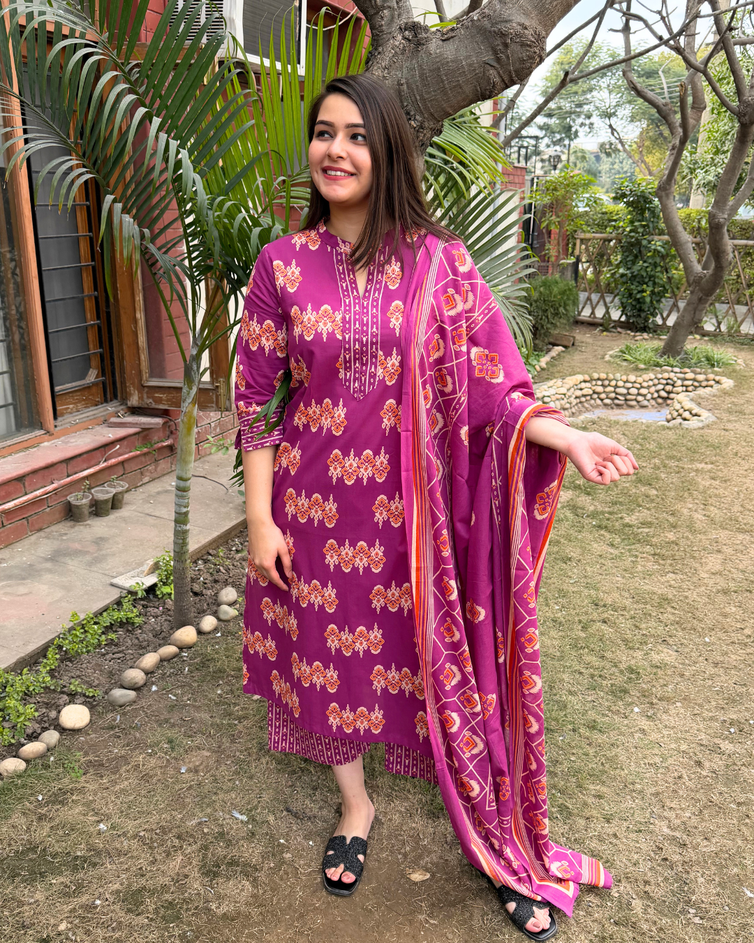 Magenta Rose Sanganeri full suit set with matching duppata and palazzo.