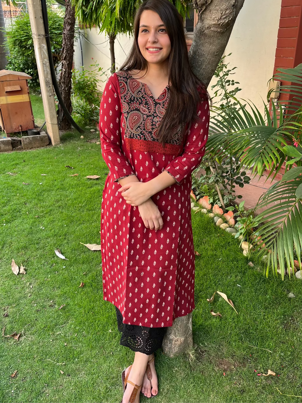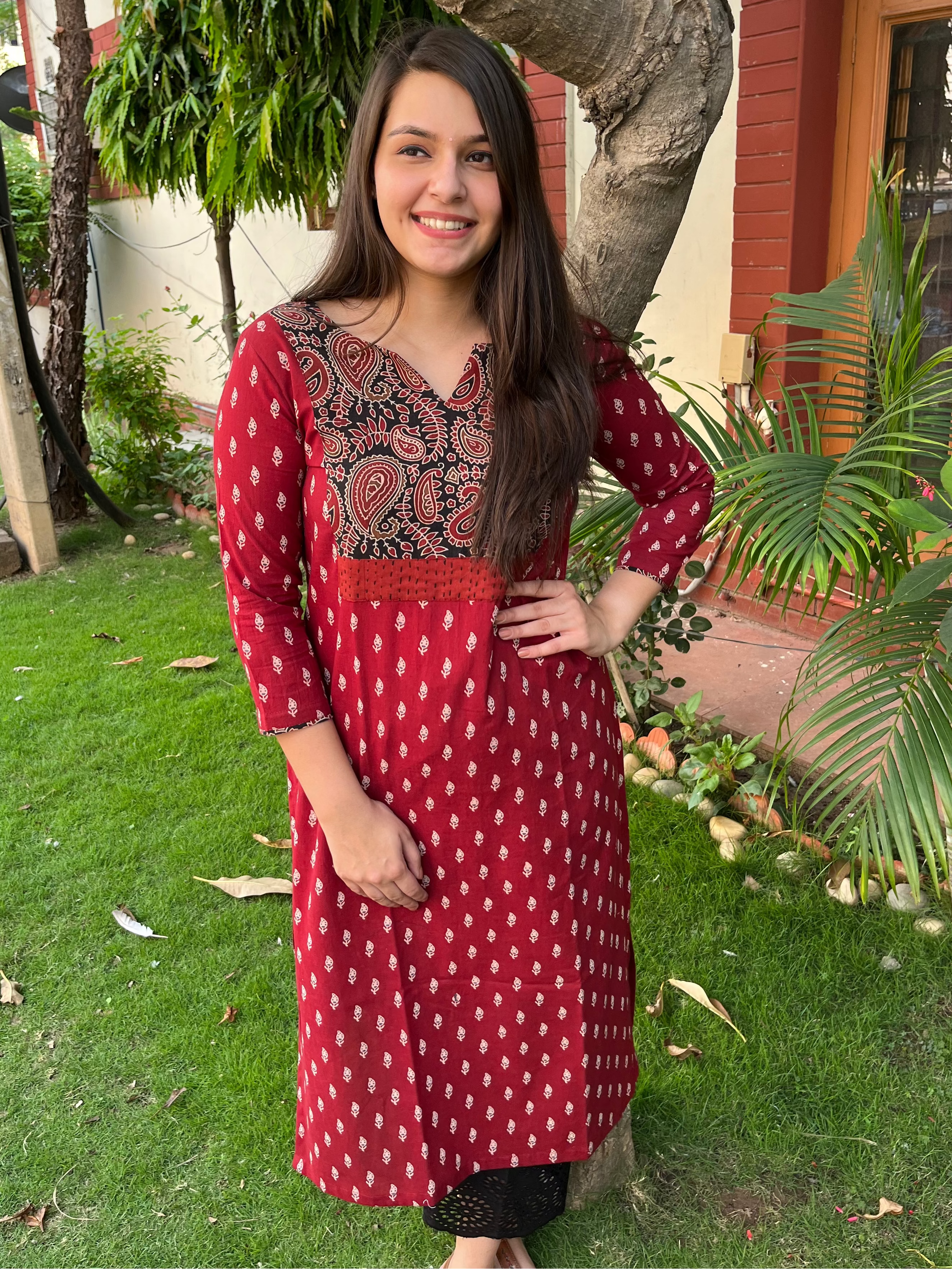 Maroon buti Ajrakh Yoke kurta