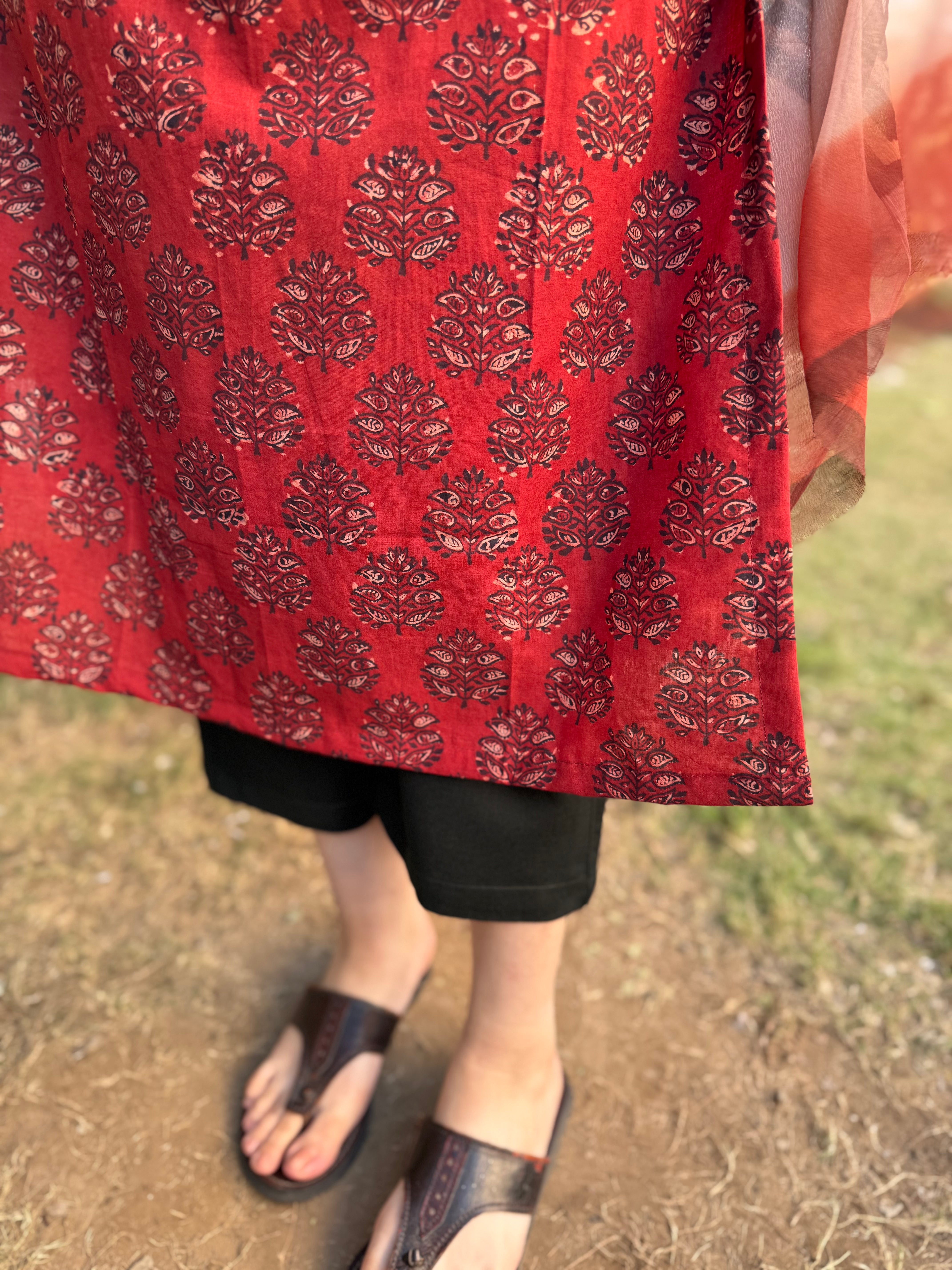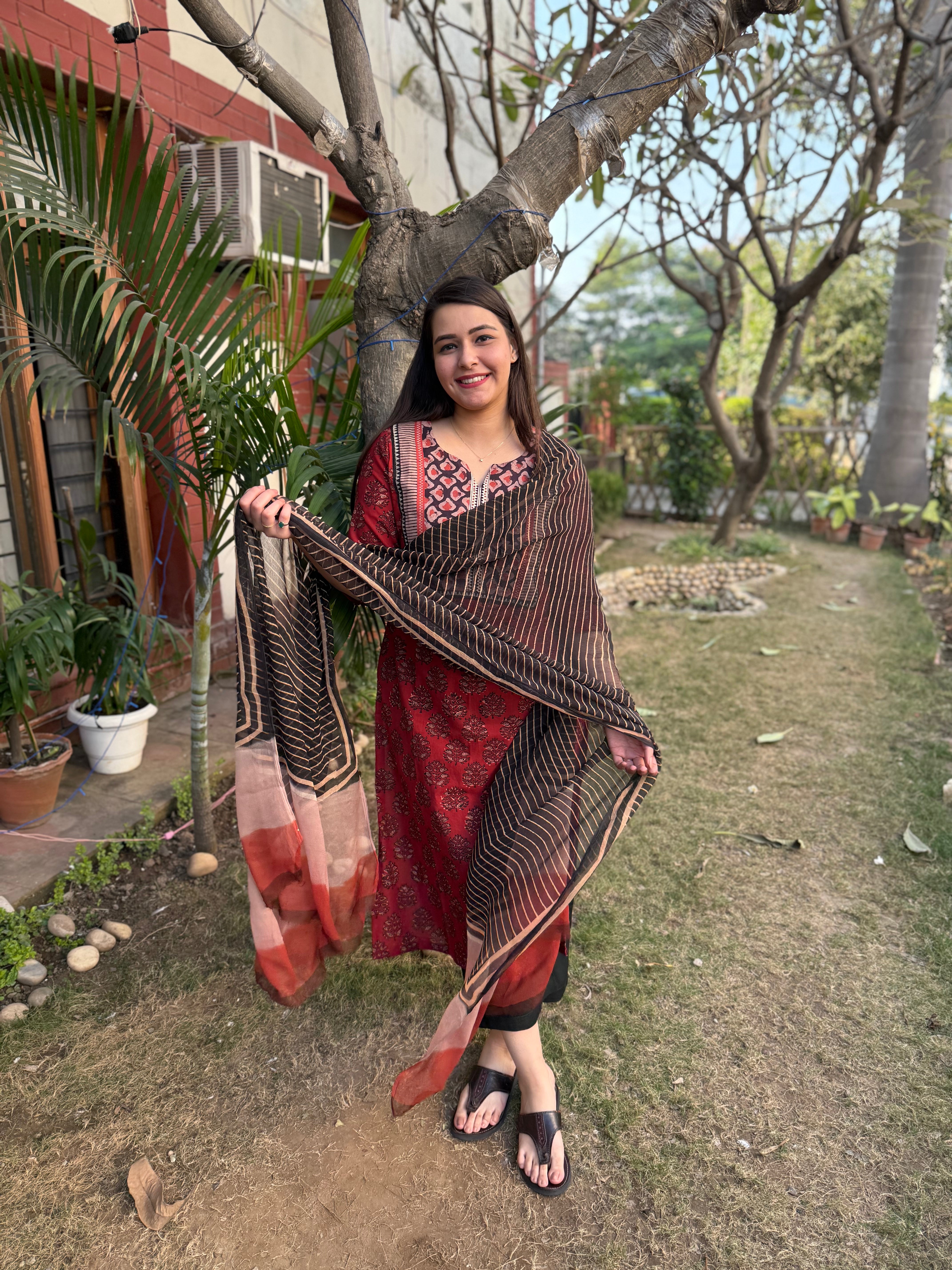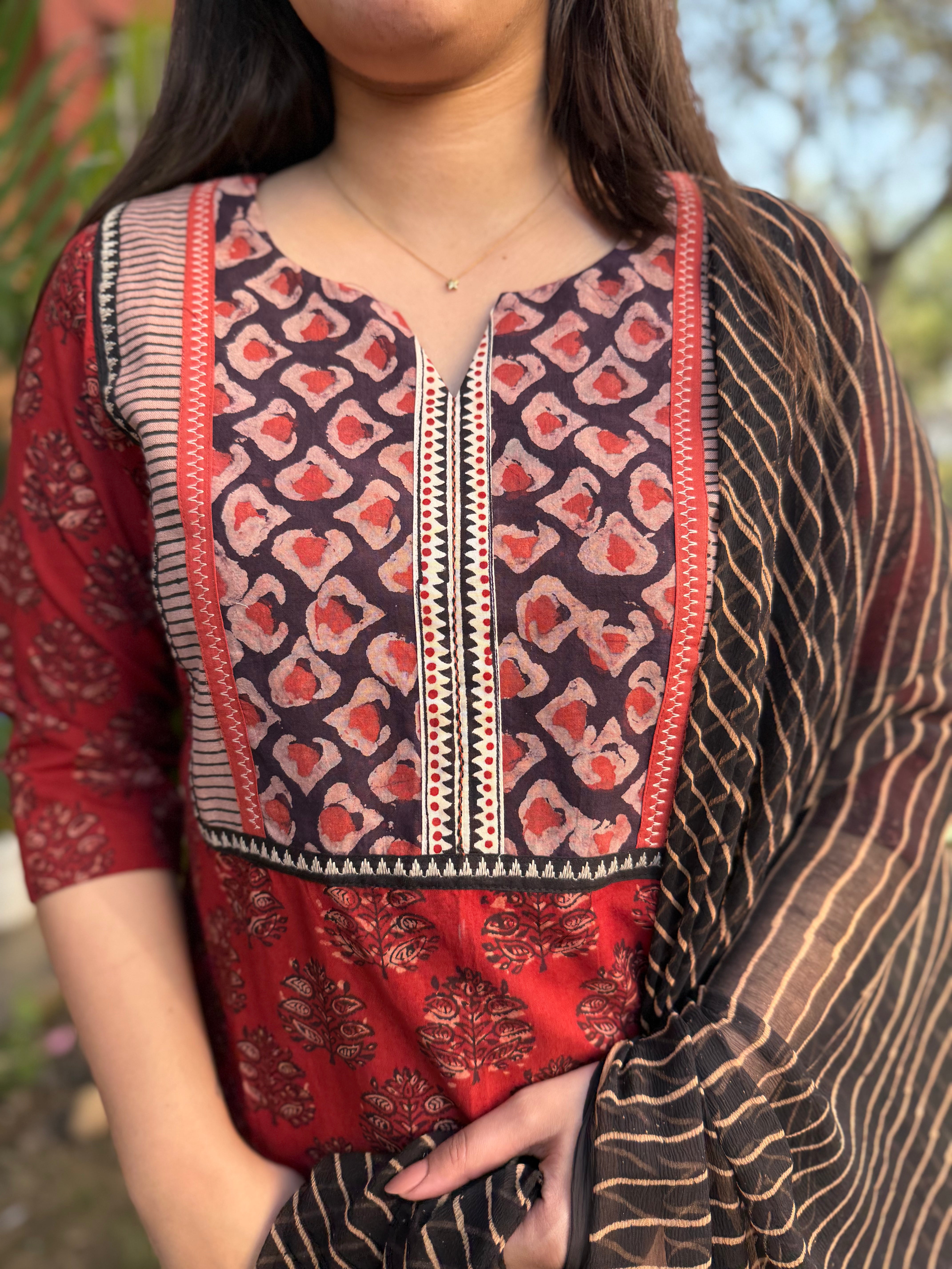 Jaipuri handblock printed cotton suit set with yoke on neck. Matched with gorgette duppata.