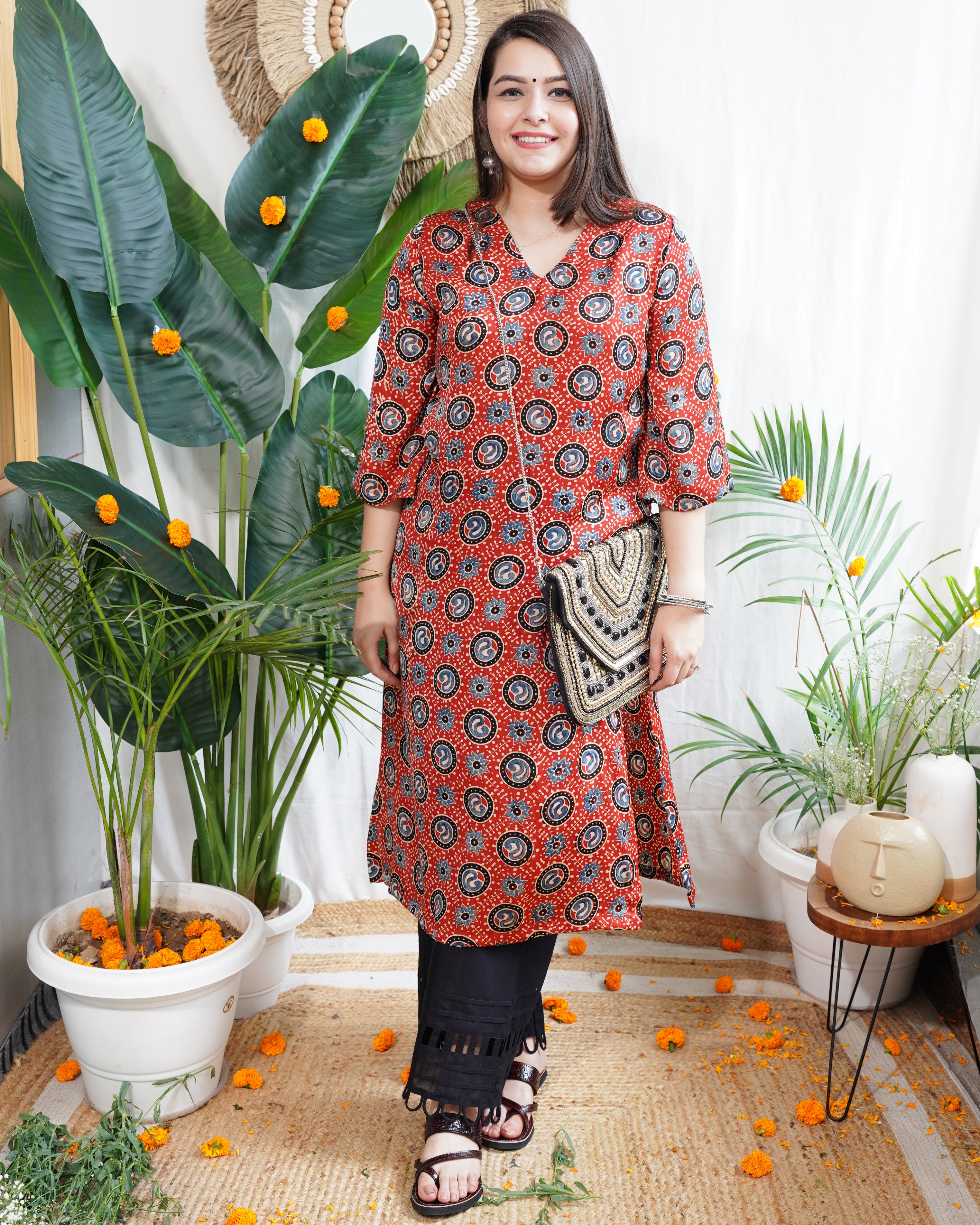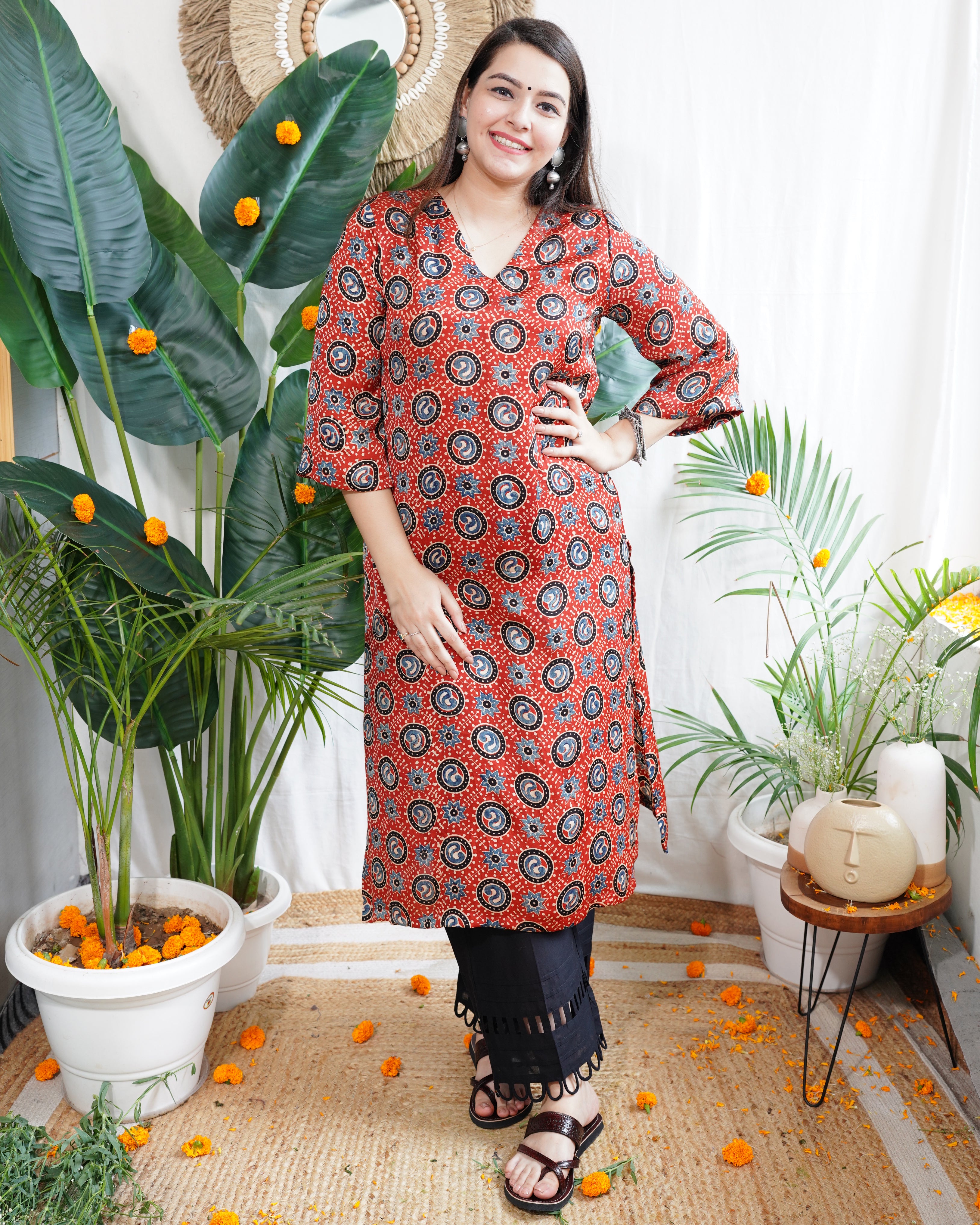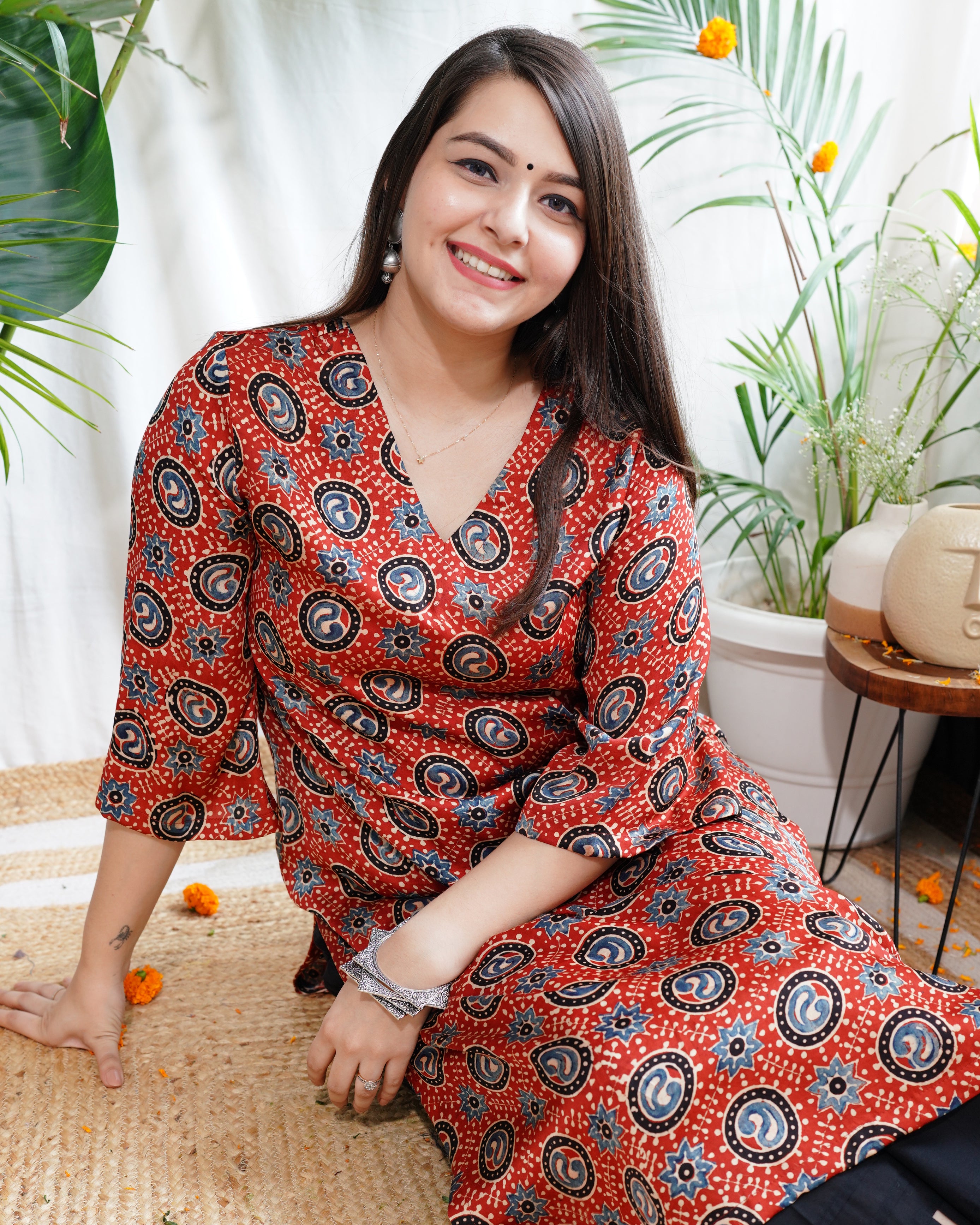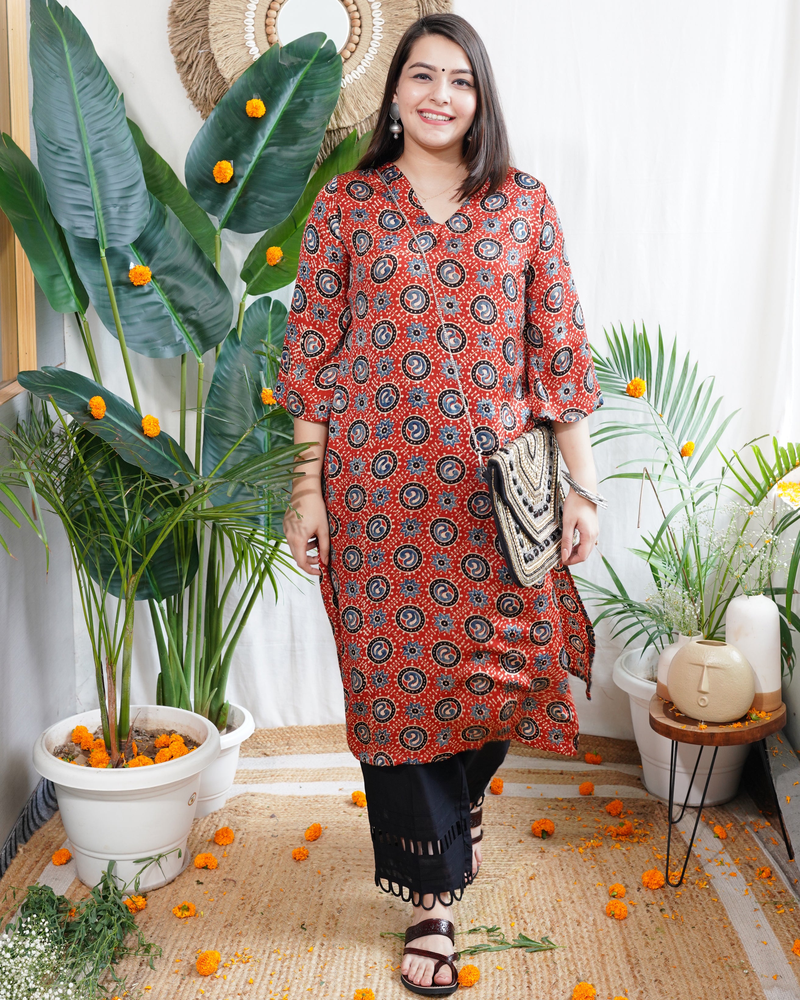 Celebrate the beauty of tradition with our Ajrakh Handcrafted Modal Silk designer panel Kurta.