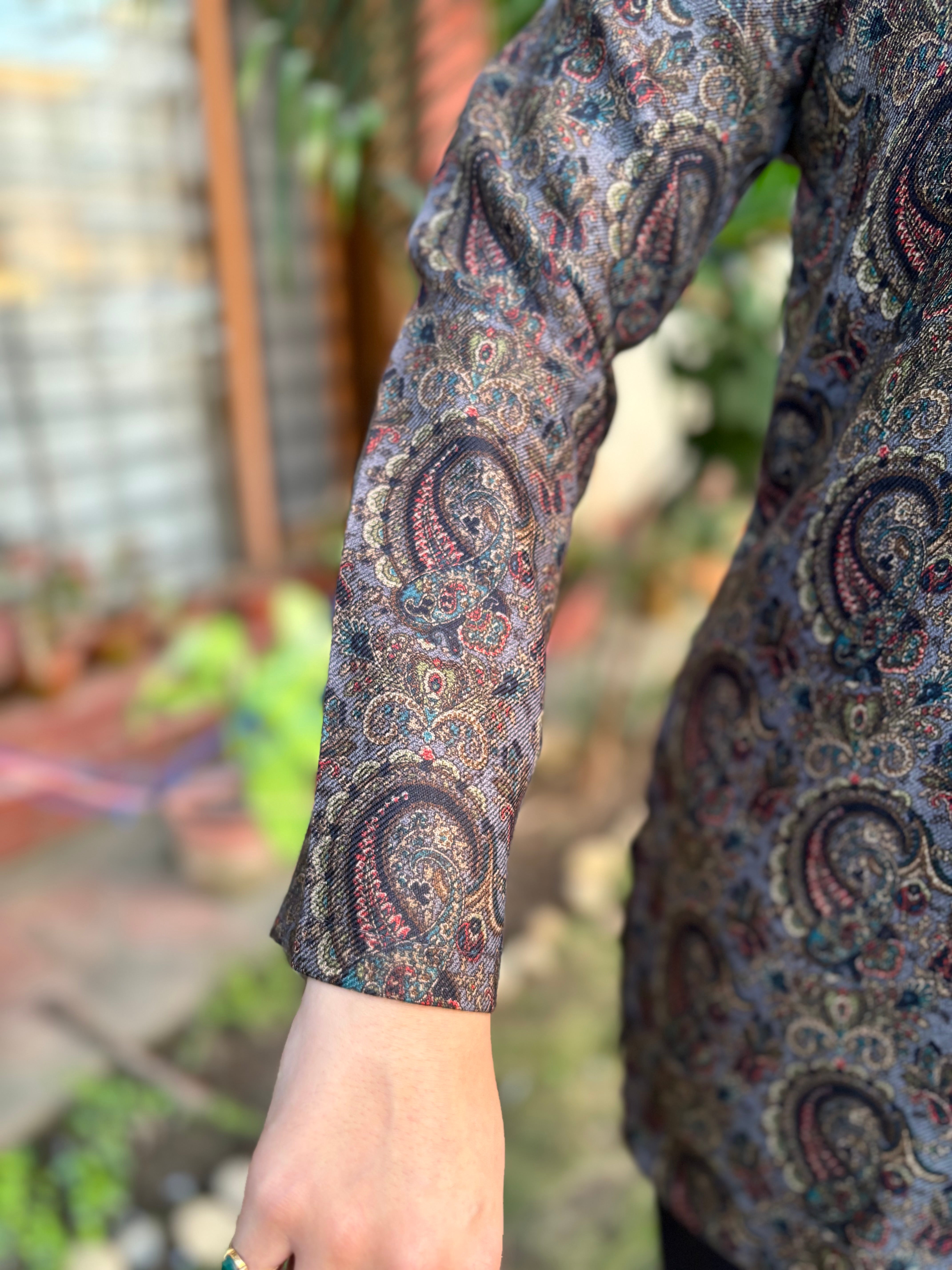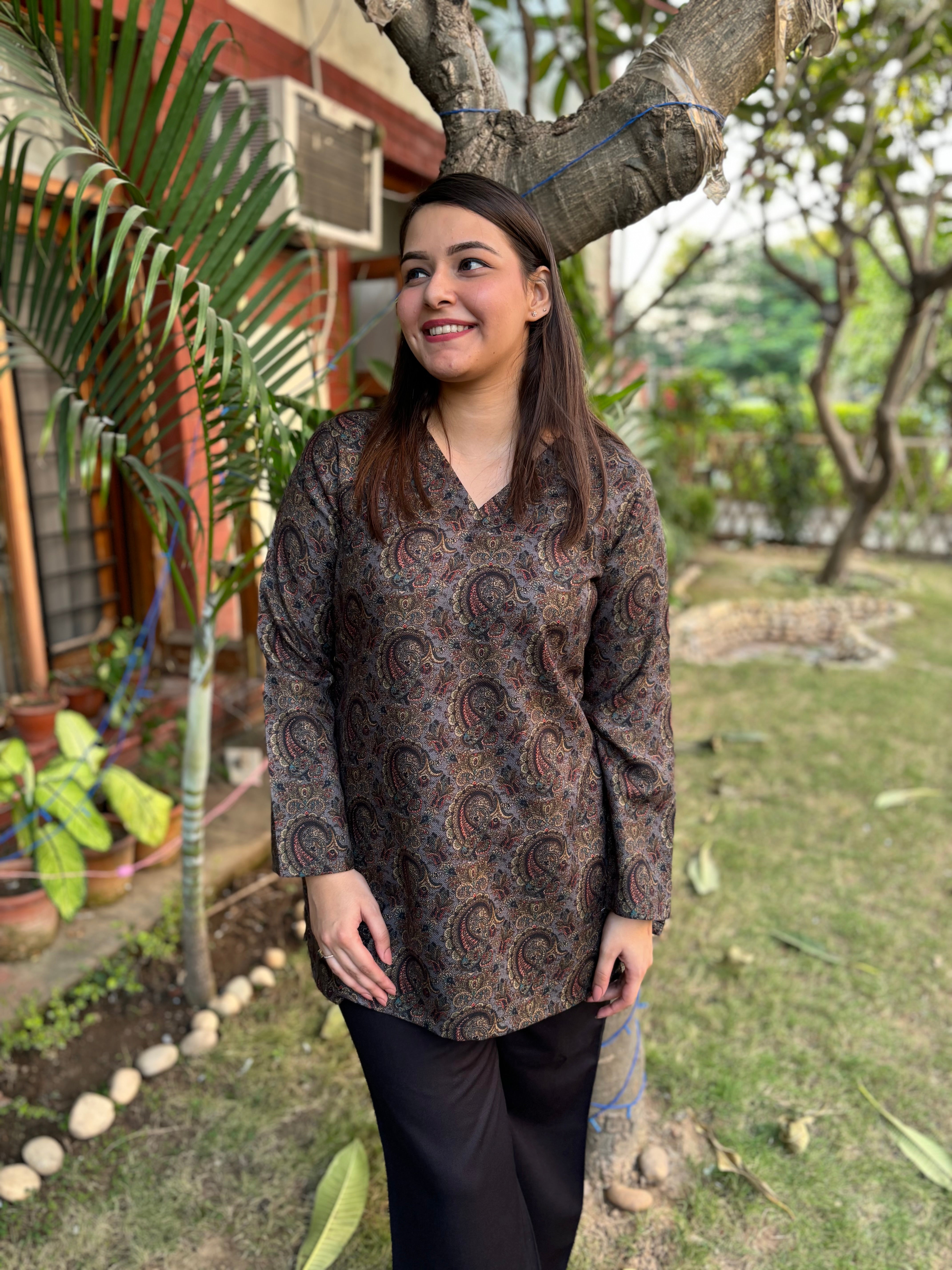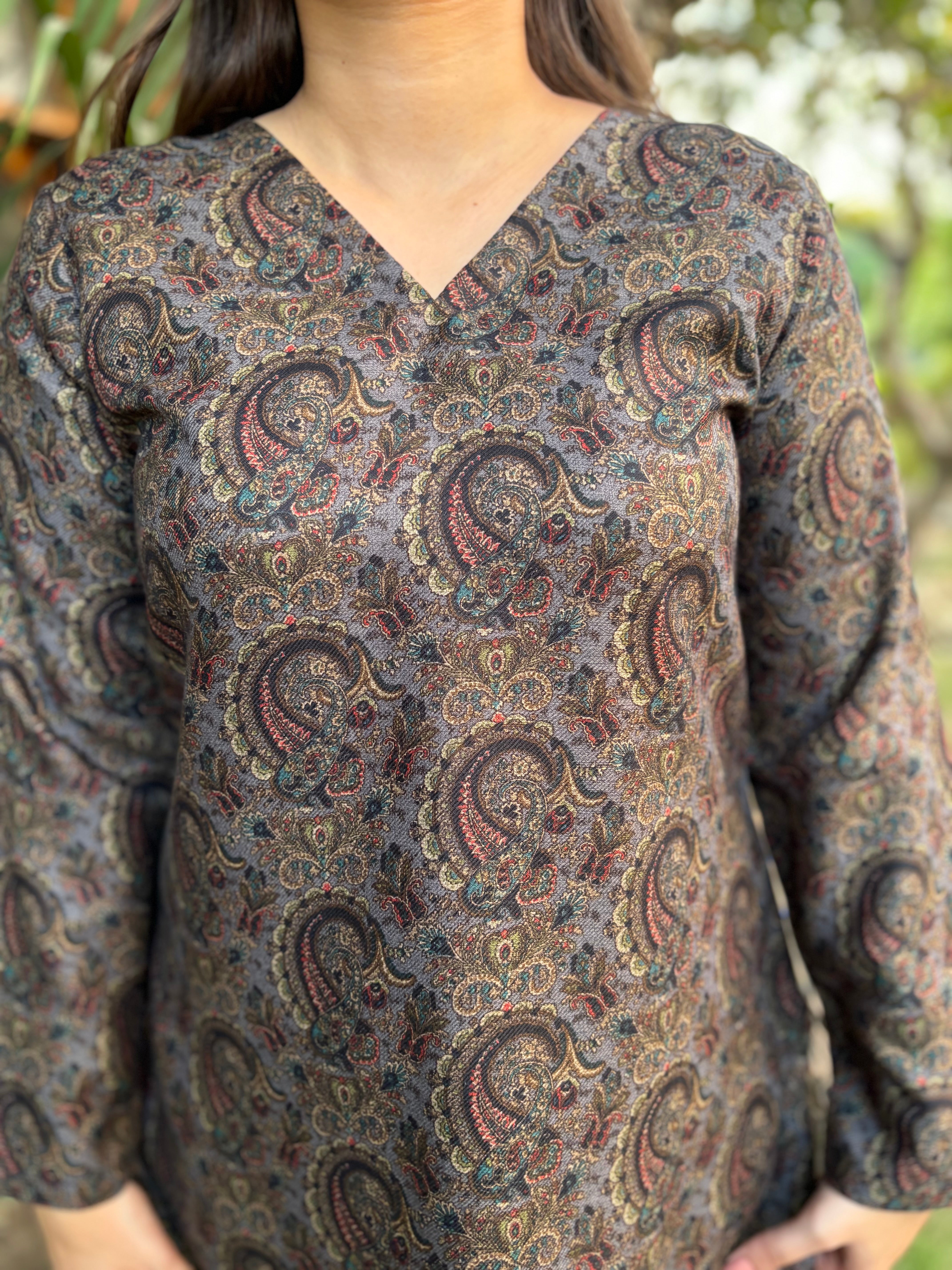 Multi ambi floral woollen short kurti made In soft woollen spun fabric.