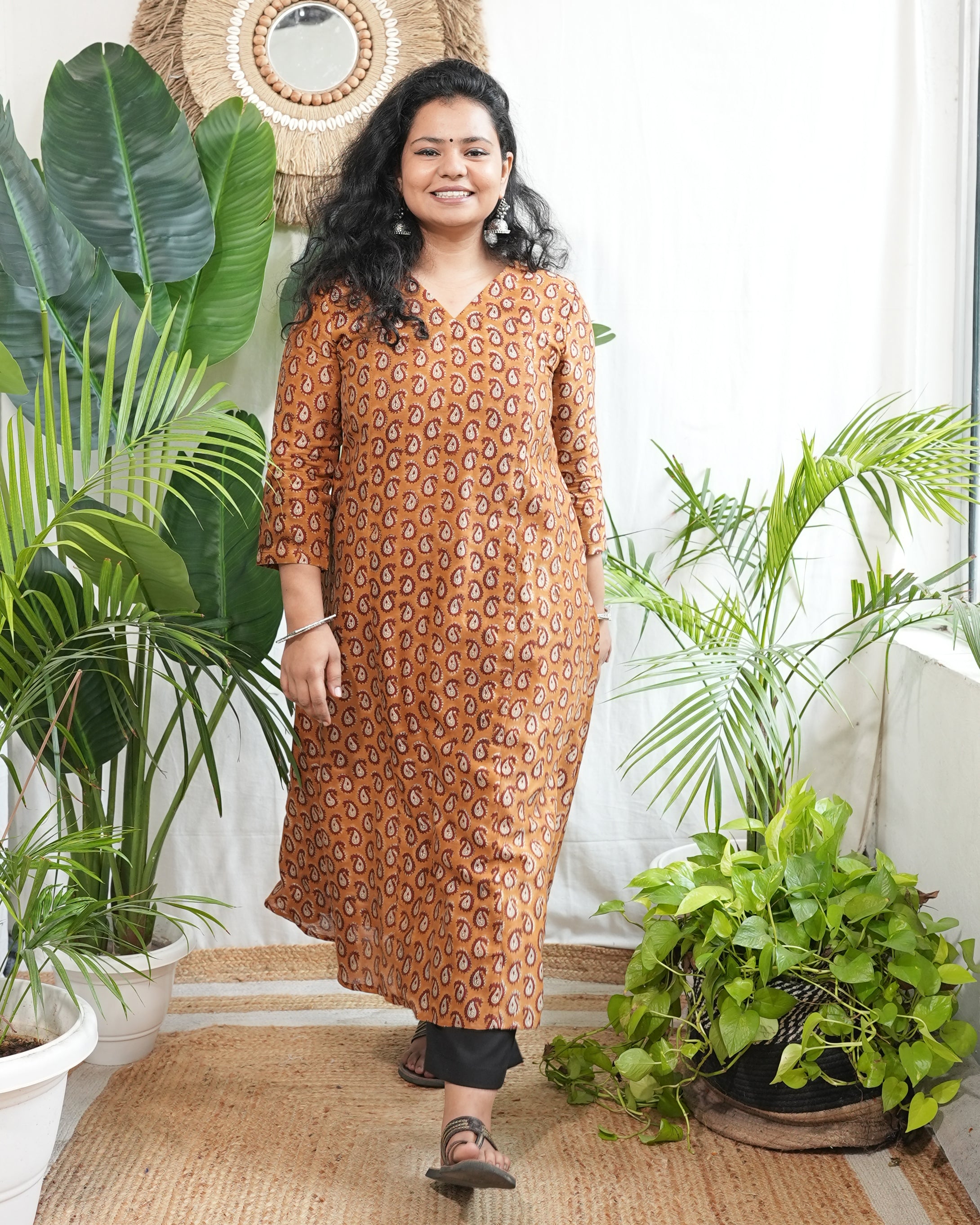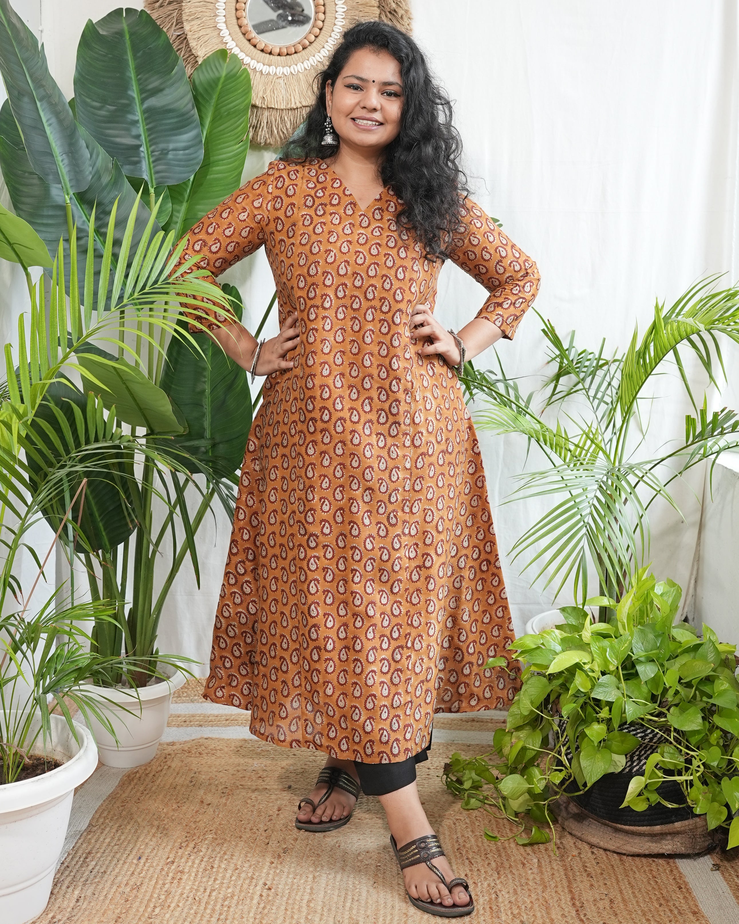 Chanderi A-line kurta with side pocket, offering a blend of comfort and everyday charm. Stitched with 100% cotton lining inside.