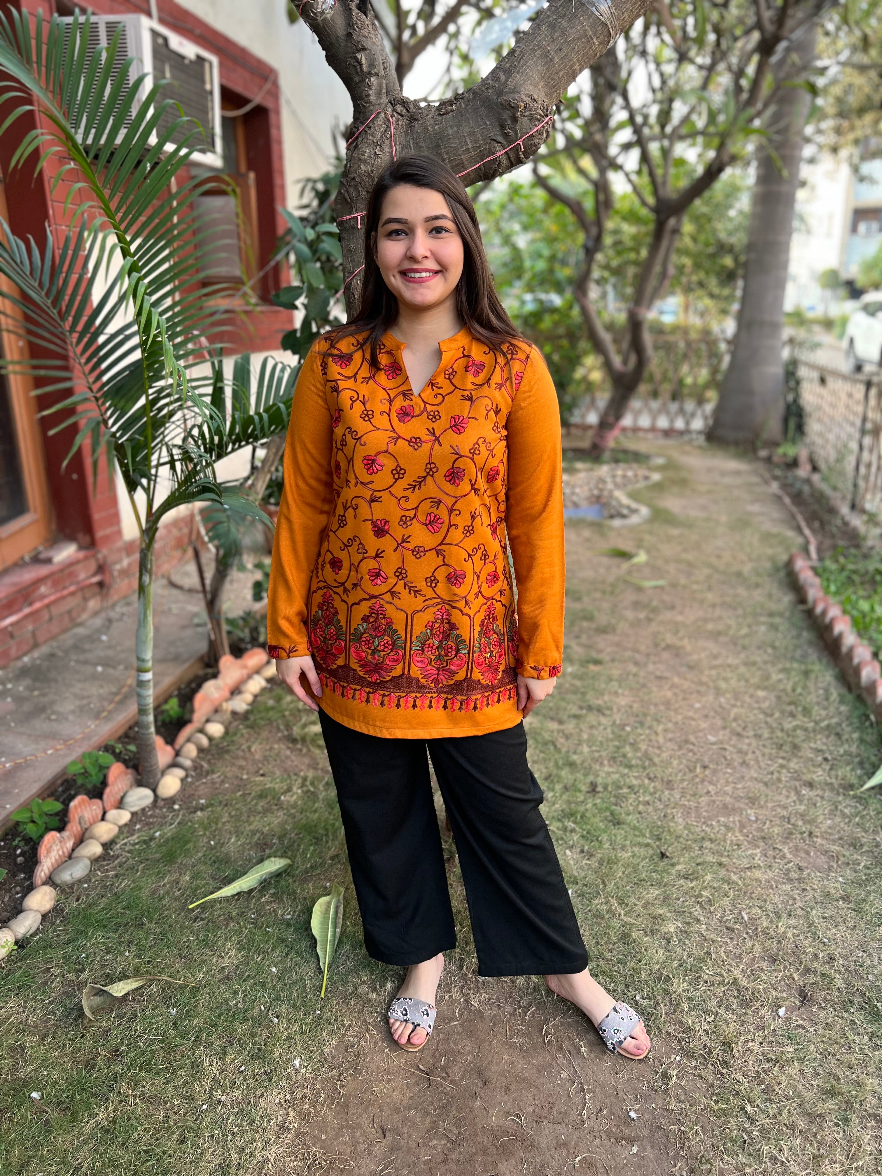 Mustard color Woollen short kurti with Kanni embroidery.Made in woollen spun fabric.