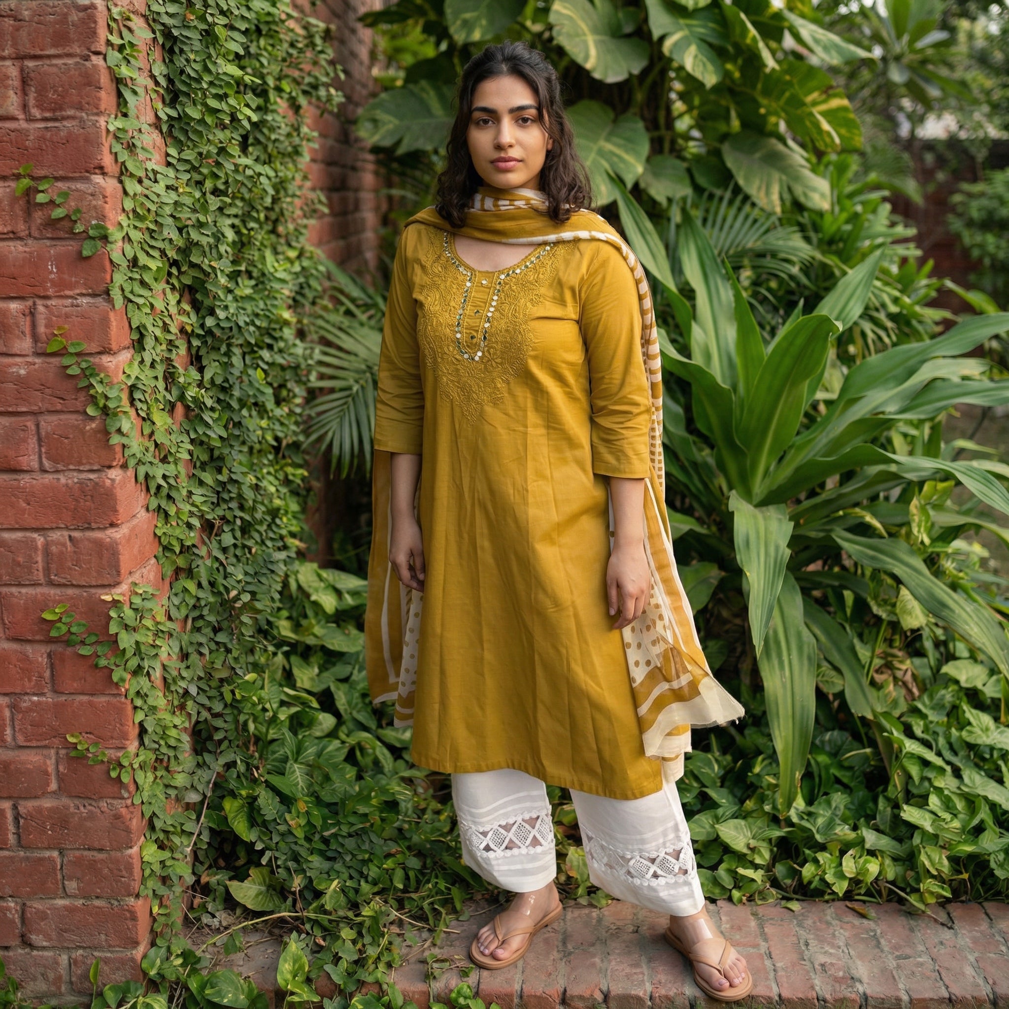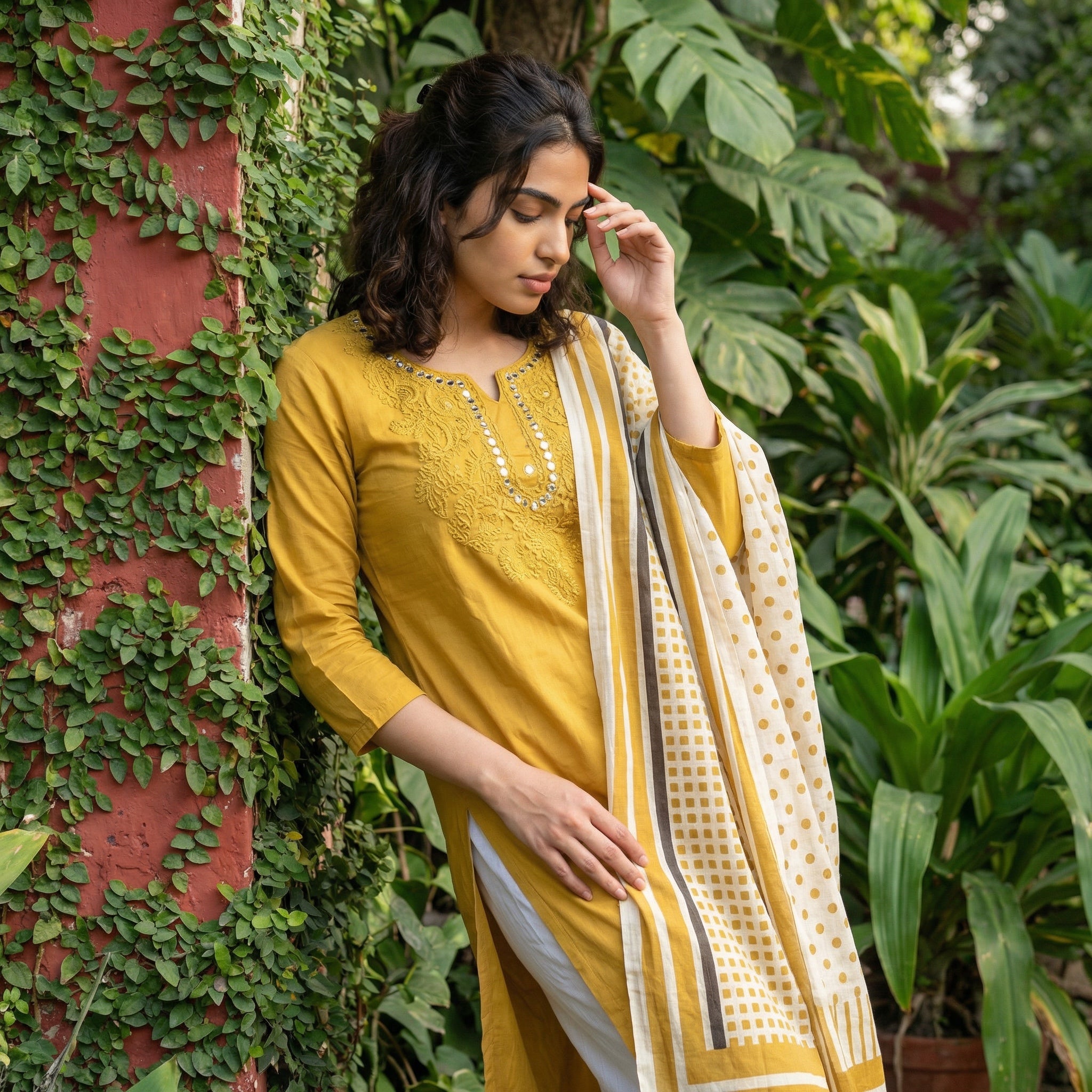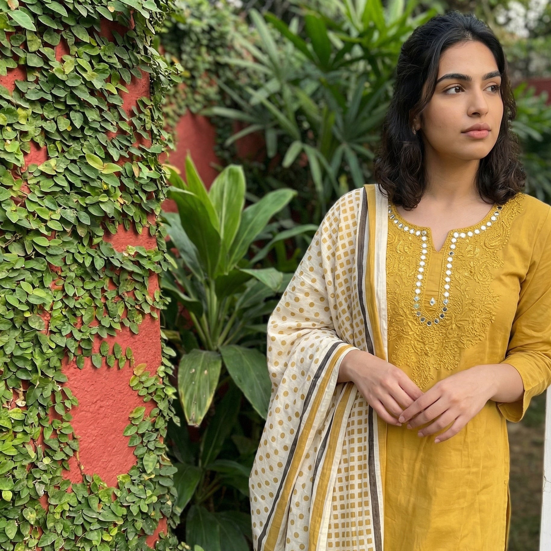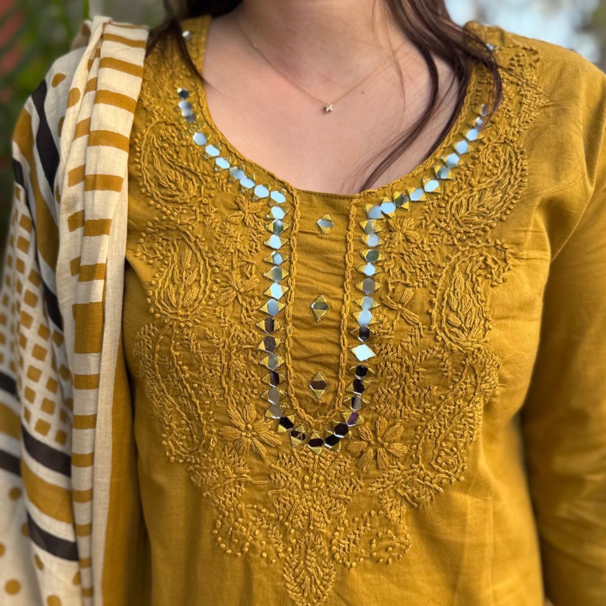 Embroidered cotton Kurta with thread and mirror work matched with handblock printed duppata. This is the price of kurta and duppata only.