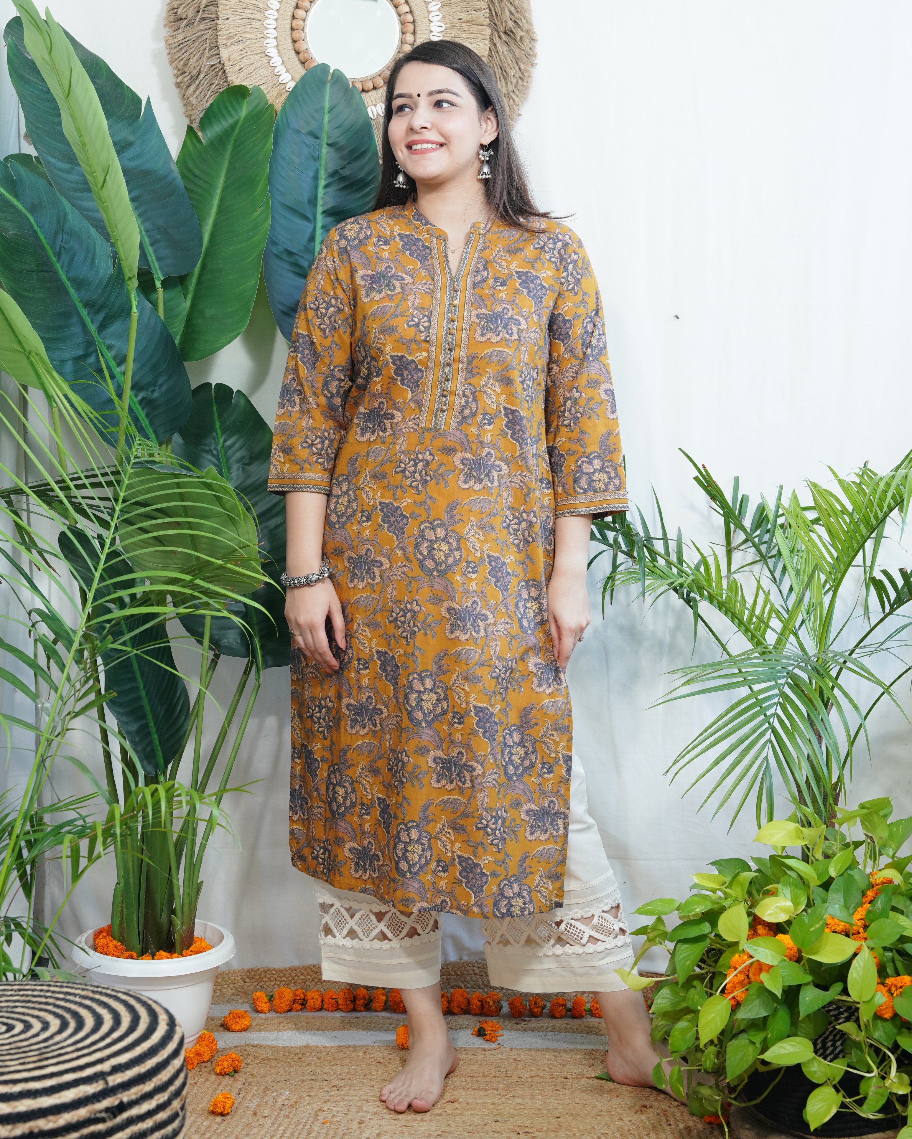 Light fabric that falls easily on the body and looks flattering. I loved the Kullu borders on the neckline and sleeves. Only suggestion I have for the team is not to call the colour 'rust'. Compared to the image shown, the colour is not bright and definitely not rust. Its more like a mustard and brown mix. Goes very well with the borders so no complaints :)