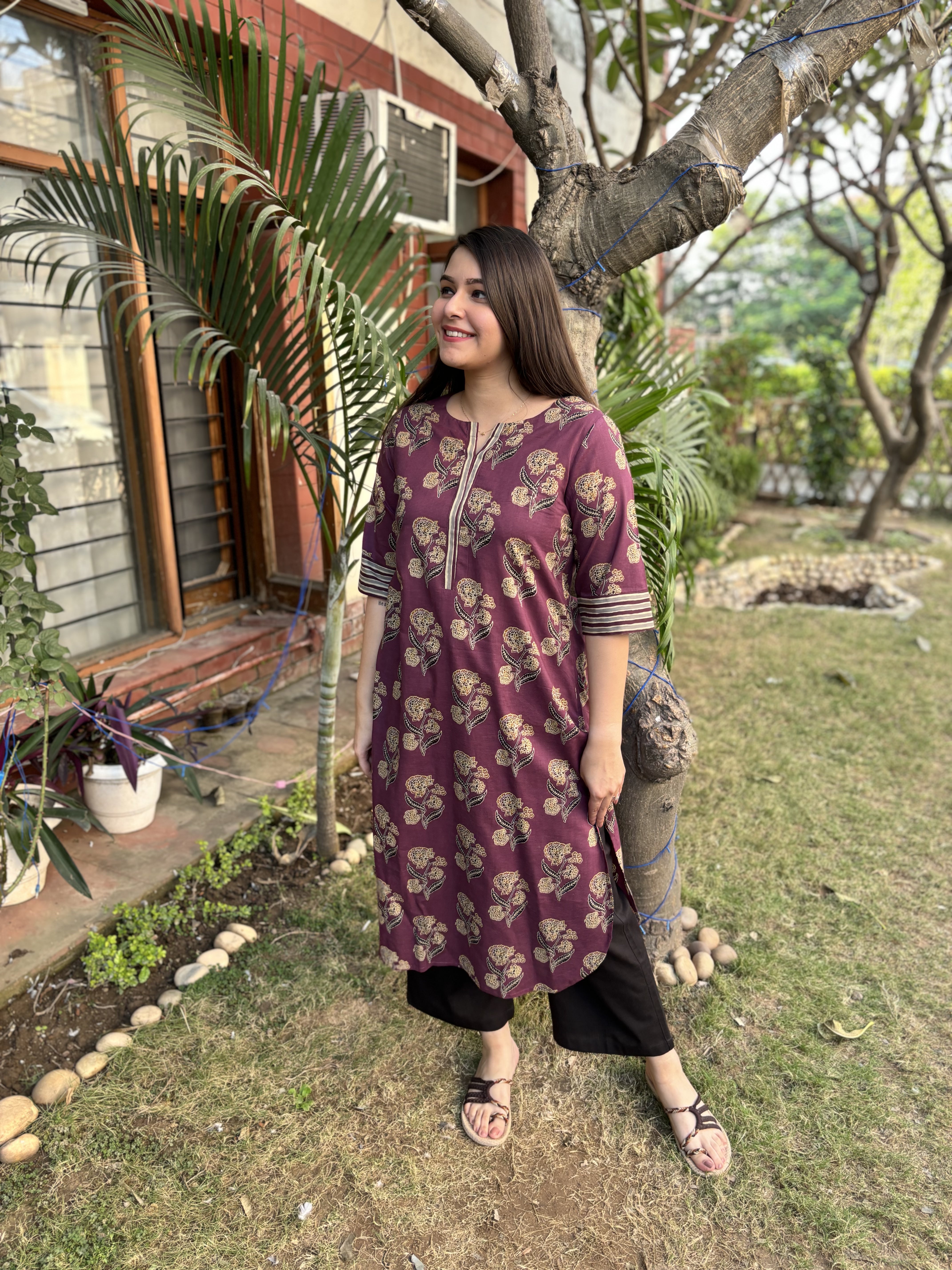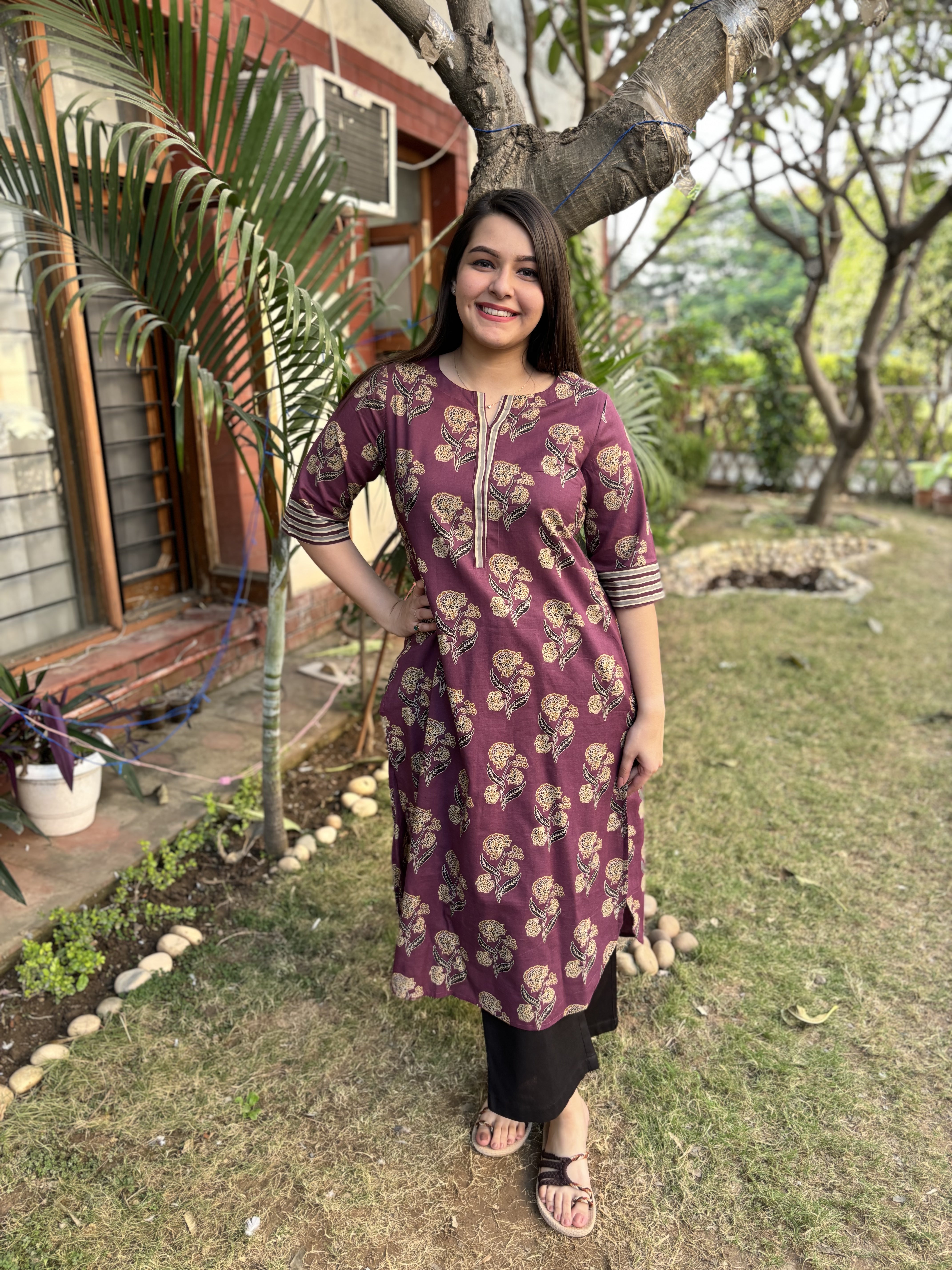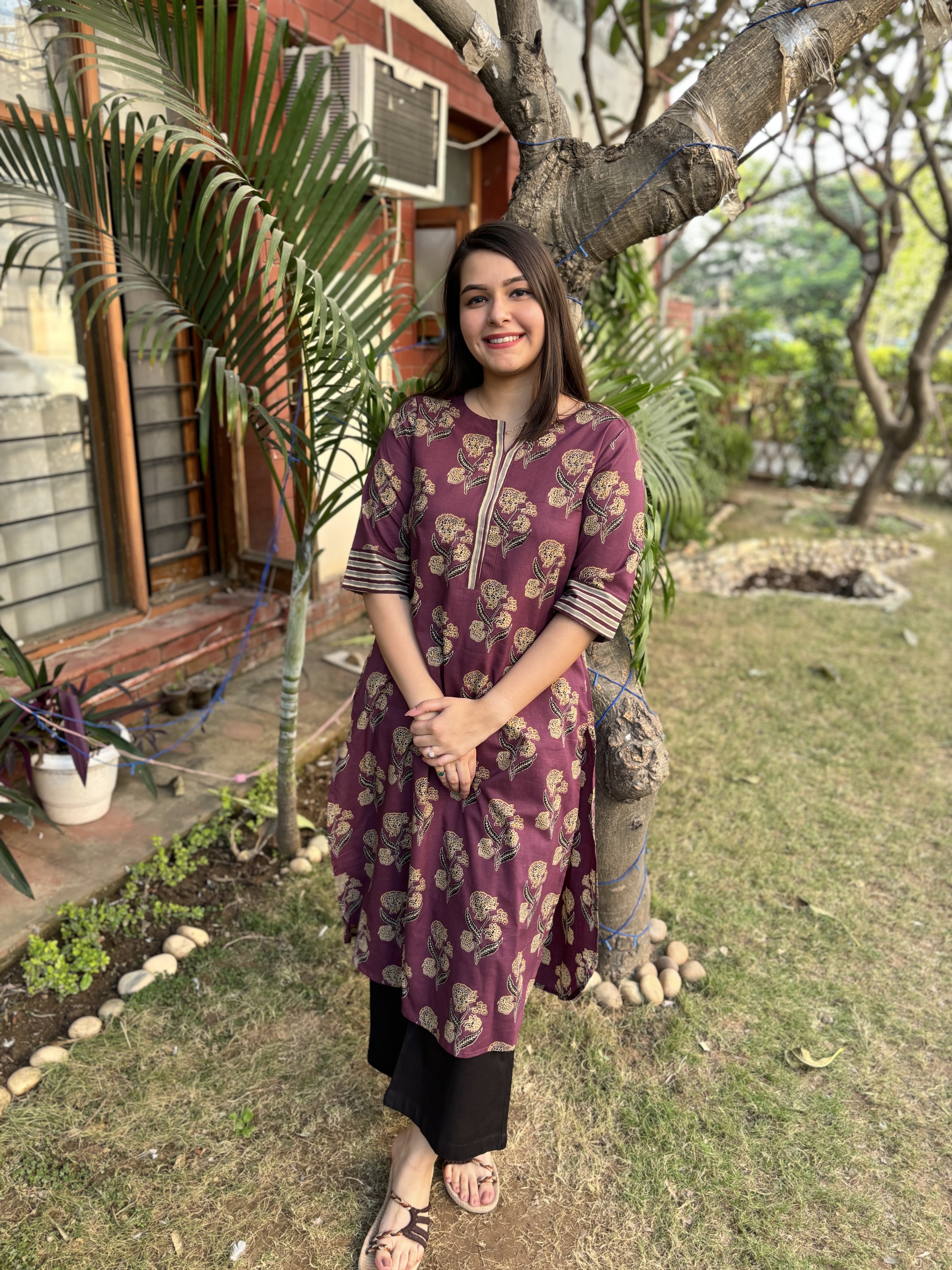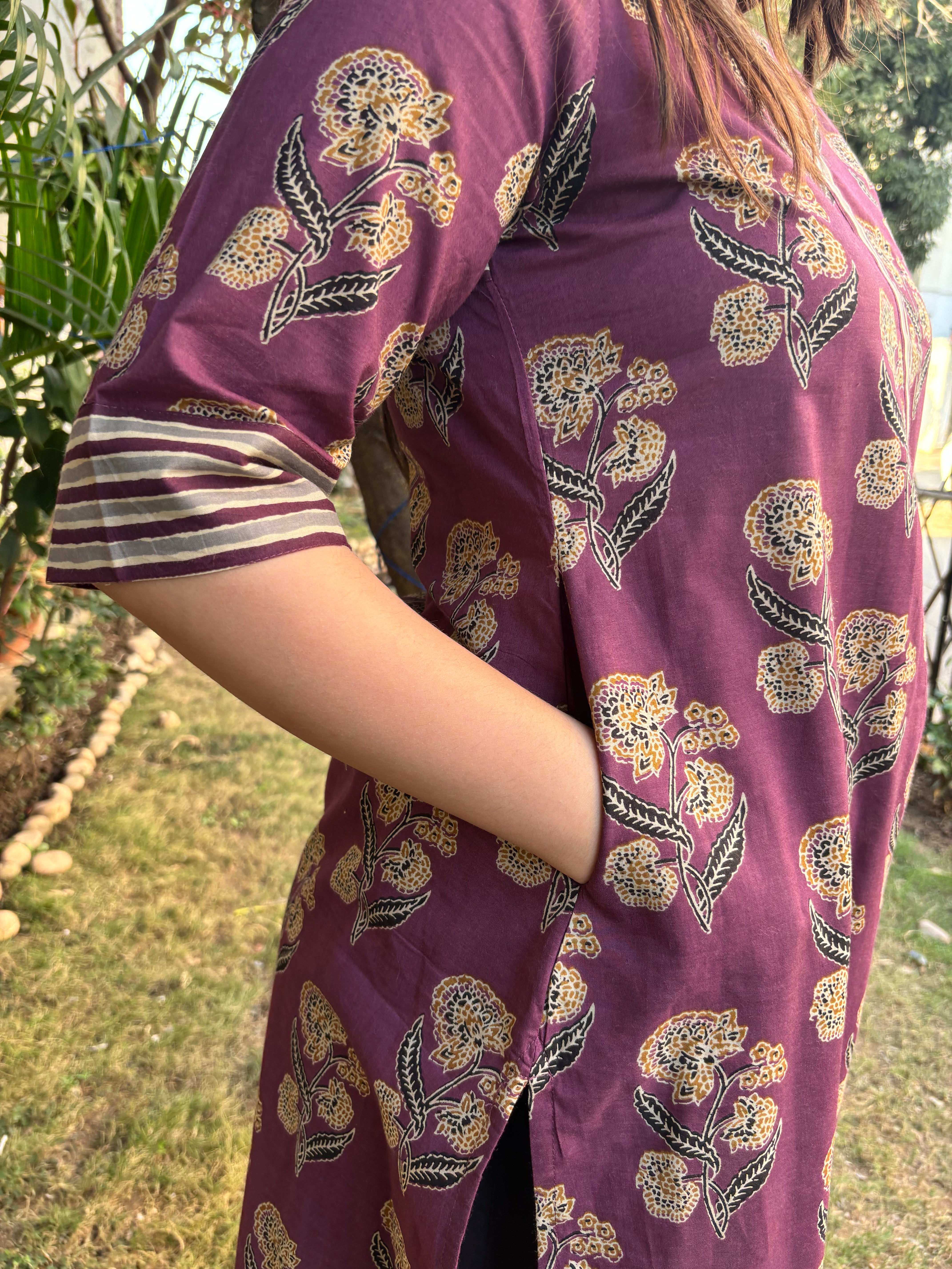 Purple Big flower cotton Kurta with pocket and back pleat.