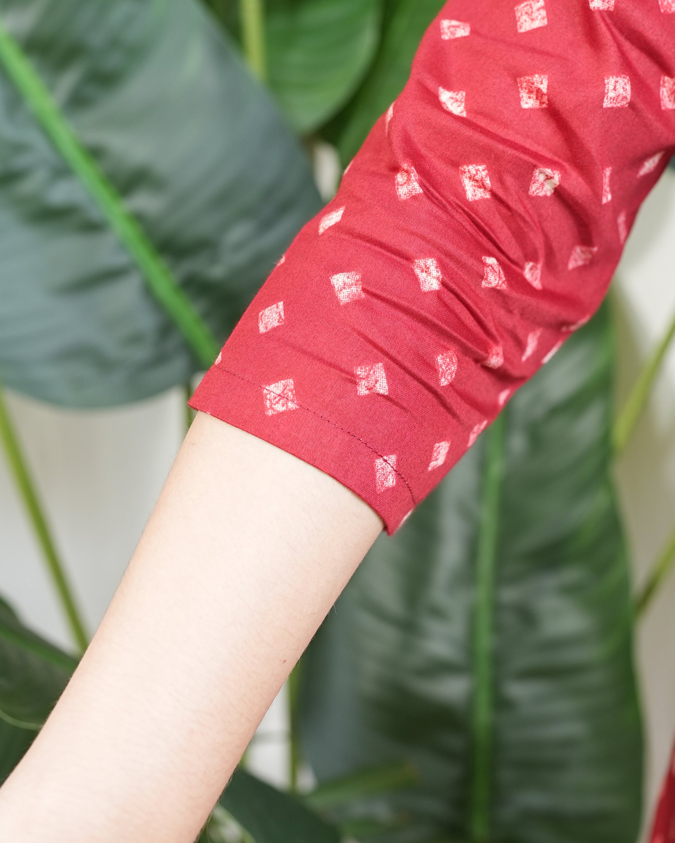 Red Bandhini muslin silk straight fit Kurta with shell work on neck.