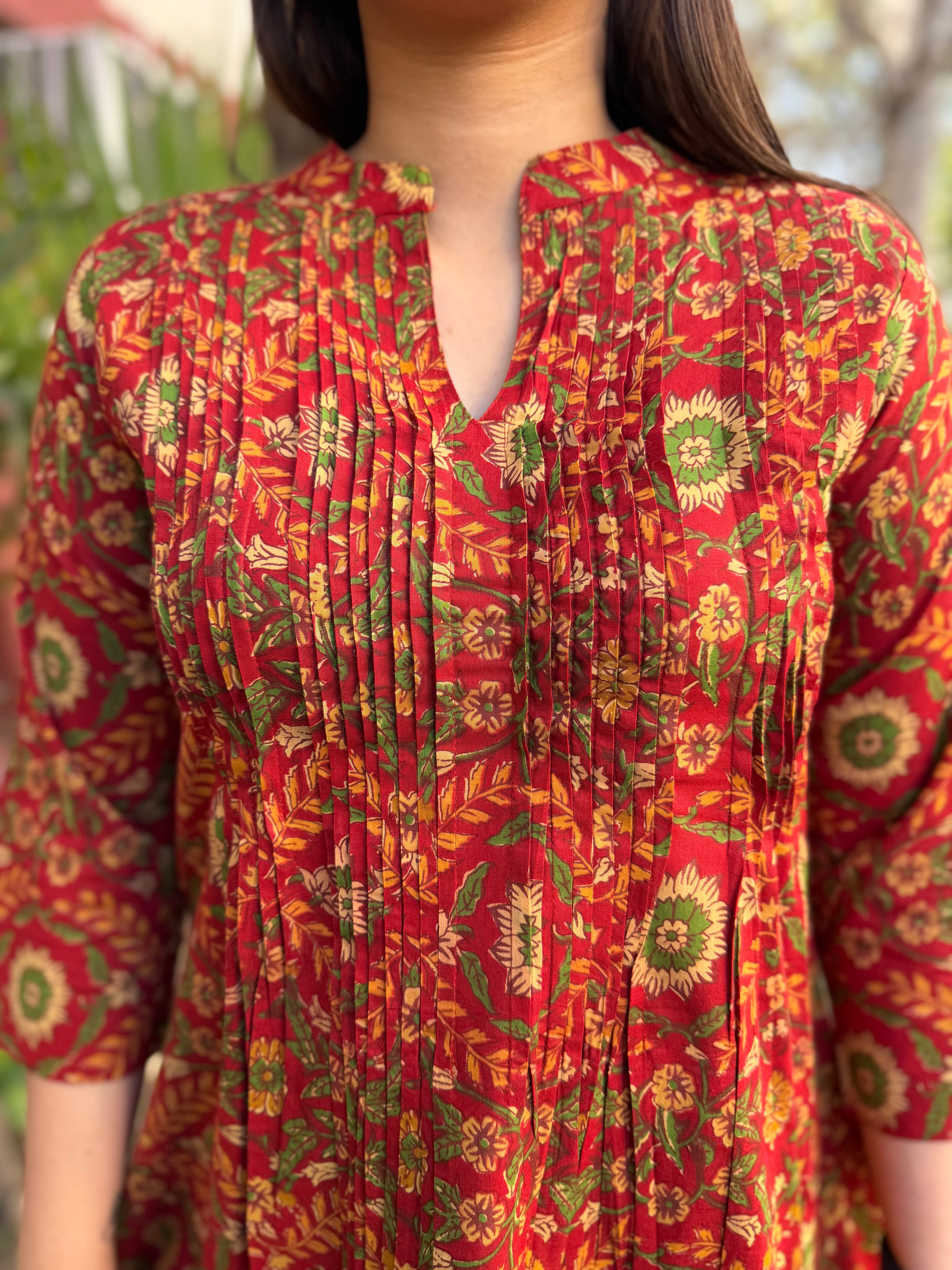 Brick Red floral Sanganeri pintucks top
