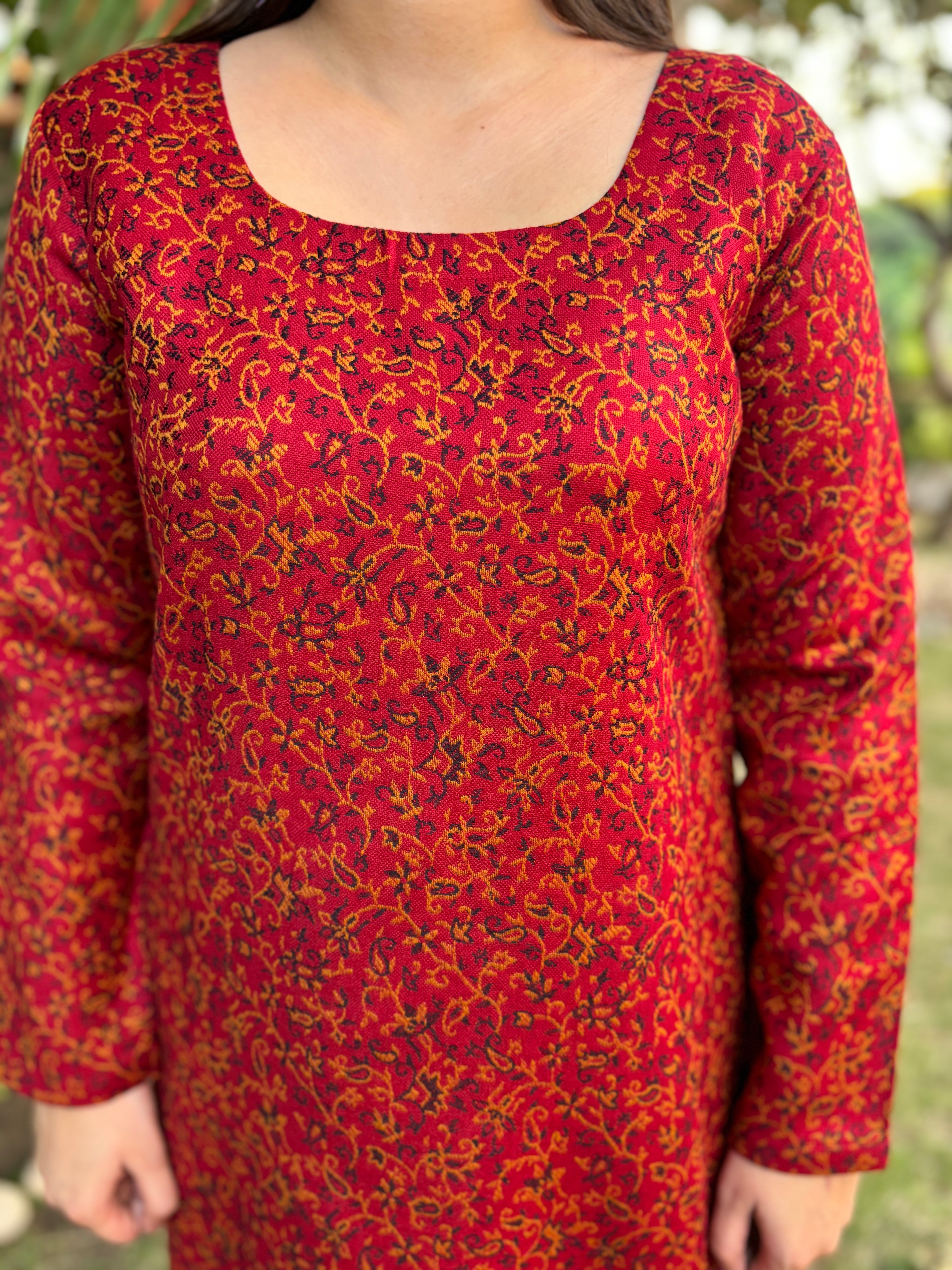 Red floral woollen kurta made in soft spun fabric.