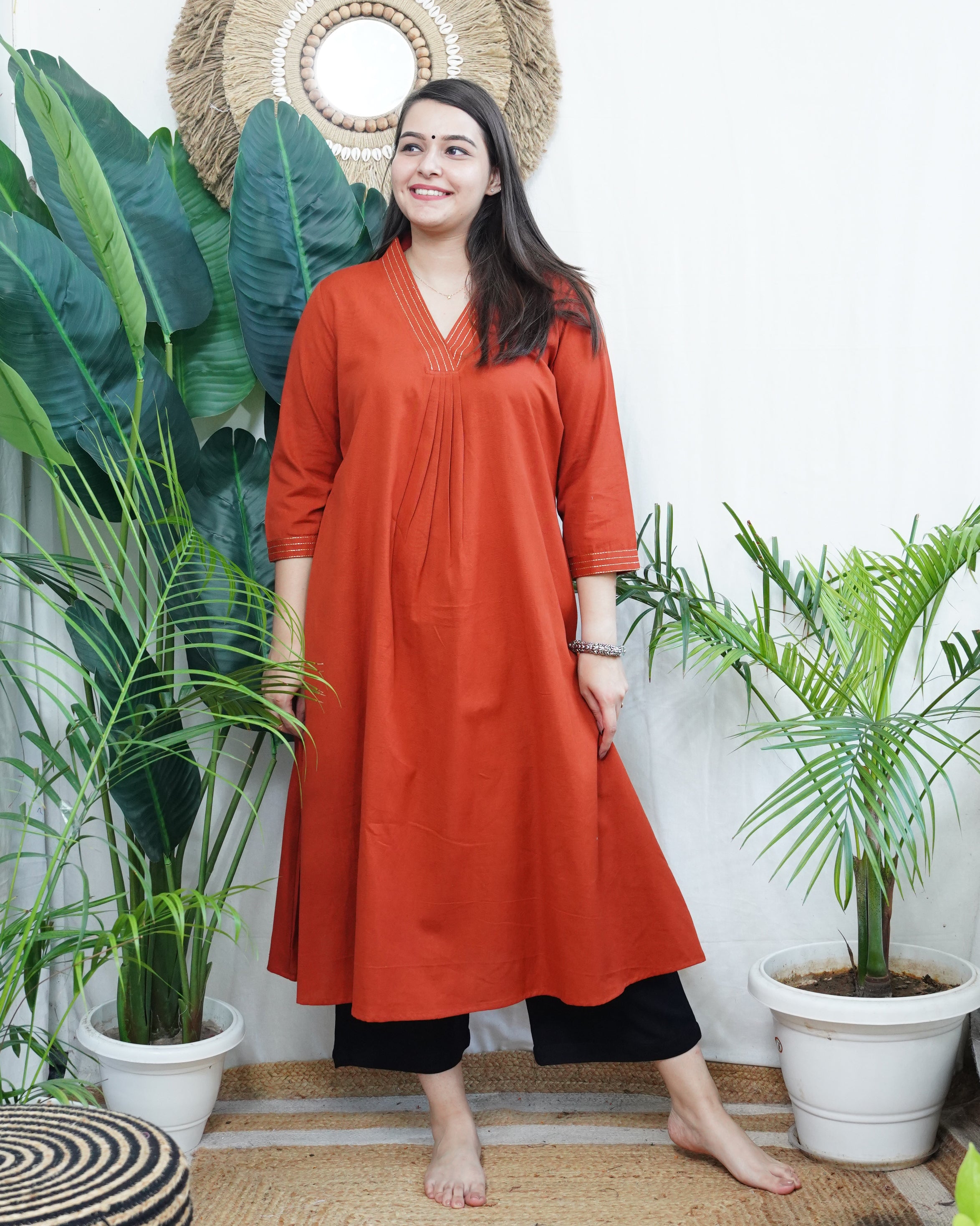 Rust A-line solid kurta with embroidery detailing on neck. Kurta and minimal gather on neck along with pocket.