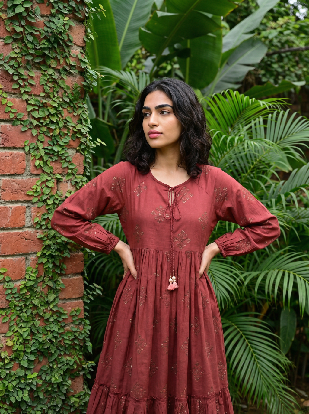 Comfortable cotton dress featuring a beautiful Ikkat print with a relaxed gathered silhouette and tassel neckline. Perfect for everyday wear and effortless styling.