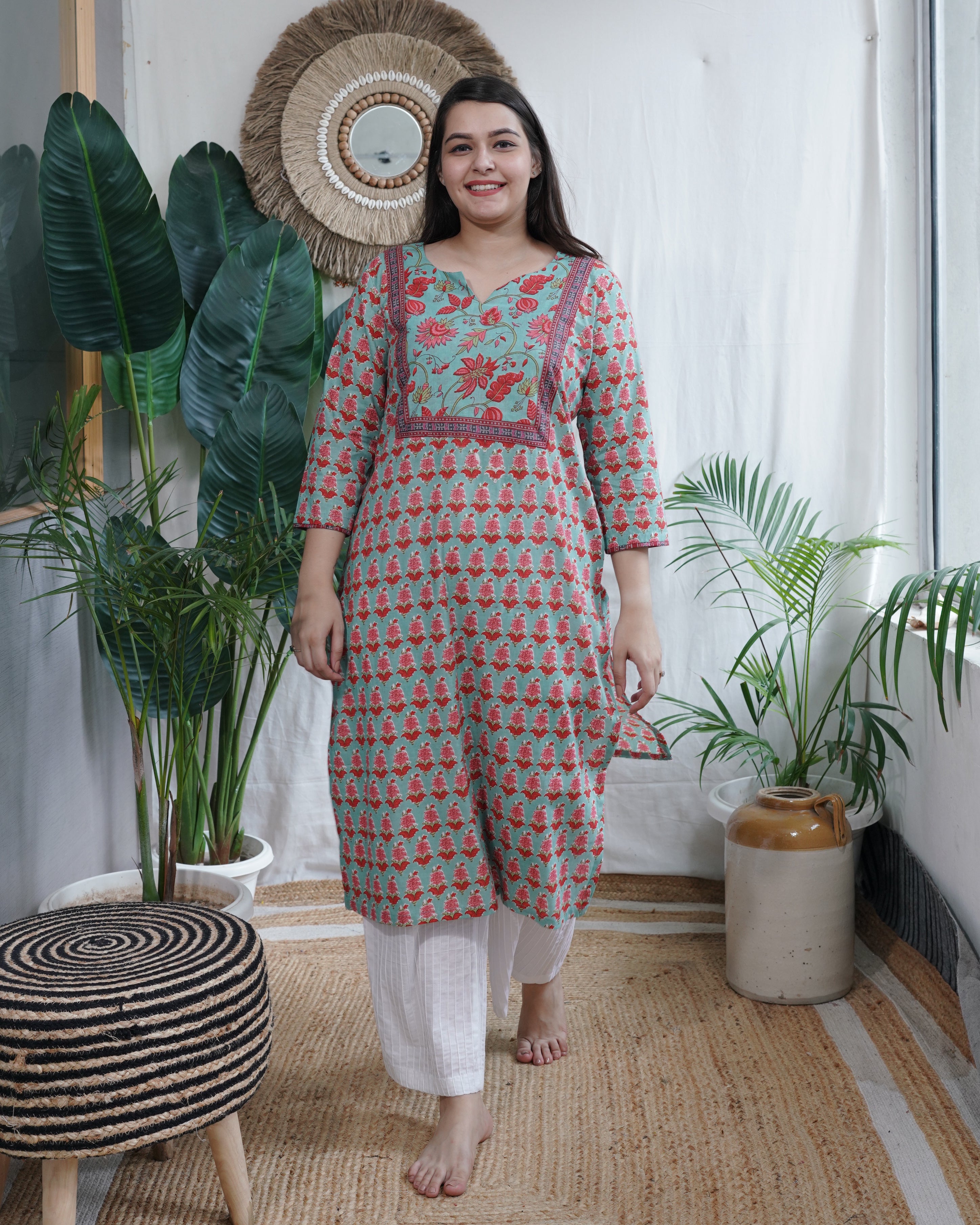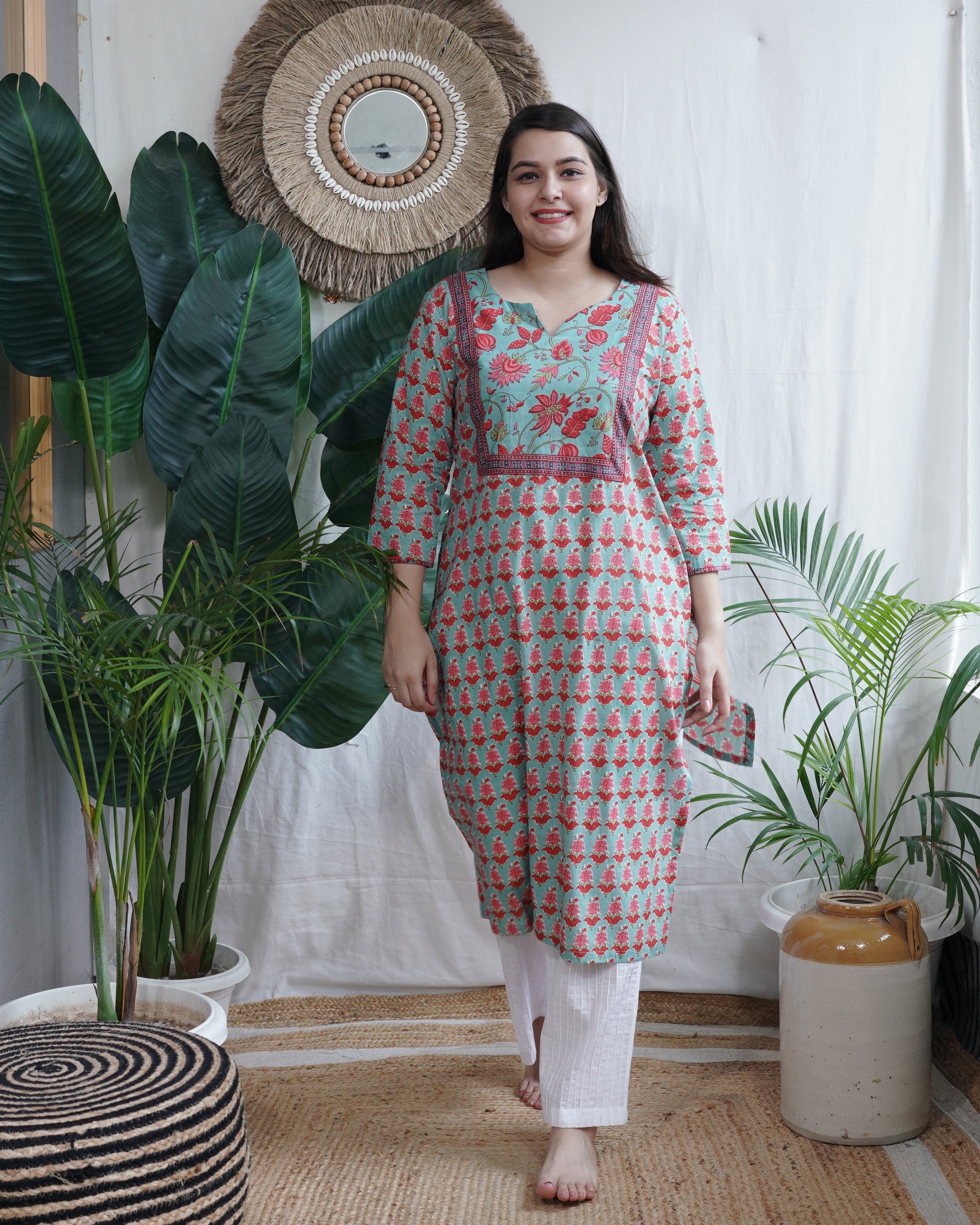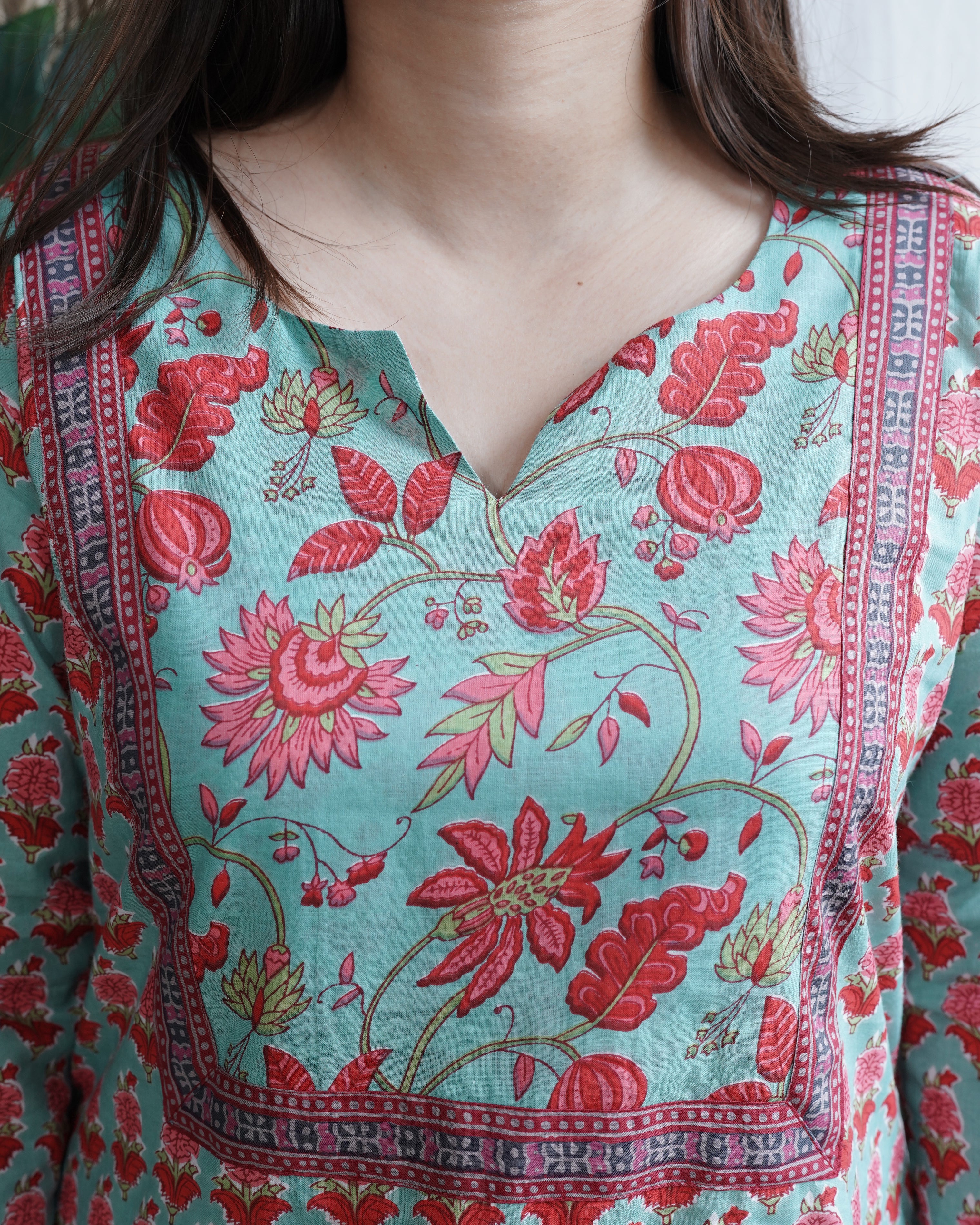 Sanganeri printed cotton kurta with border and yoke detailing on neck.