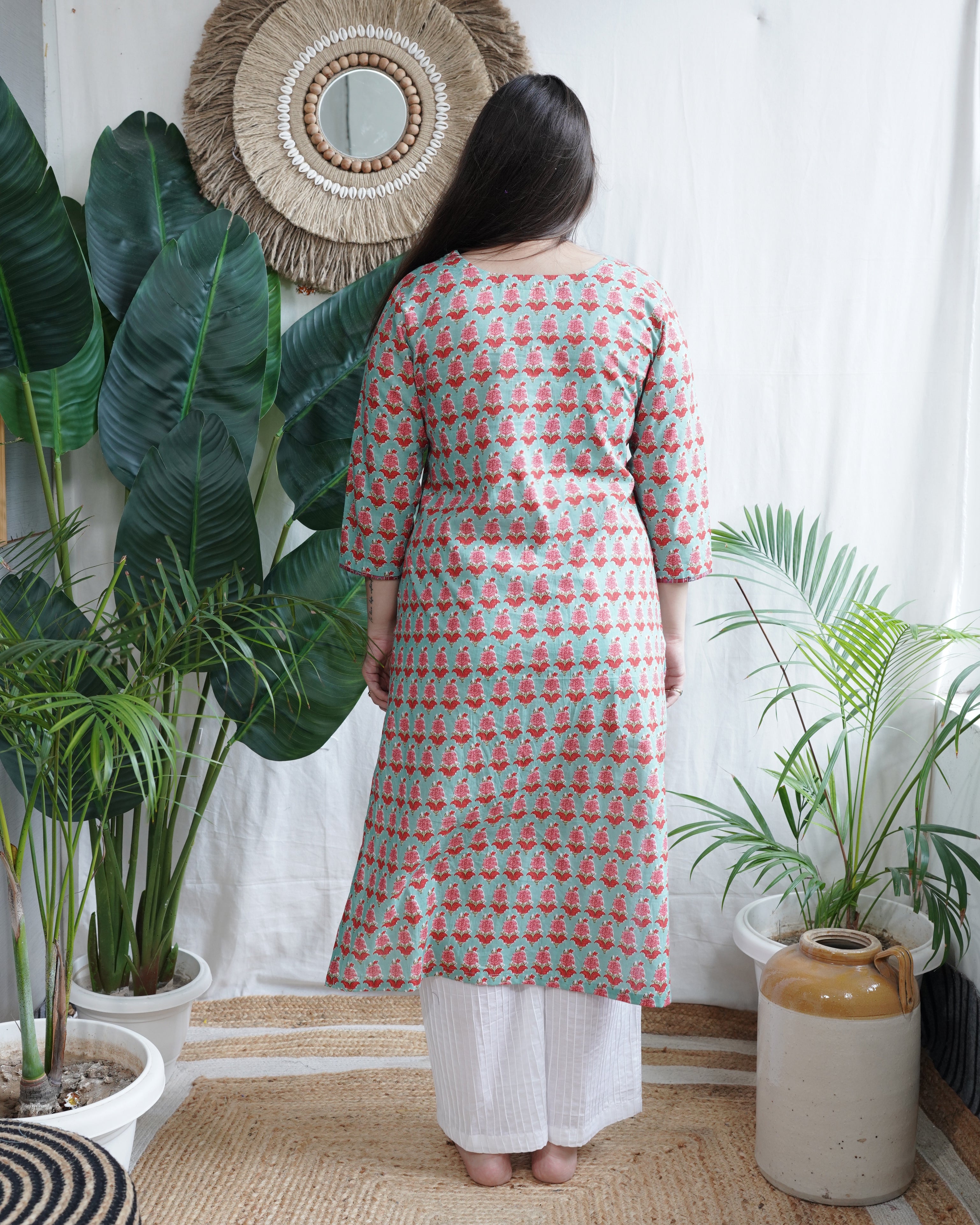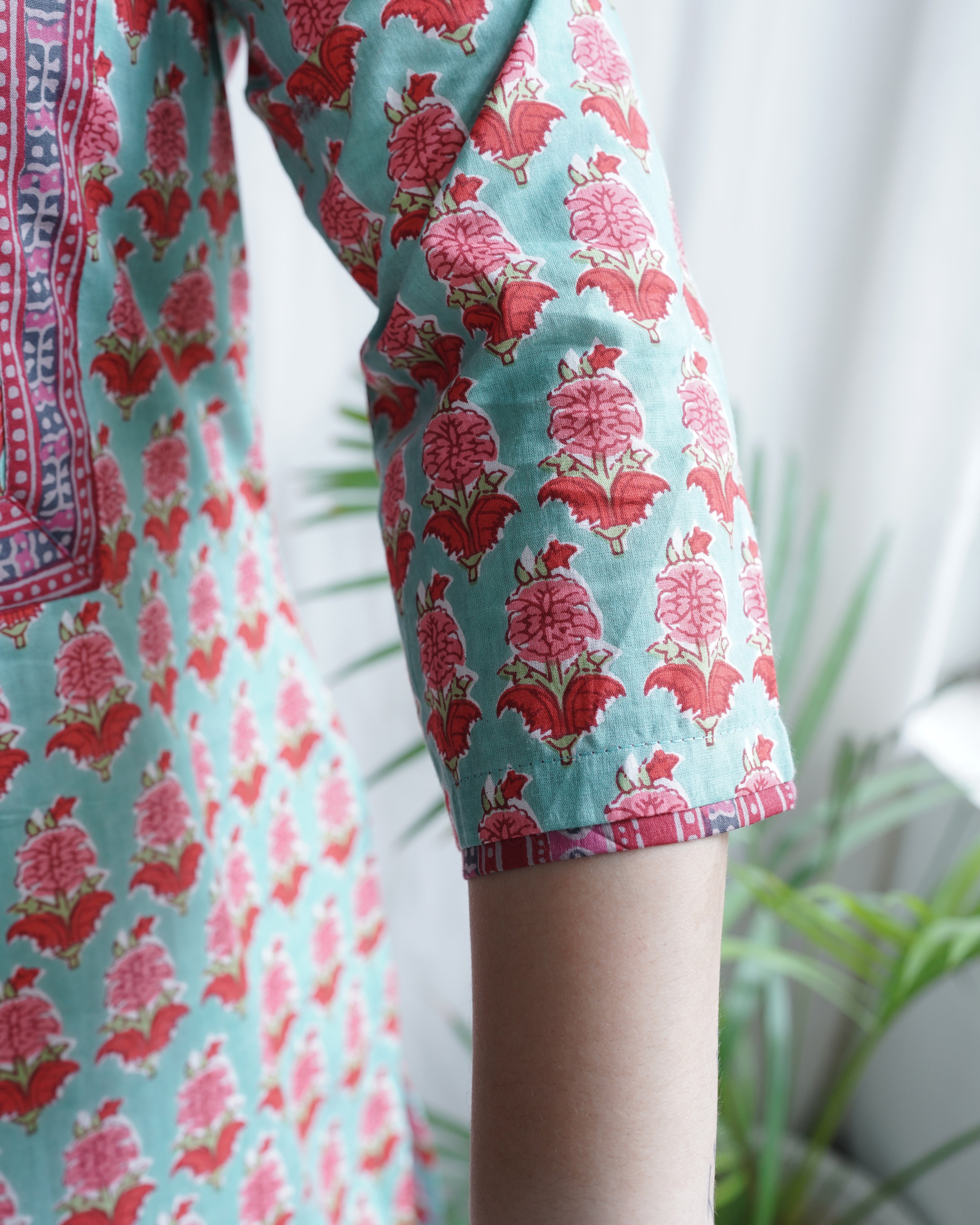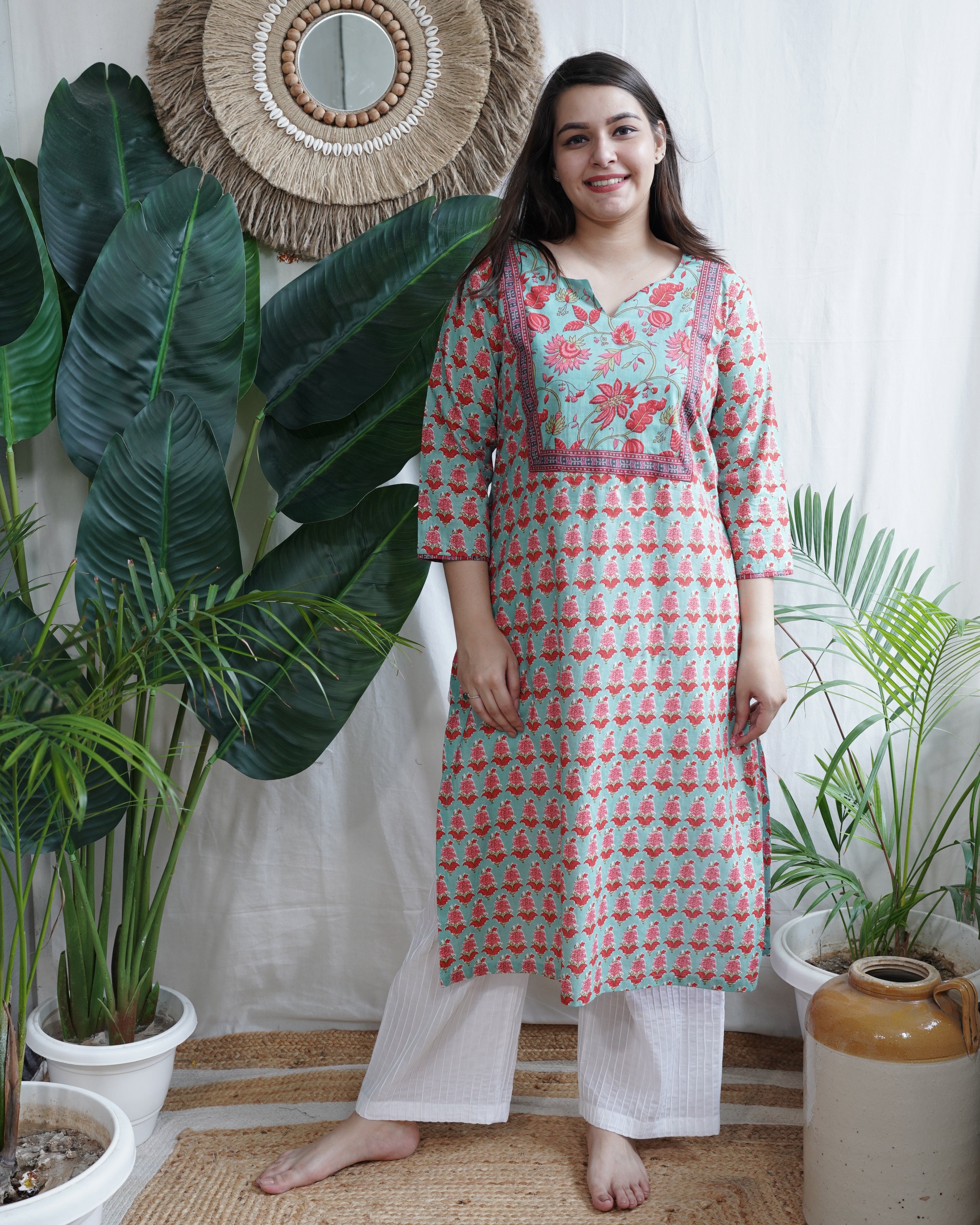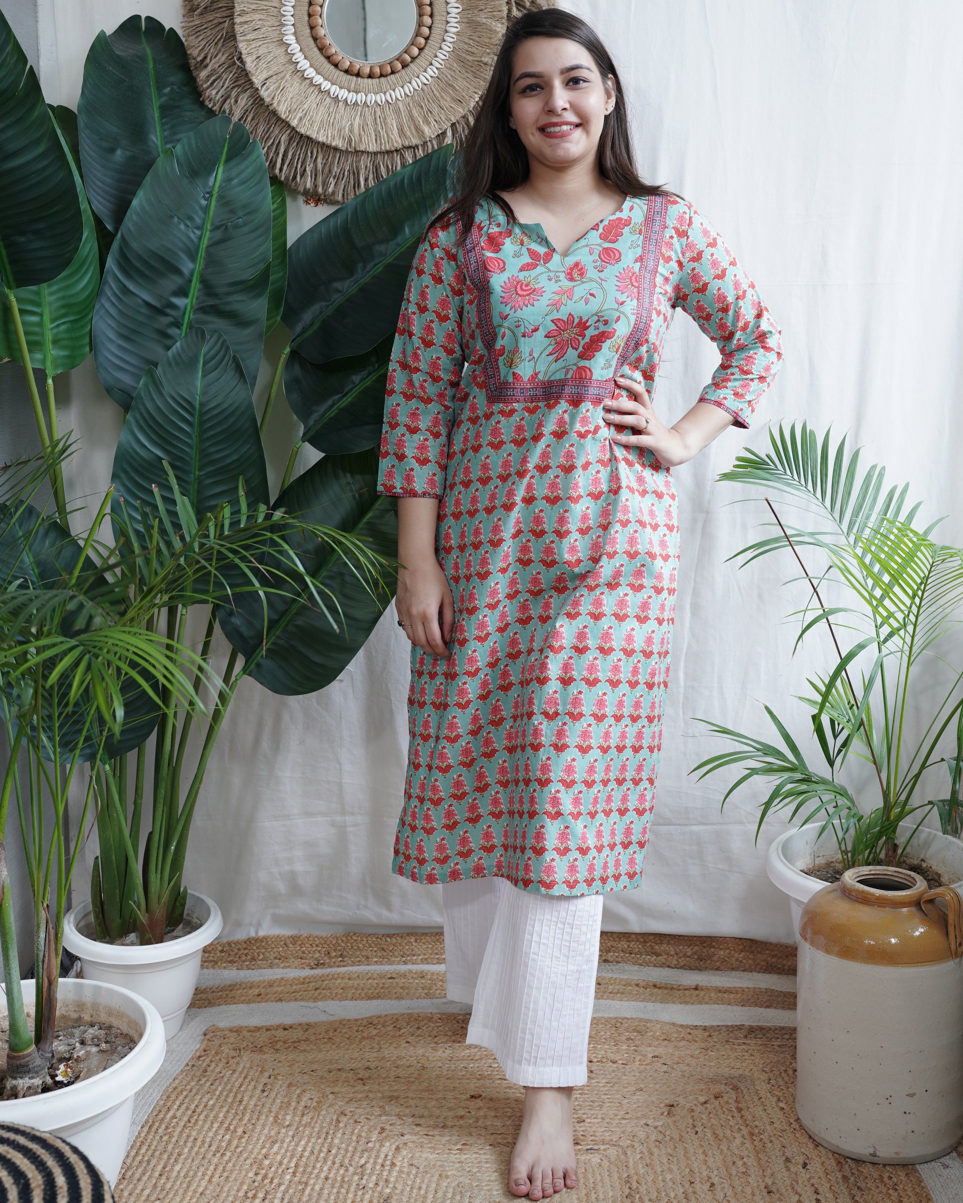 Sanganeri printed cotton kurta with border and yoke detailing on neck.