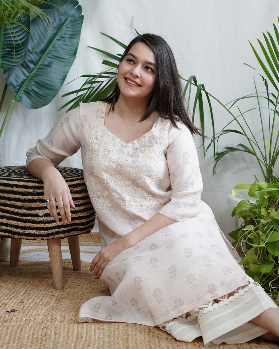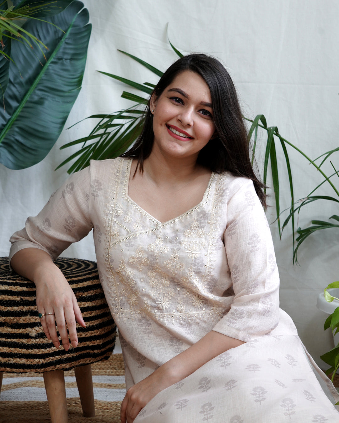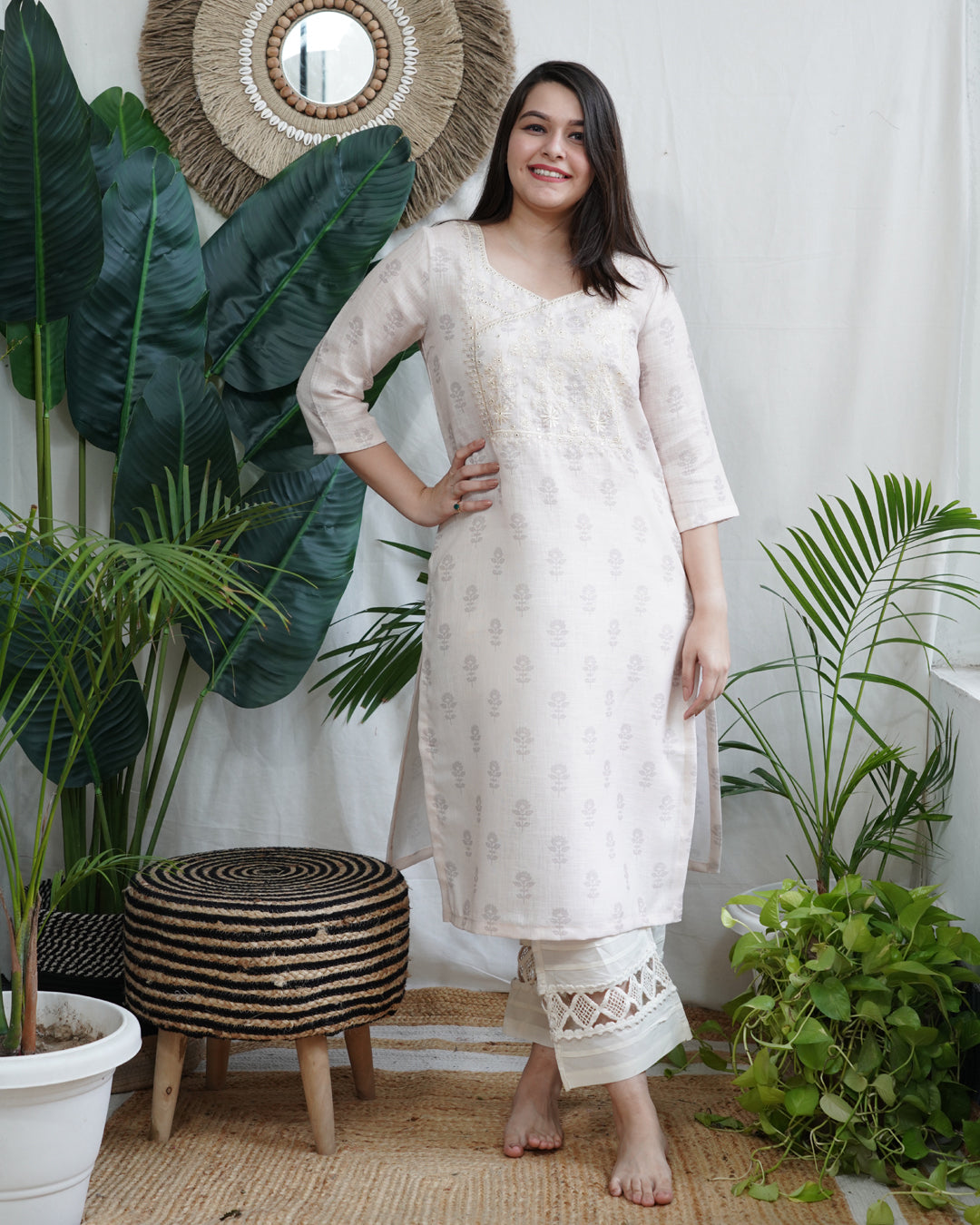 White kurti for women. Crafted in soft, breathable linen, this kurta features a straight silhouette with ¾ sleeves and side slits for all-day comfort and style.