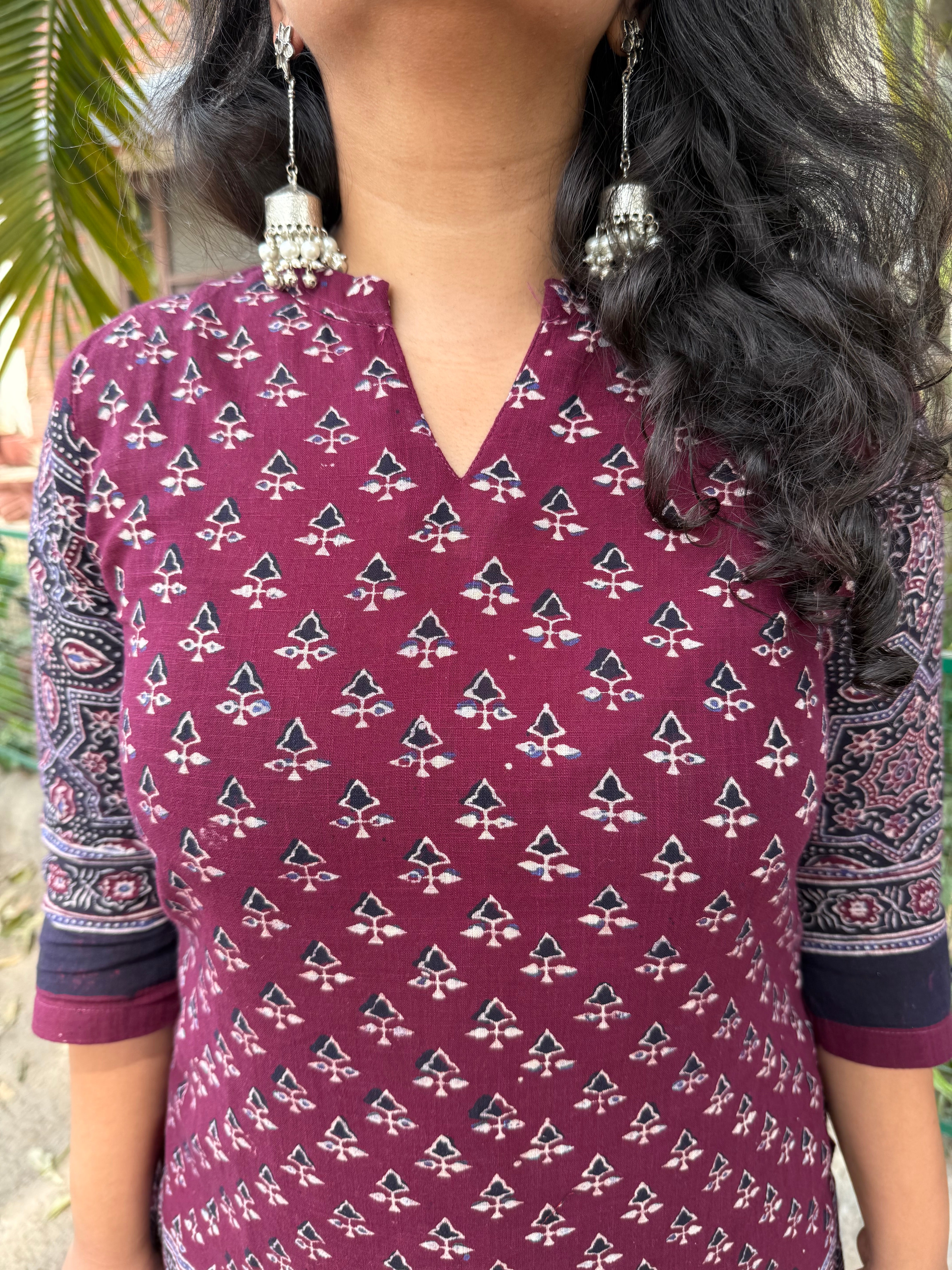 Elevate your everyday style with our handcrafted Ajrakh Yoke Kurti, featuring intricate block prints.