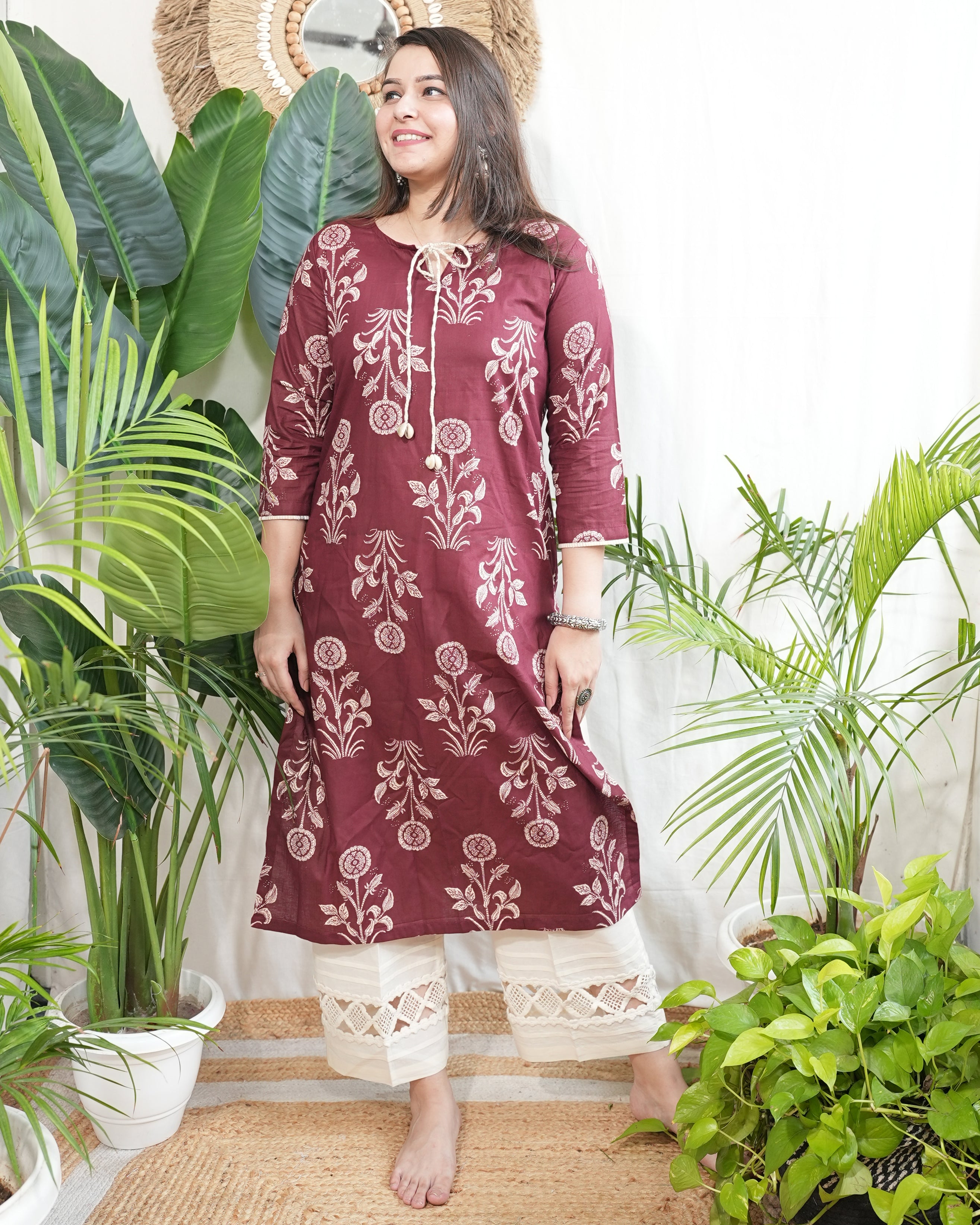 Sanganeri kurta with piping and kodhi detailing on neck.